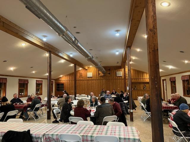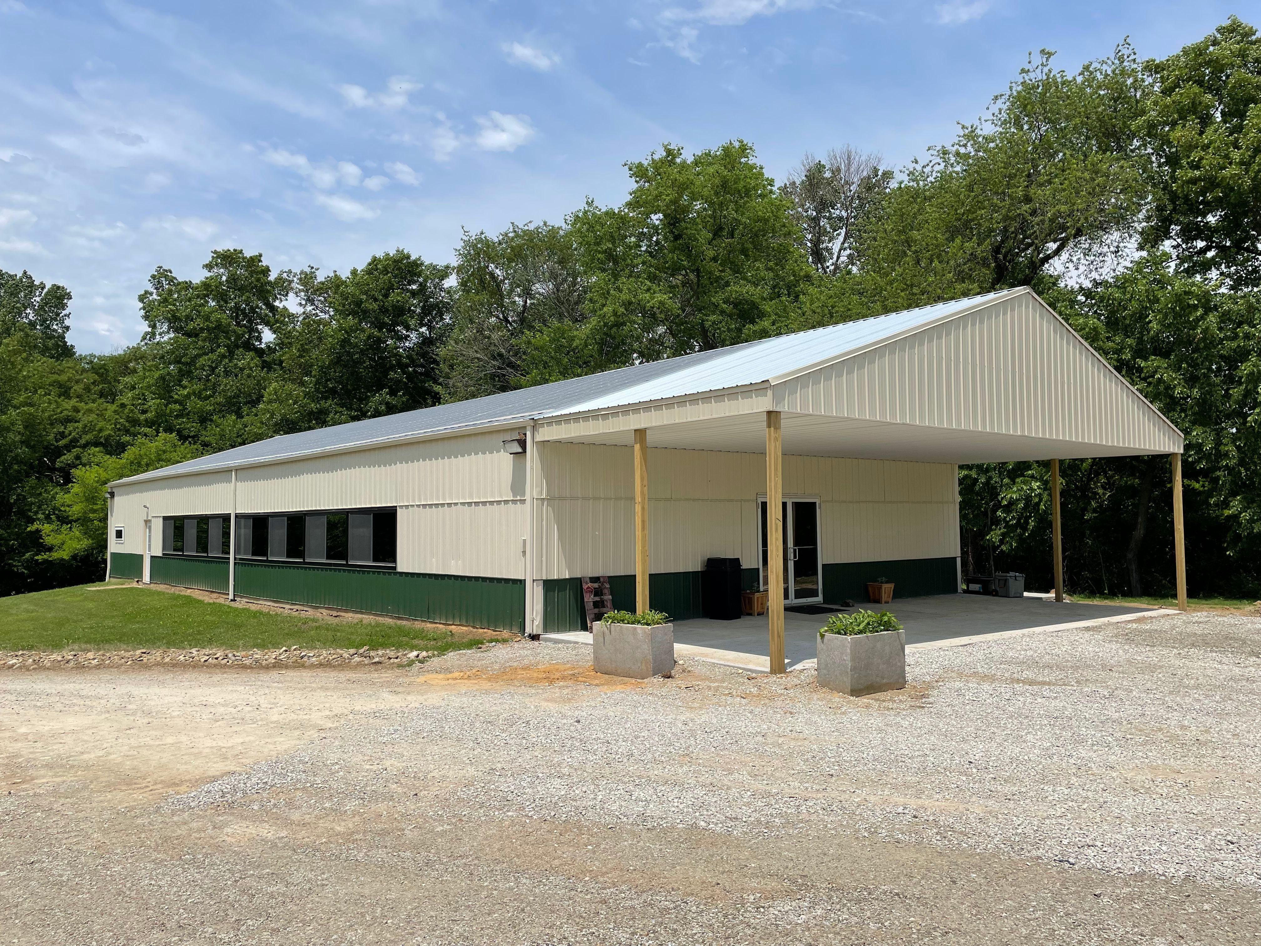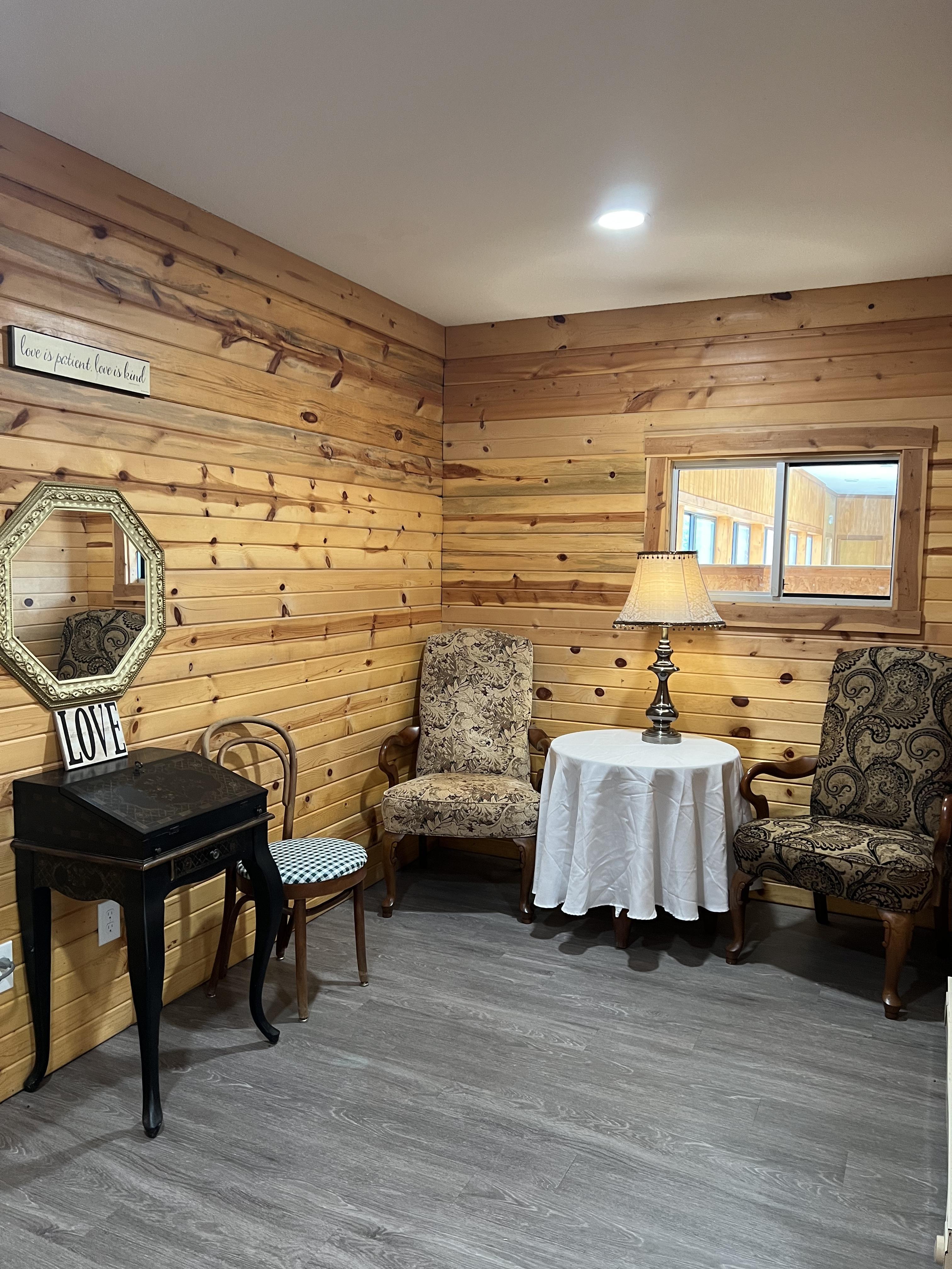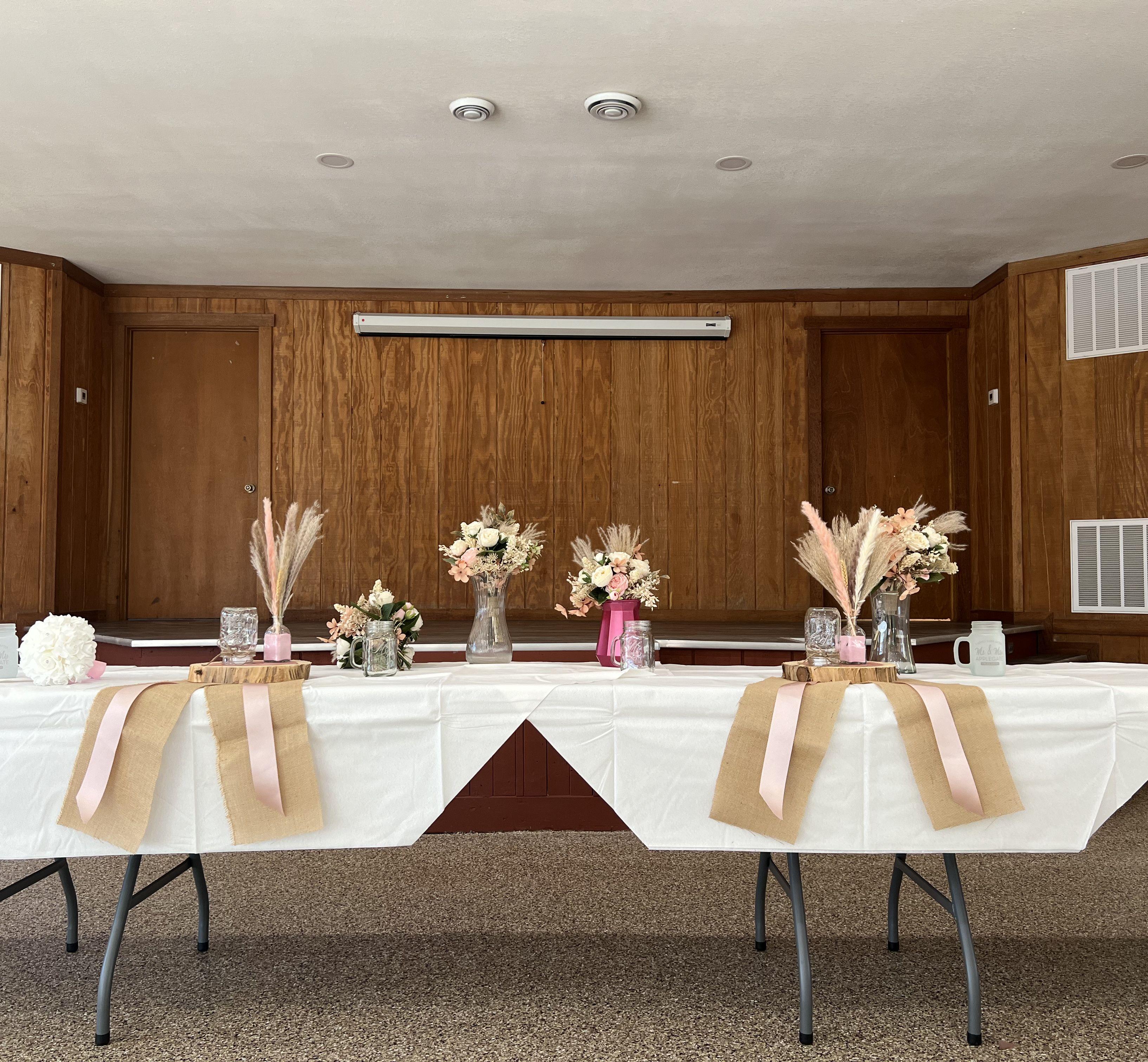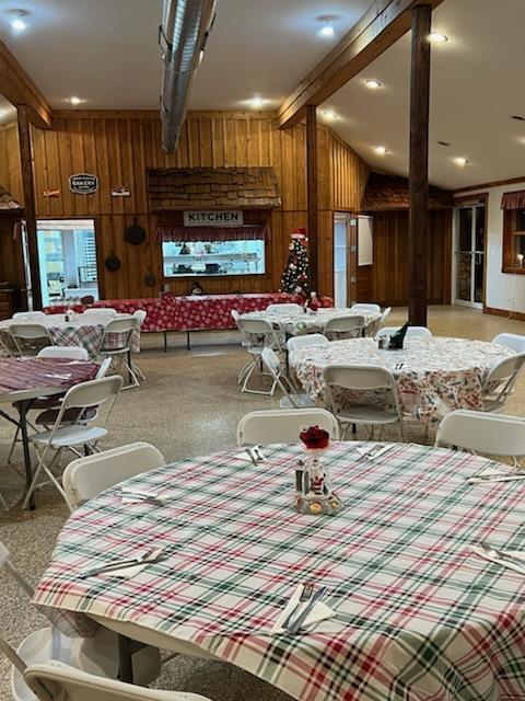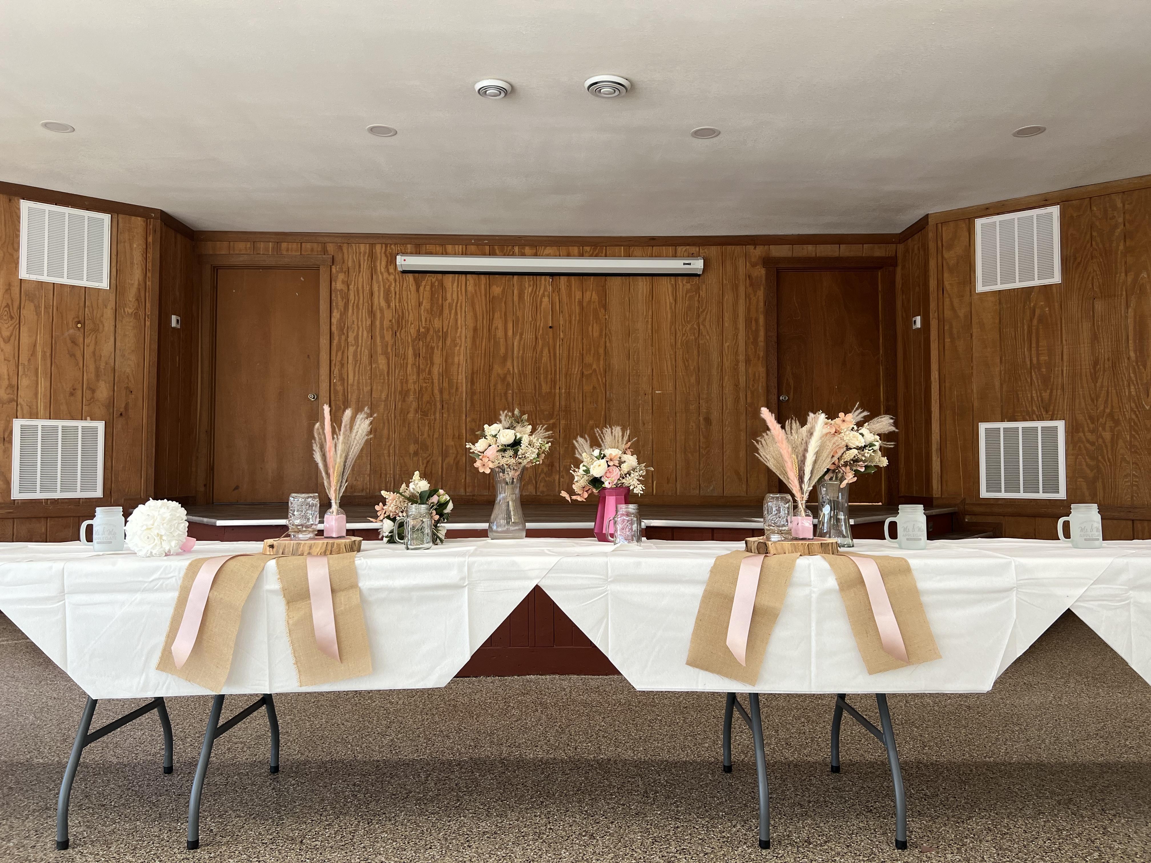 This space features a nearly 2500 square-foot indoor room. Has a buffet line convenient for feeding your guests. Also has a covered patio out the side door. We also have 16 cabins available to rent so all your guests can safely stay here.