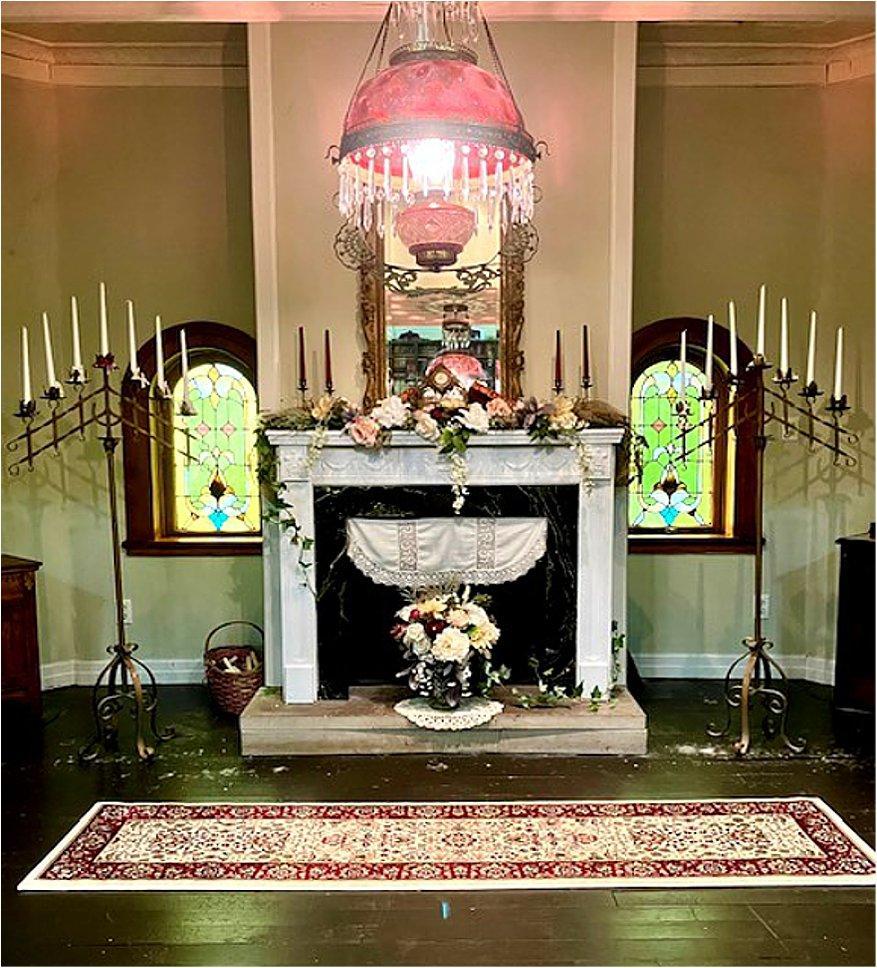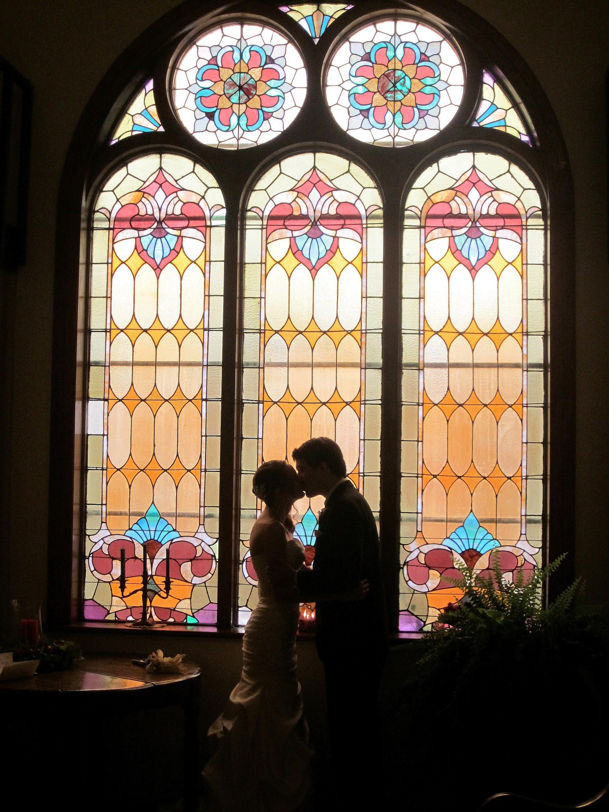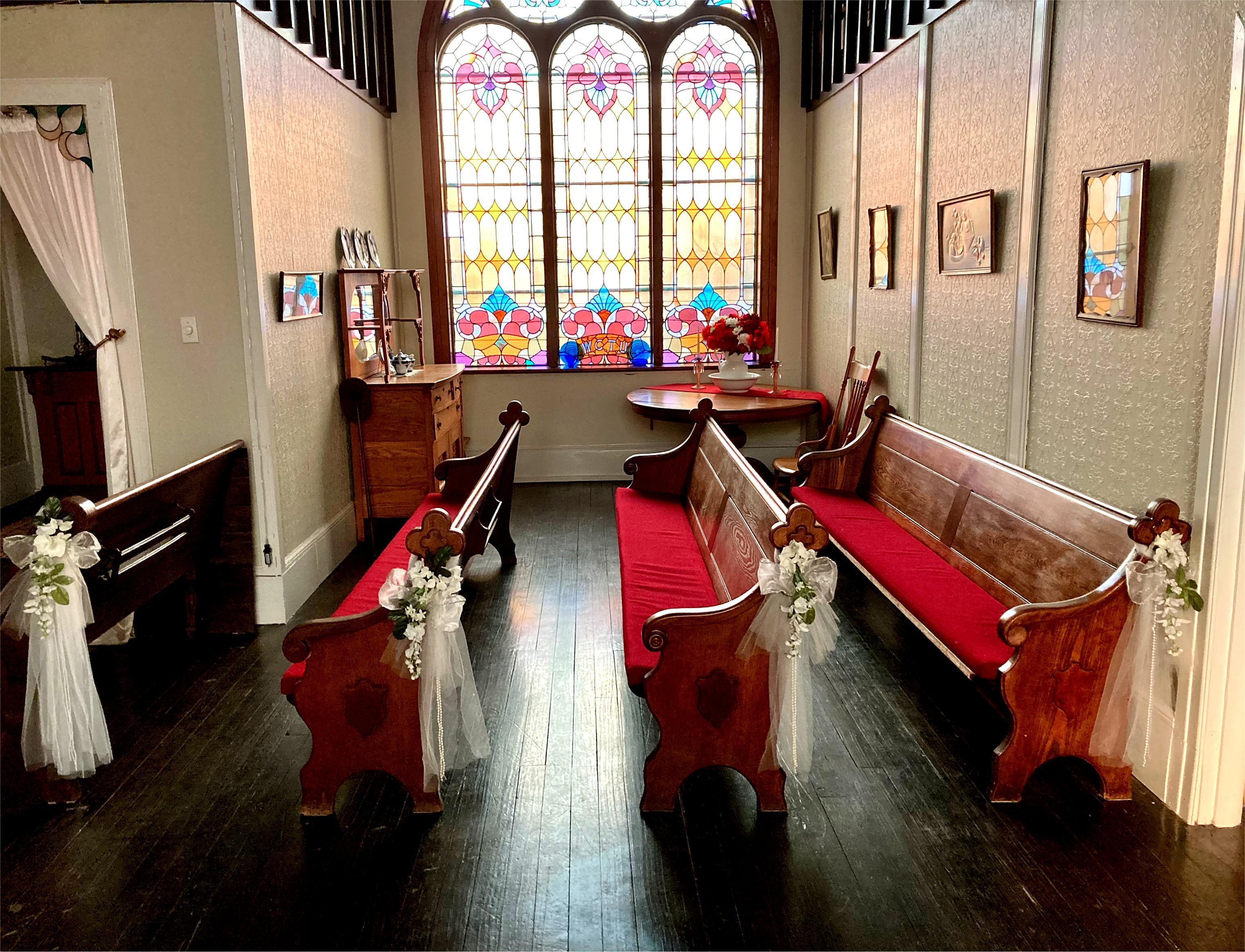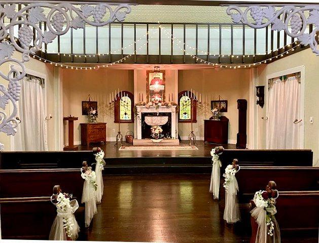 The Chapel's two 12' high original stained glass windows wash the room in a golden light. The antique oak pews are decorated with white silk flowers and the Altar has flowers, books and candles on the mantle. Vintage candle stands flank the fireplace. Your photographer will love it! There are so many photo ops, everywhere you look. There are changing rooms for the Brides & Grooms also.