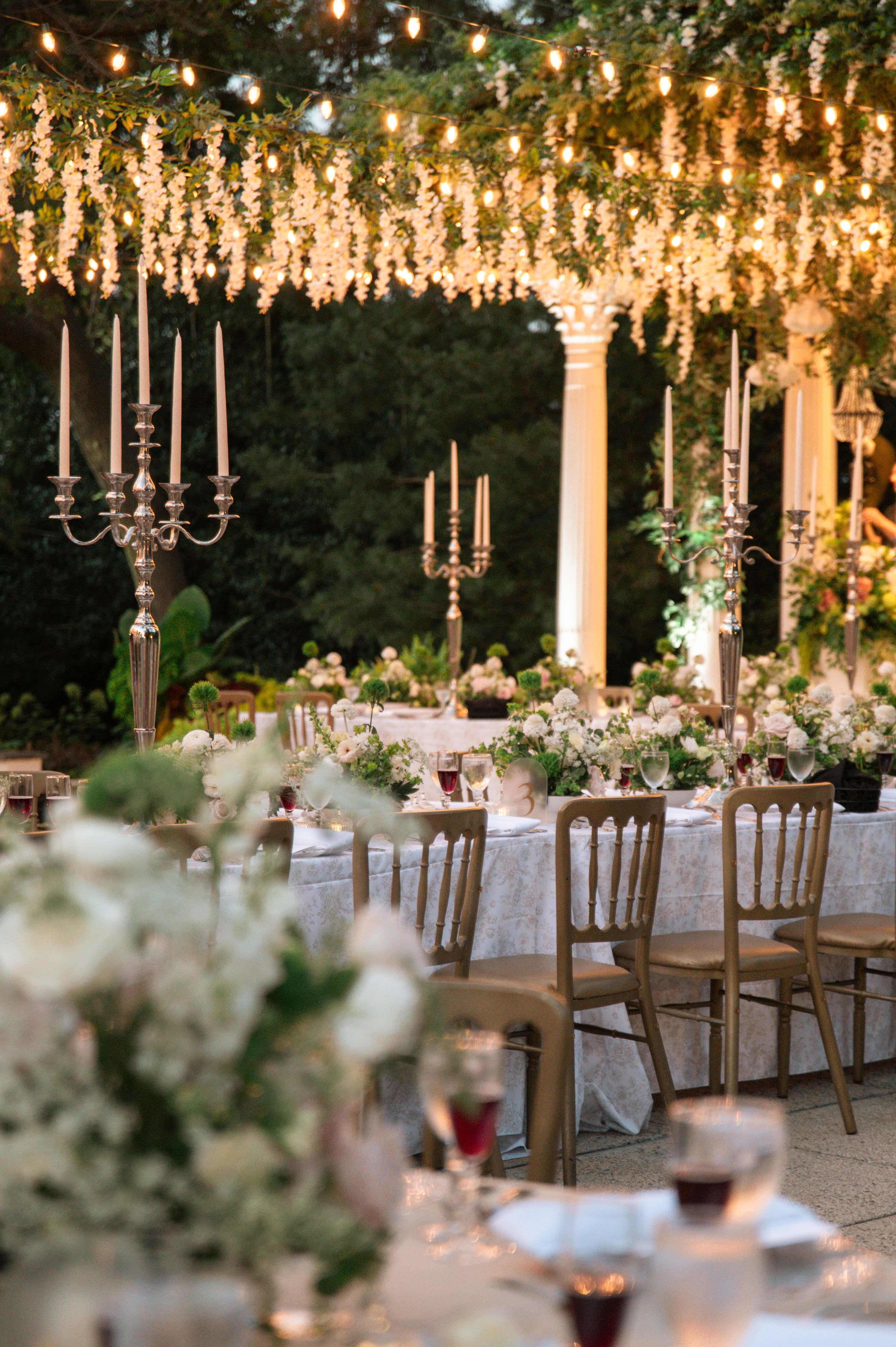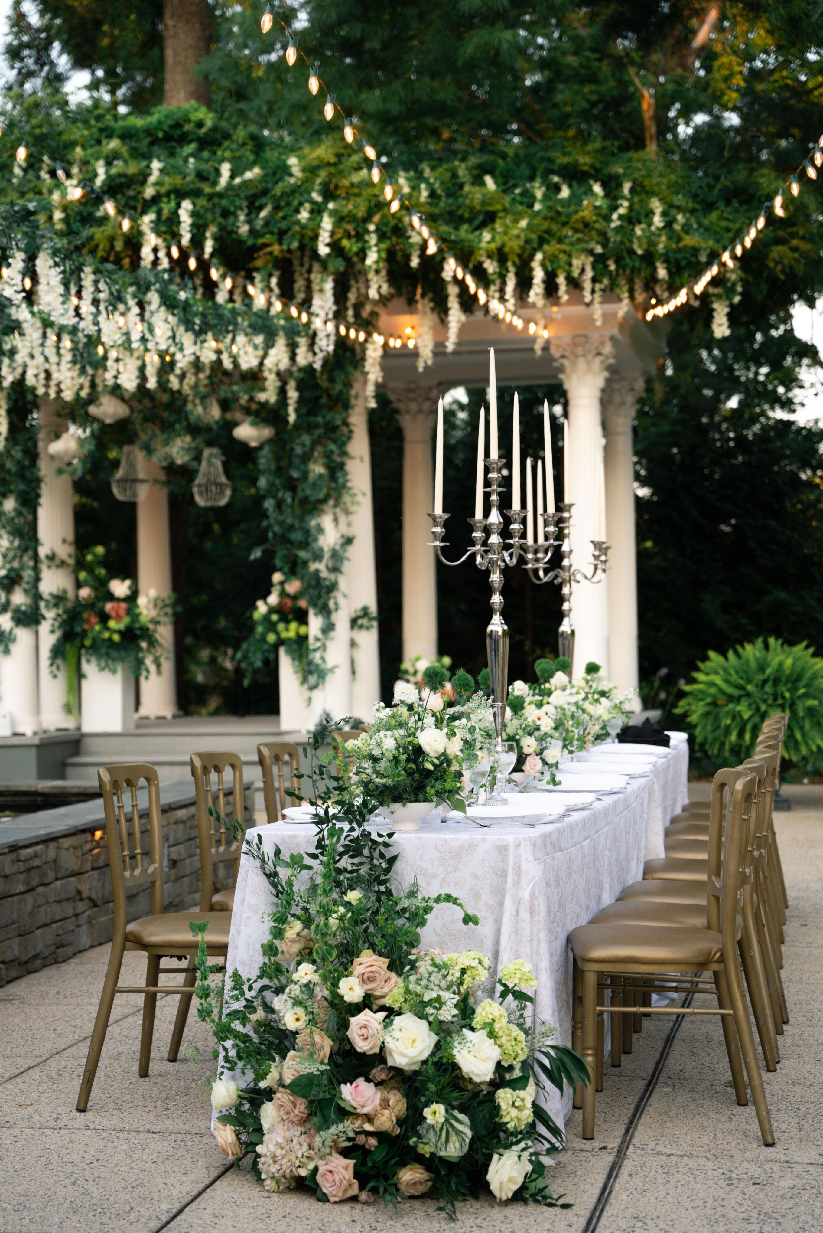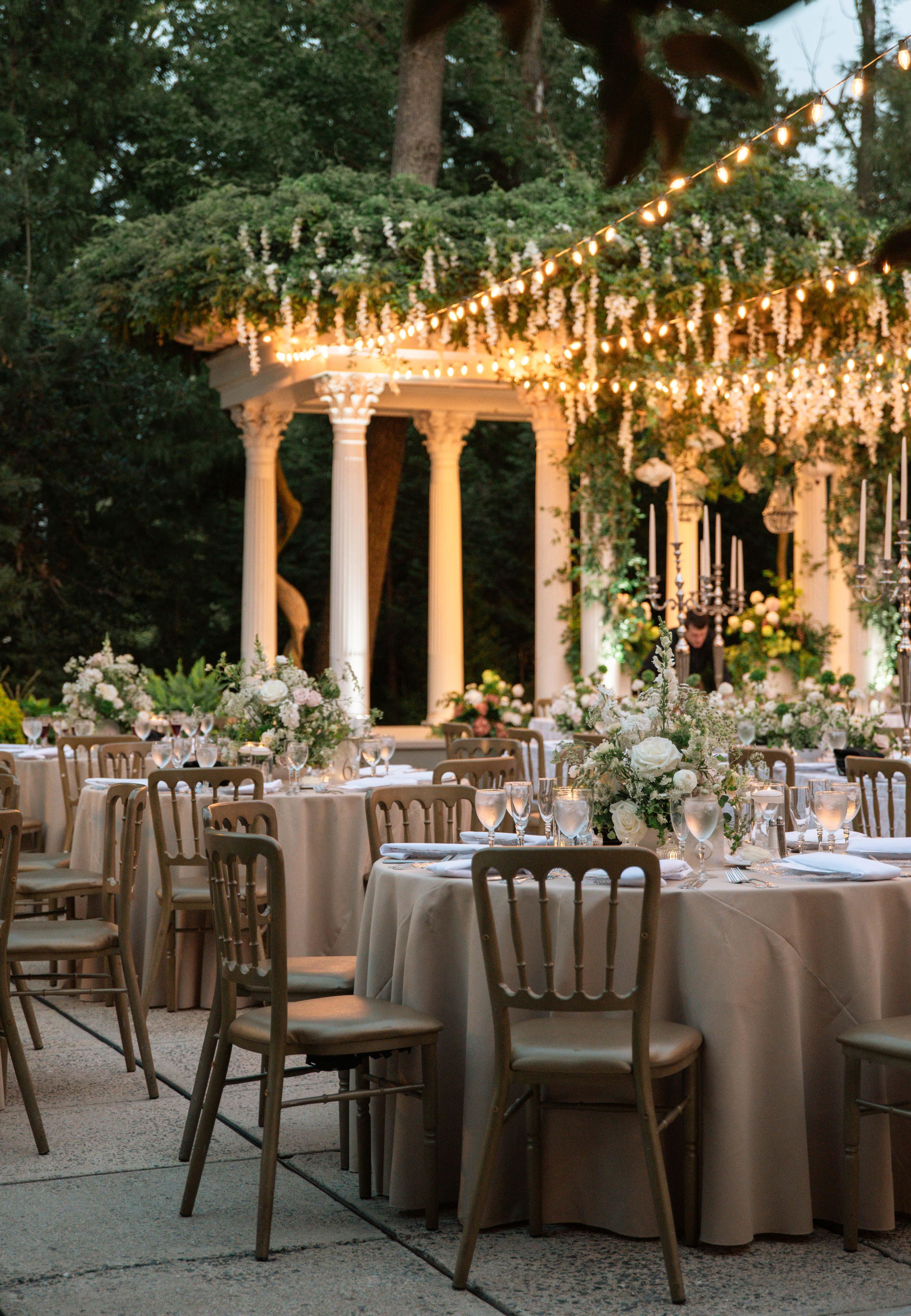 - Wisteria-covered Pergola - Reflecting pond - Beautiful garden area - Tables and linens - White ceremony chairs