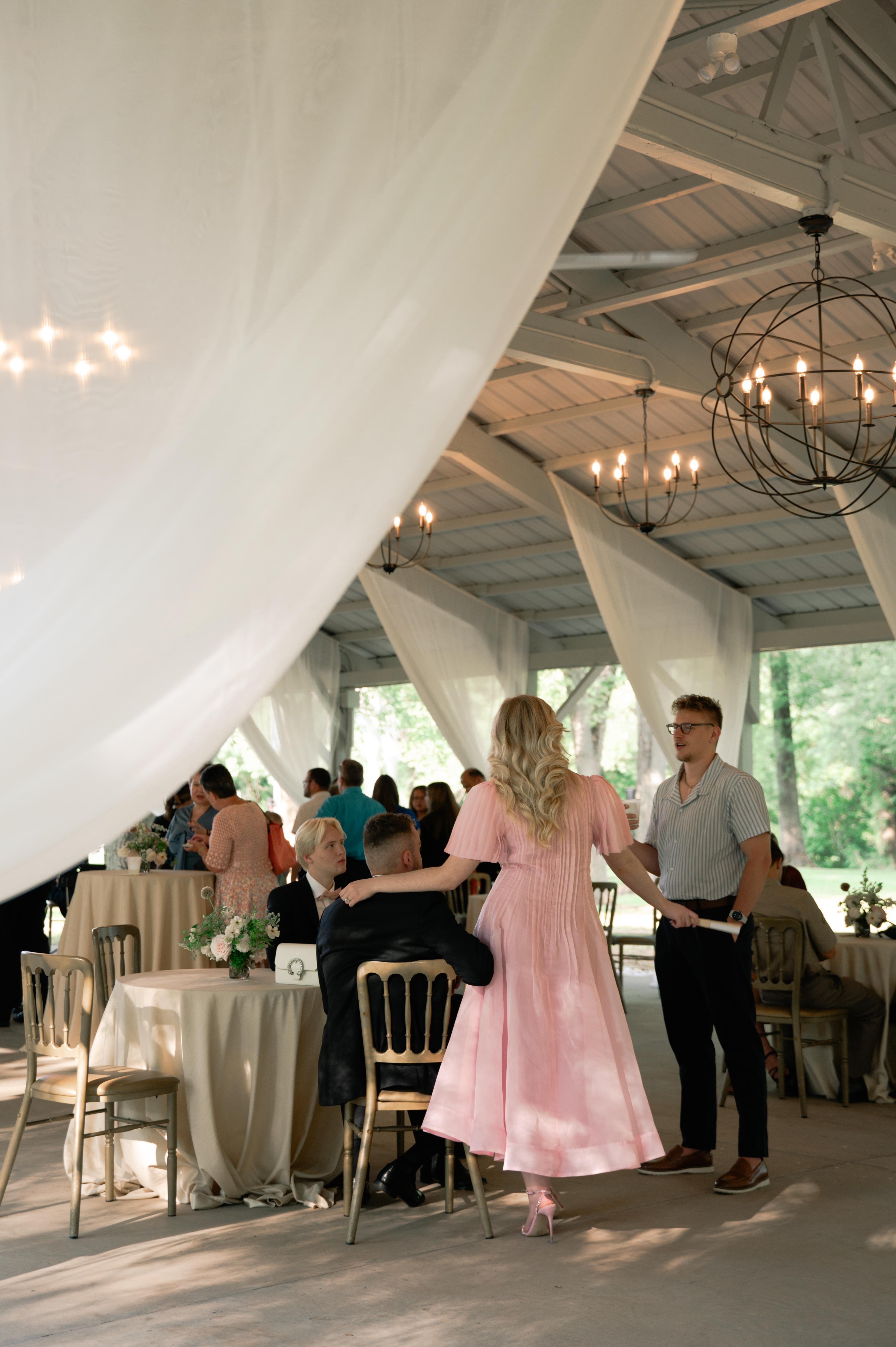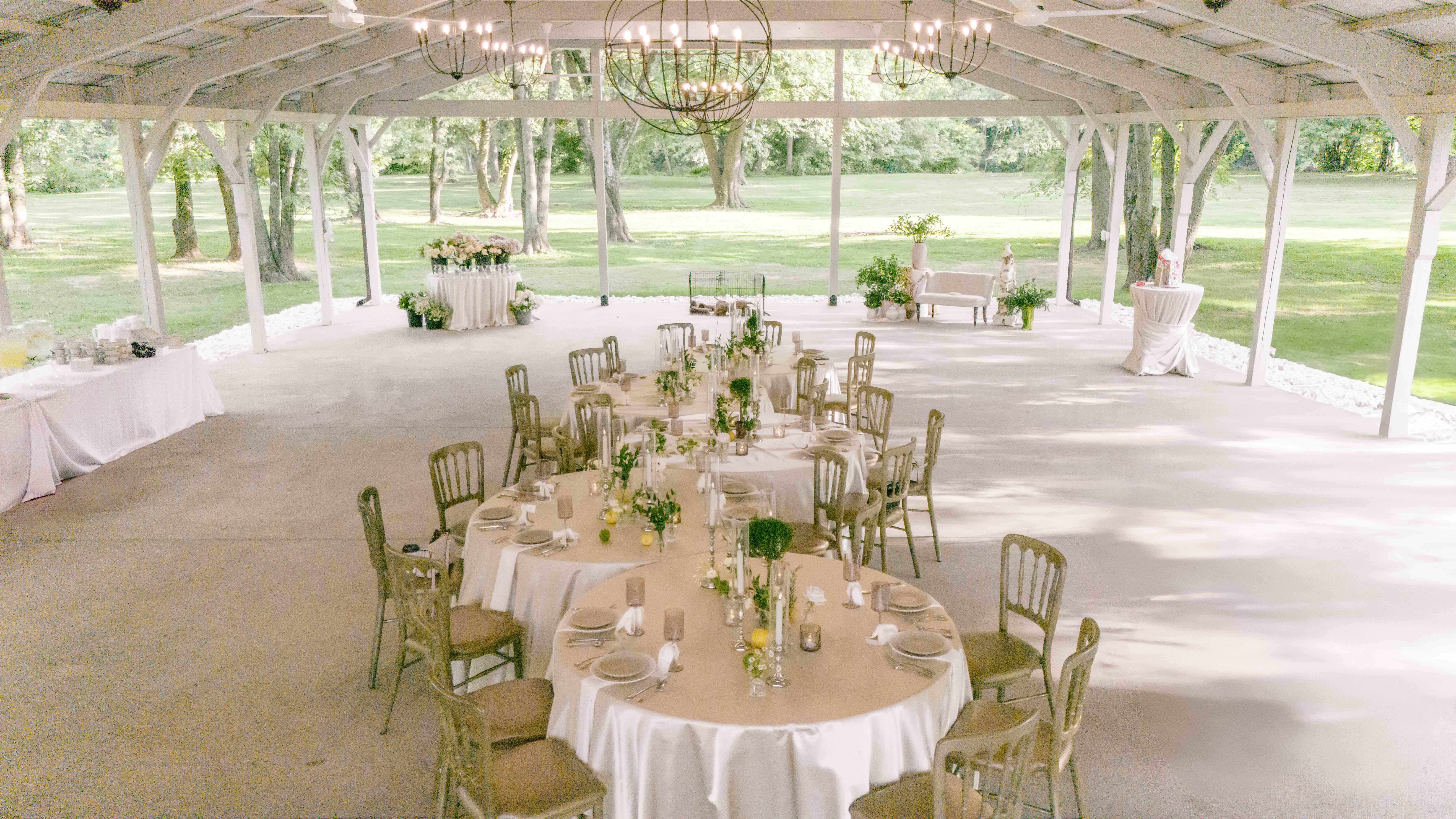 • Crossback chairs & tables • Elegant chandeliers & pin lighting • Overhead ceiling fans for comfort • Covered pavilion with market lights • Optional clear side walls for weather protection • Surrounded by riverside gardens & open lawns • Can also add-on heating and cooling units Perfect for outdoor ceremonies & receptions with natural charm and flexibility.