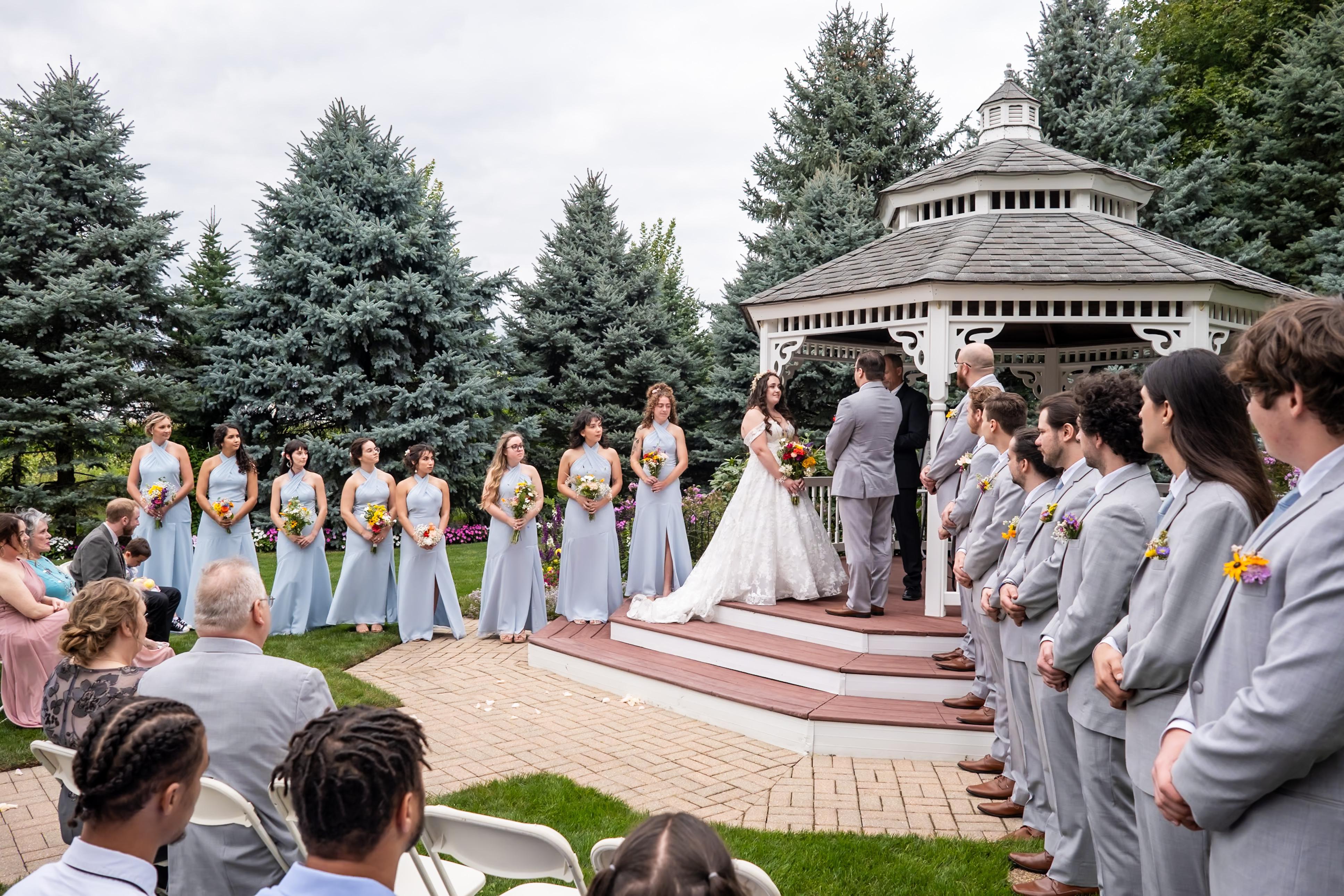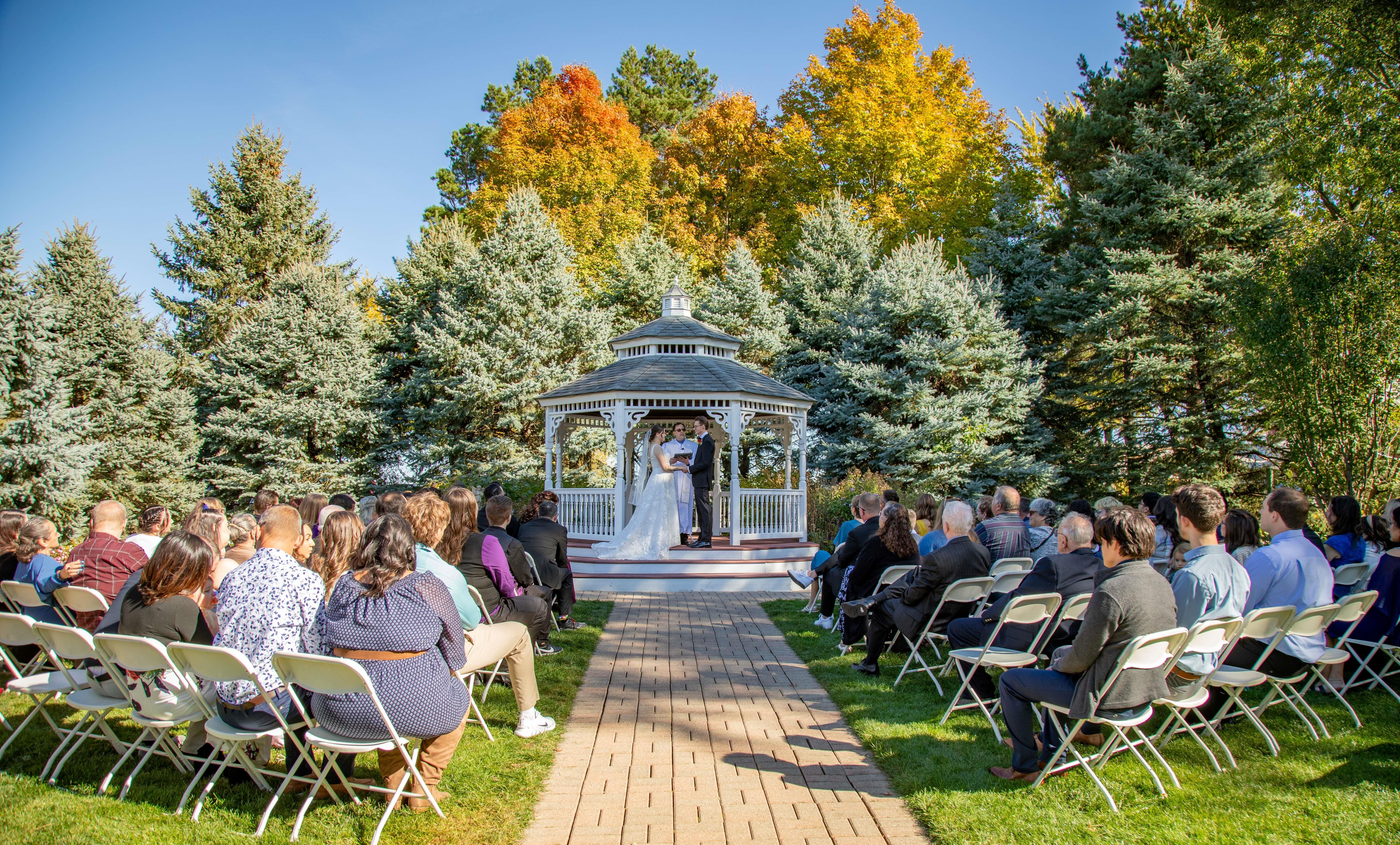 Spring-fall, our garden gazebo is tucked away, creating a tranquil place to host your wedding ceremony. The brick path from the bridal suite to the top steps, allows you to walk the paved path to your ceremony.
