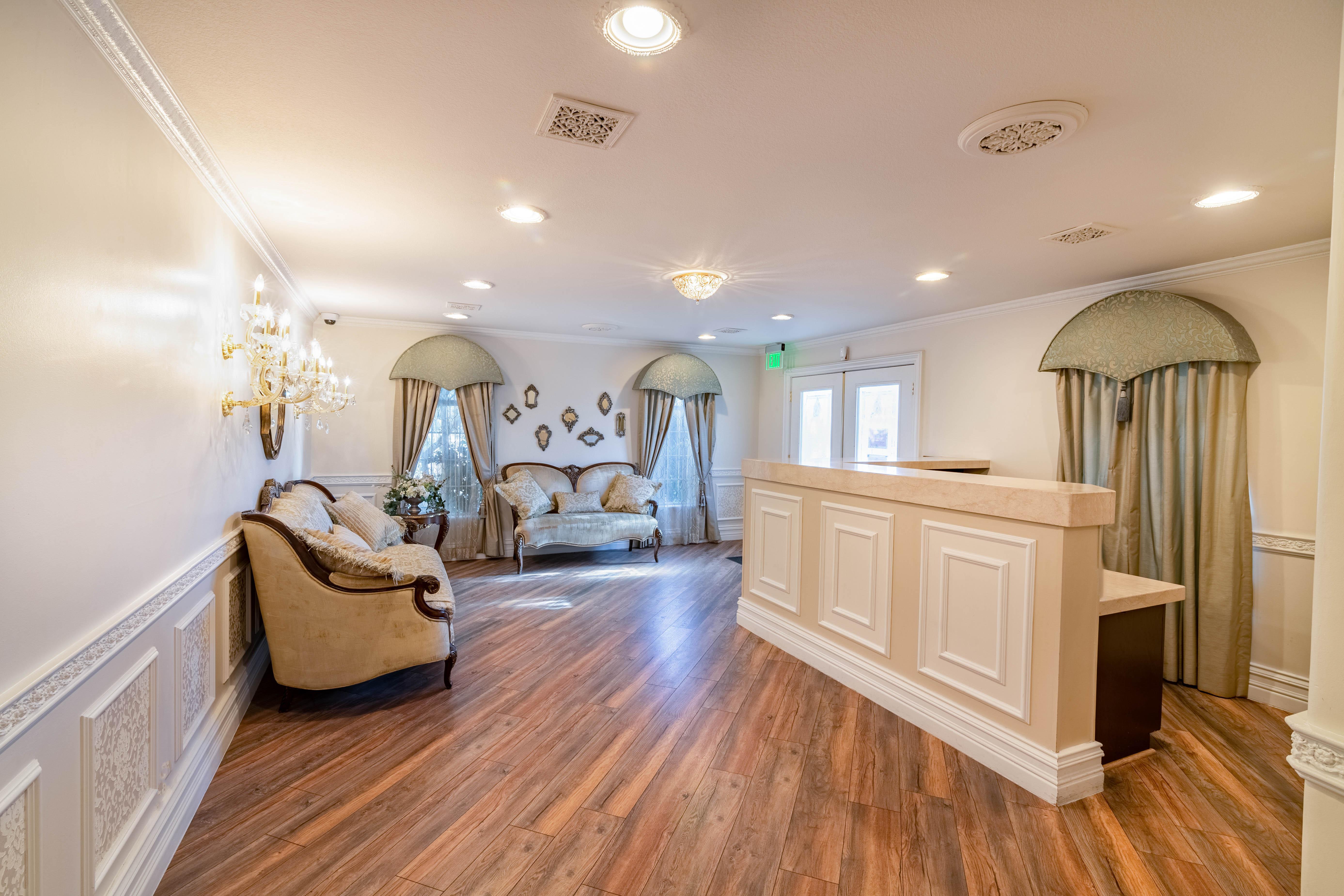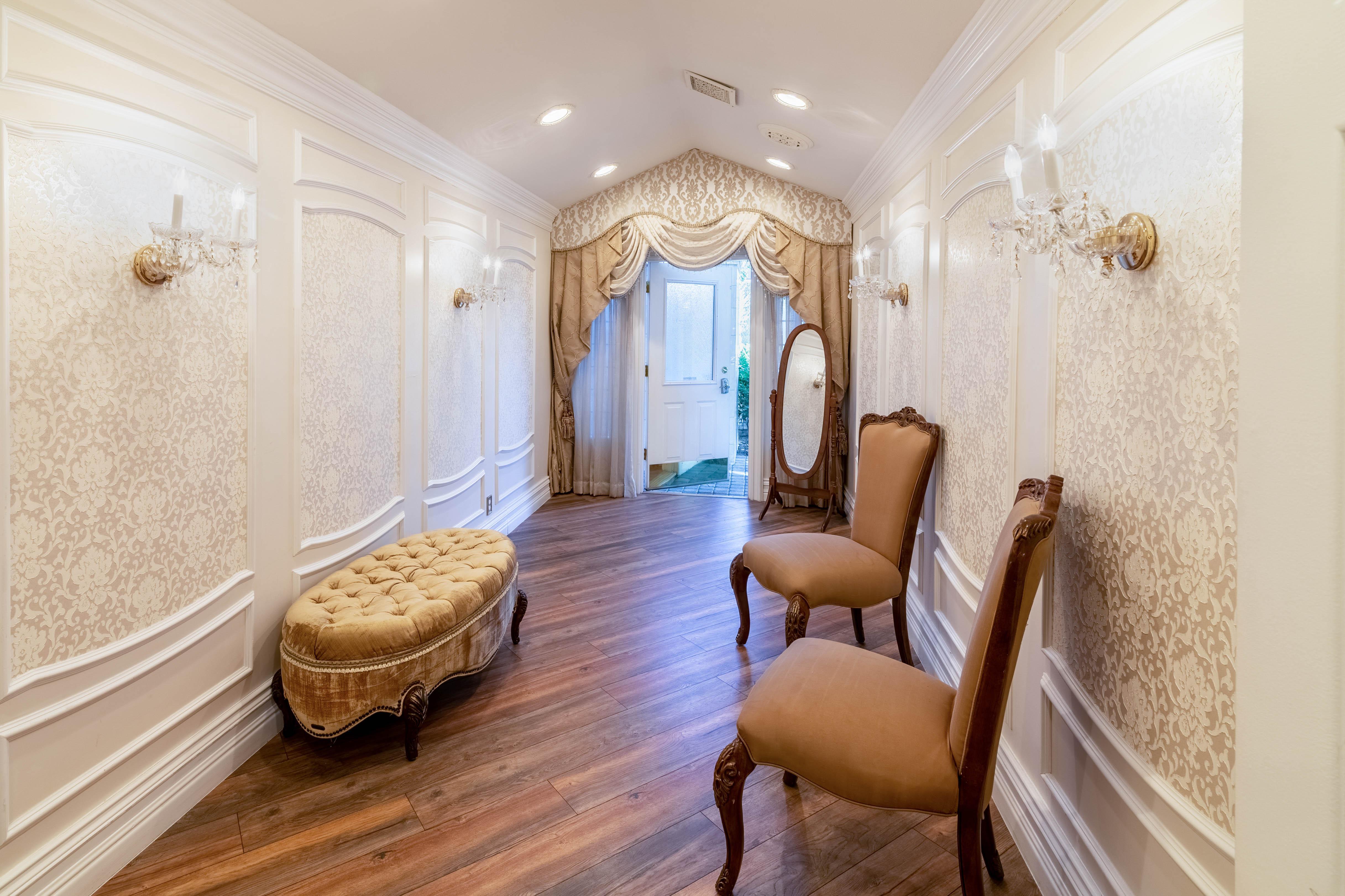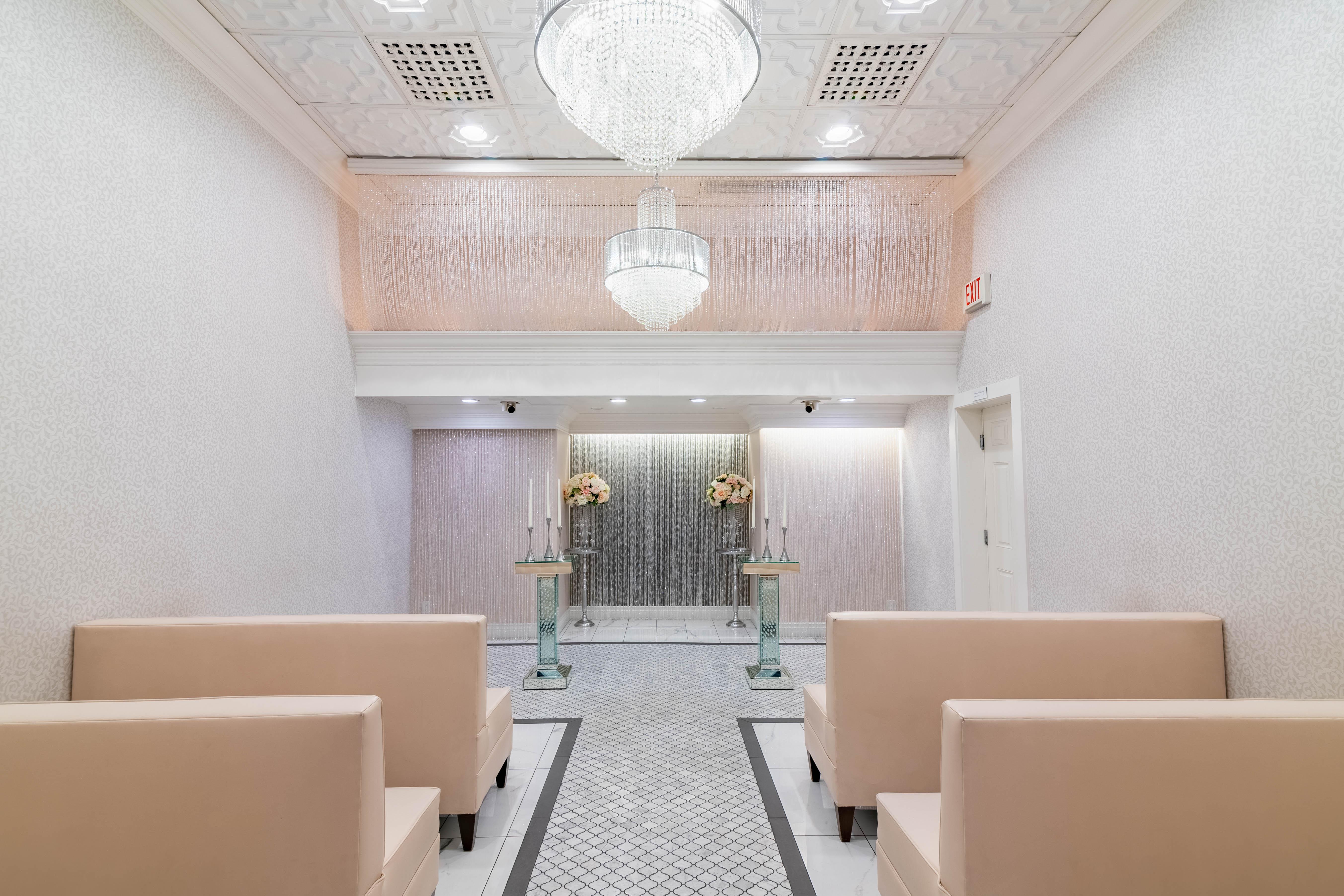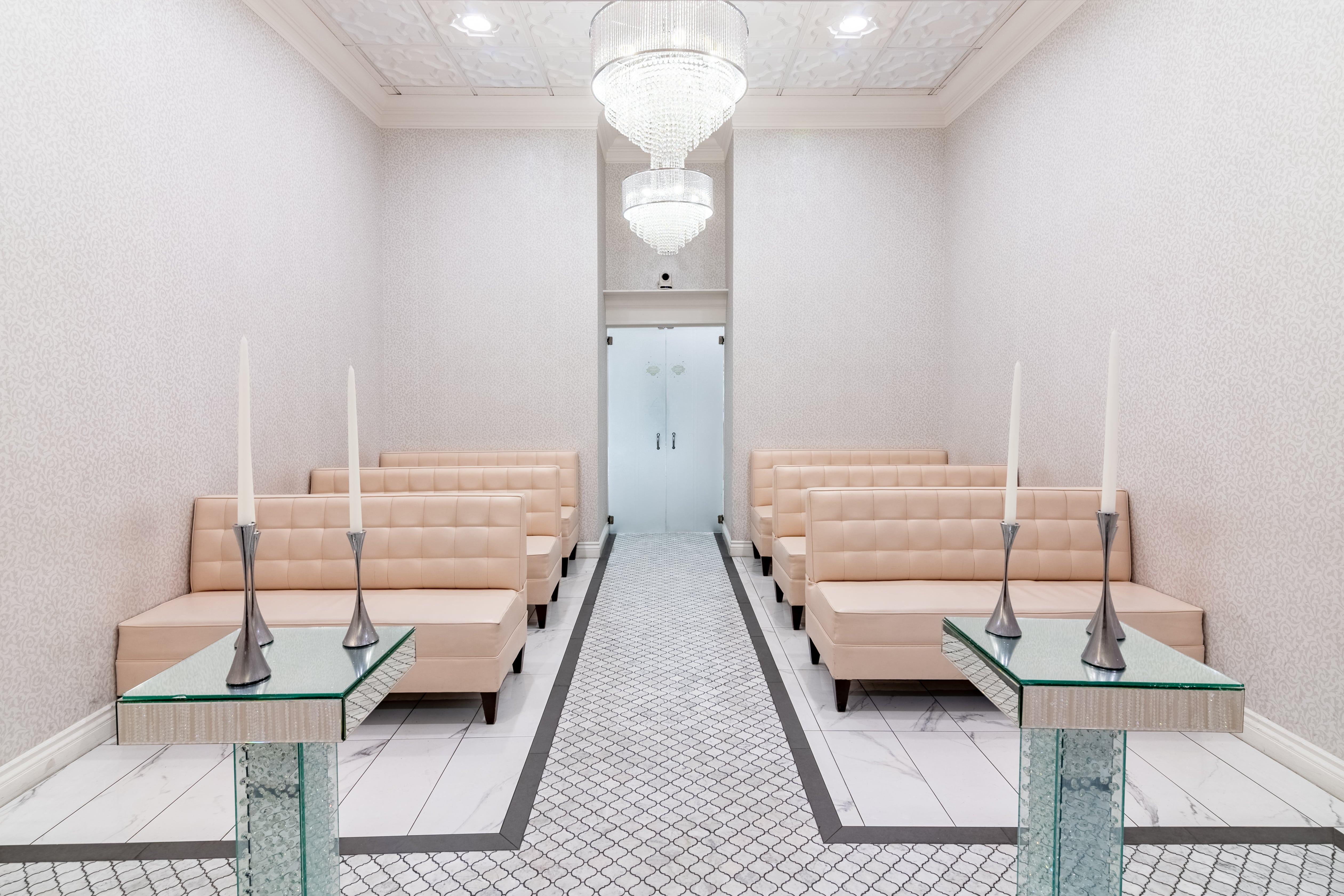 - Private Lobby - Private Bridal Suite - Restroom - 3 Wall Mounted Cameras for Videography - Crystal Chandeliers