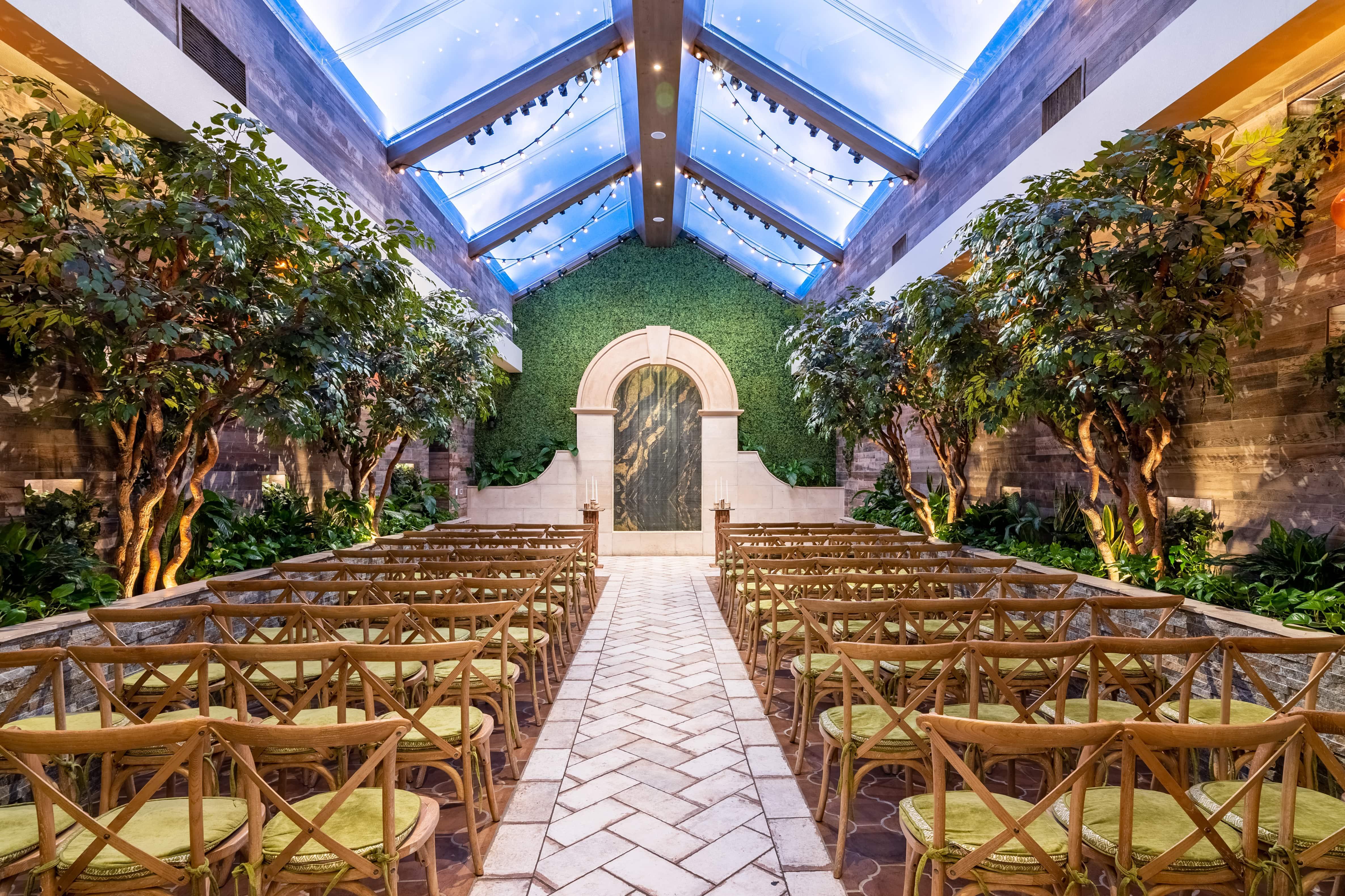 The Glass Gardens Wedding Chapel is designed for couples who want a sophisticated, intimate outdoor Las Vegas ceremony with the comfort and peace of mind that only a climate-controlled environment provides. Ensuring you and your guests are completely comfortable – even during the hot summer months. This state-of-the-art Las Vegas garden chapel will delight any couple who desires an upscale garden wedding for a fraction of the cost. The customizable ceiling offers 3 sky settings