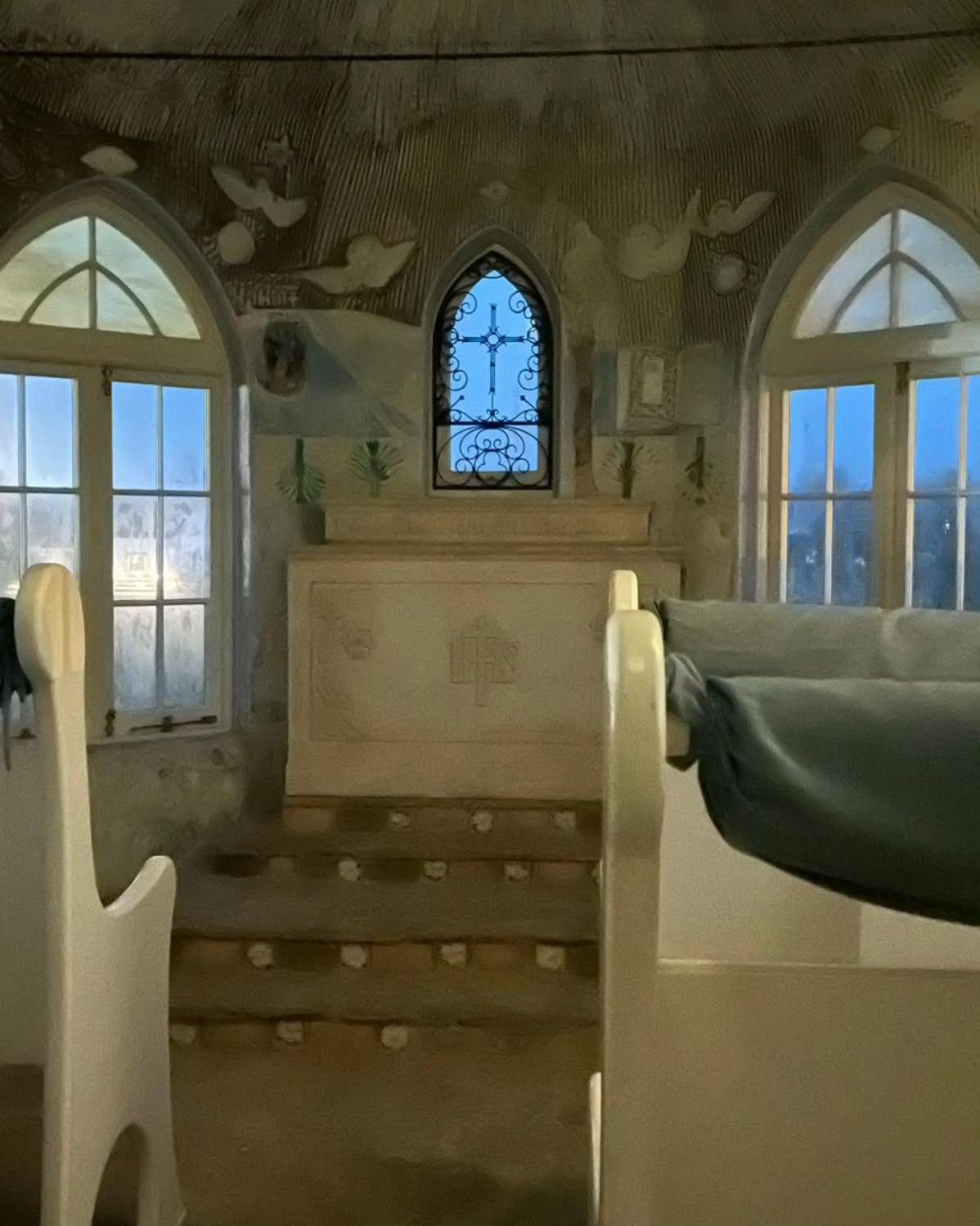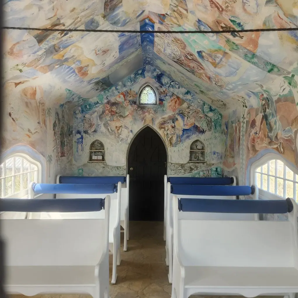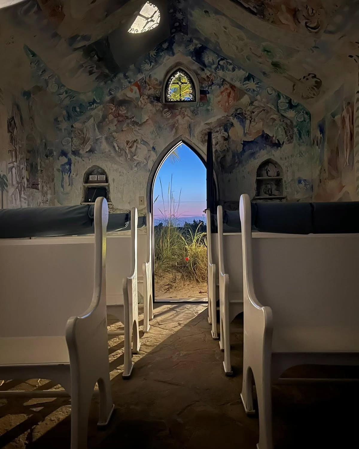 The venue features the intimate, historic Chapel on the Dunes structure itself, designed specifically for sacred wedding ceremonies and elopements. This iconic space offers a charming, timeless atmosphere with its unique architecture and hand-painted artistry. Though designed for an exclusive gathering, the chapel provides a profound sense of connection and spirituality. Outside, the property is defined by its elevated position, offering expansive, panoramic vistas of the Gulf of Mexico and surrounding coastline. Couples utilize the flagstone path and exterior grounds for striking photography sessions, leveraging the incredible natural light and sweeping views for their event.