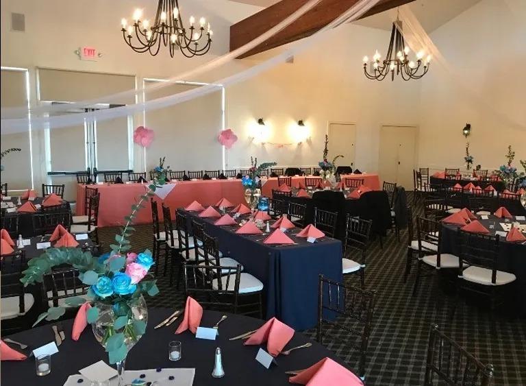 Includes Dinner, invitations, DJ & MC, Congratulations Toast, Appetizers, wine with dinner, centerpieces, guest book, hosted cocktail hour, wedding cake, foursome of golf, celebration package.