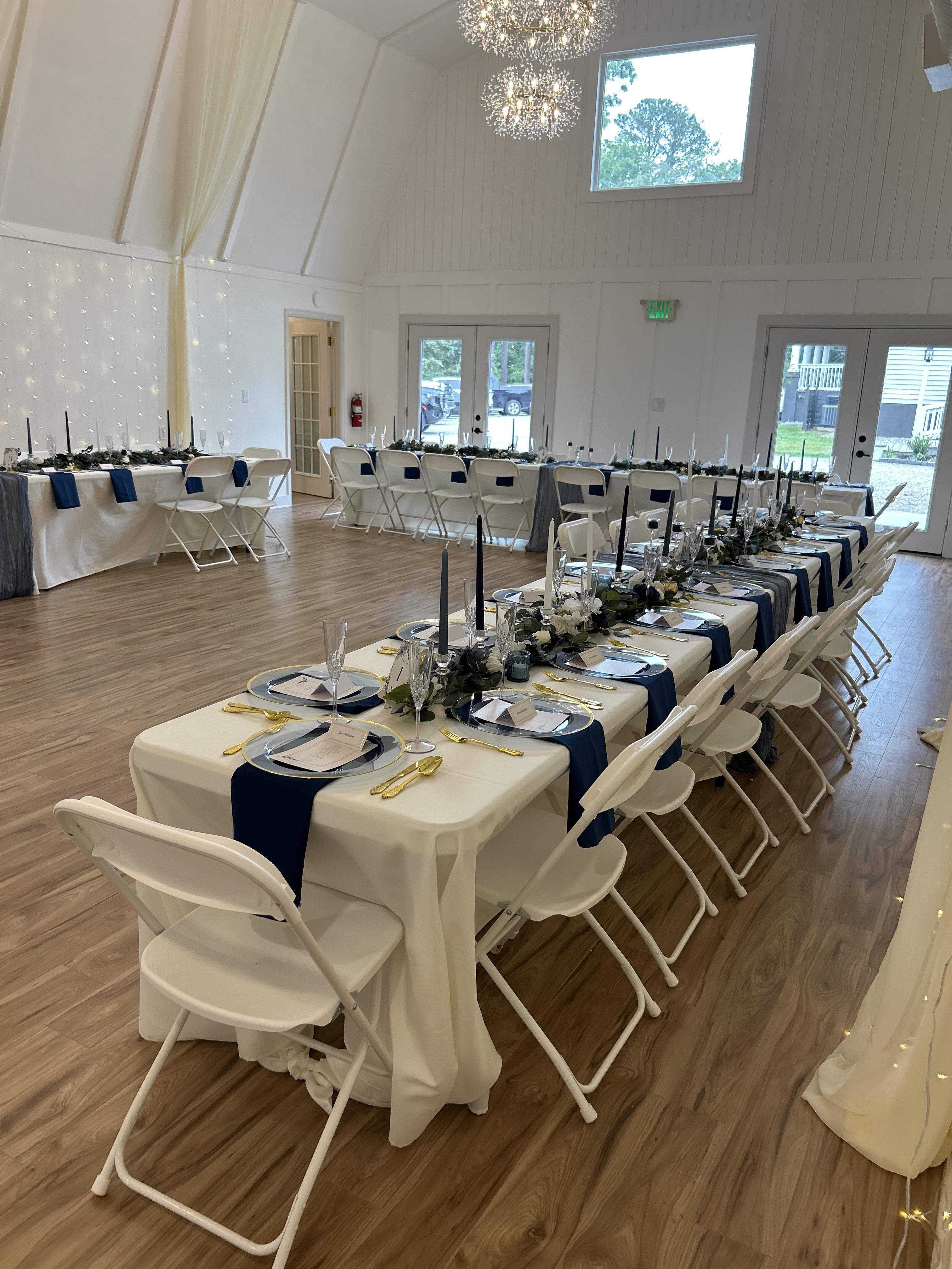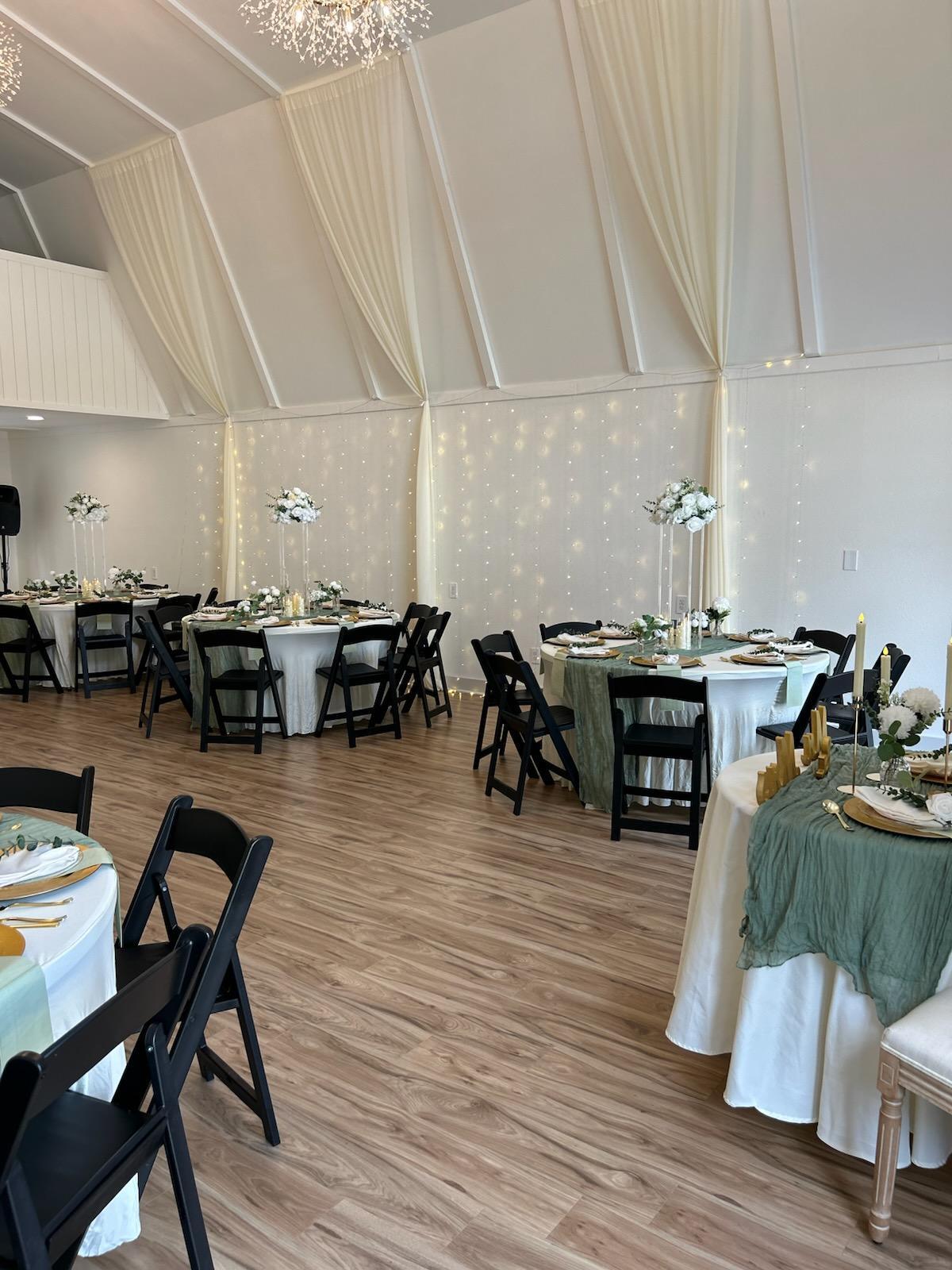 Chandeliers on dimmers Tables and chairs for up to 100 guests Sound system 275 SF Commercial kitchen for catering or private chef 500 SF Wedding dressing room/Bridal suite or flex space with private bathroom 1100 SF main area with vaulted beamed ceilings and 2 additional bathrooms