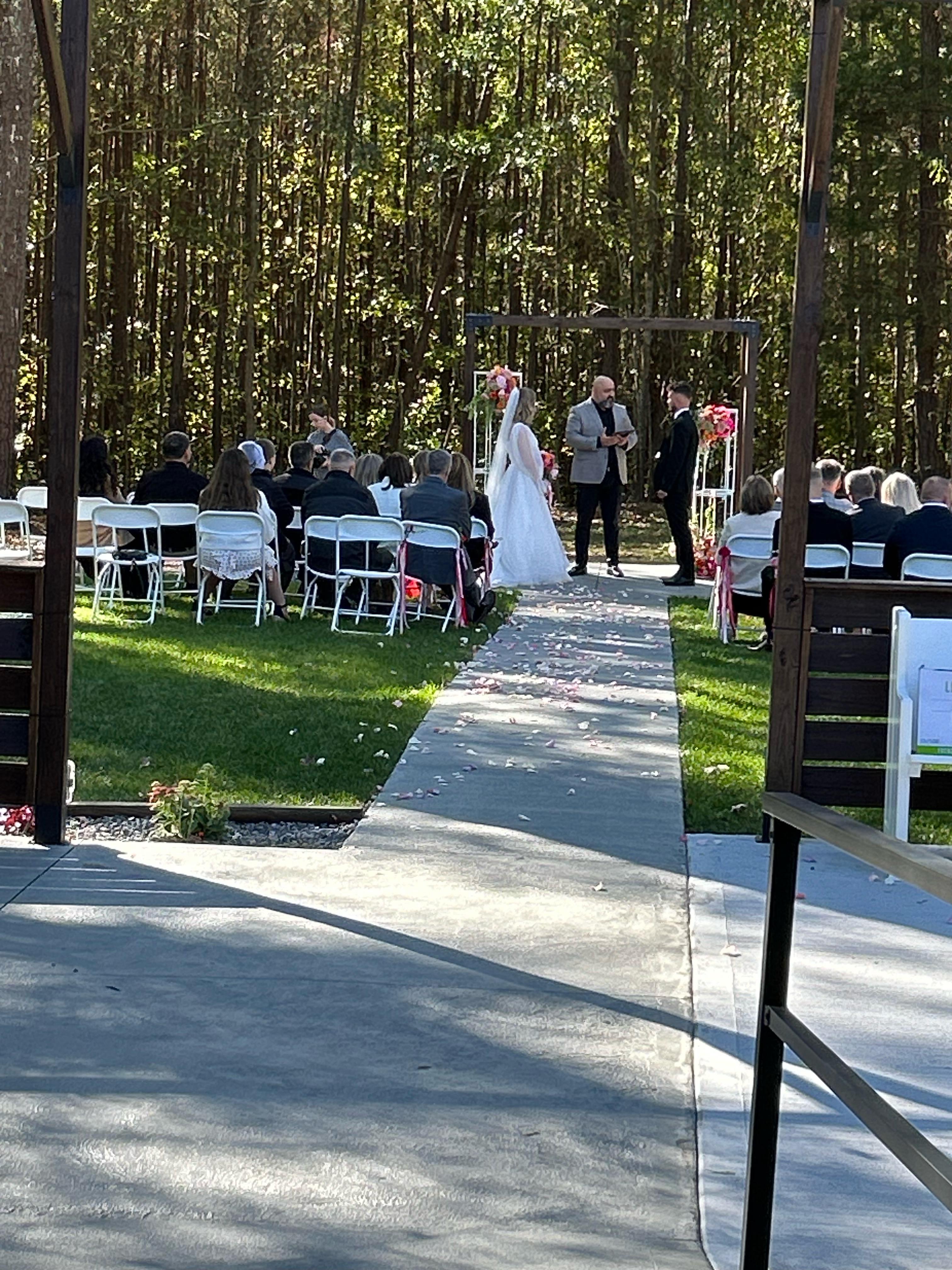 The beauty of nature in this wooded backdrop ceremony site. There is an aisle that leads to the ceremony pad overlooking the forest. Additional 2000 SF patio directly to the rear of the barn building.