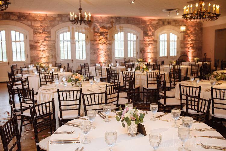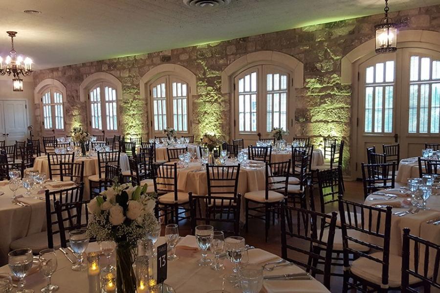 The team at the Chateau Bellevue offers all couples usage of their round tables, ivory linens, ivory cloth napkins, chairs, and decorative tables. They can also help you with setting up and cleaning up all of your wedding-day decorations and furniture.