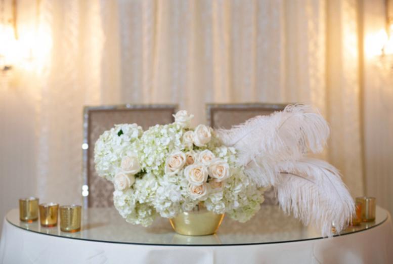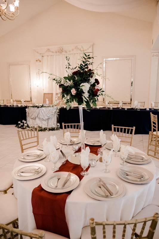 This luxurious space is perfect for your elegant reception. It features white marble flooring with large chandeliers, sheer draping, champagne accents and gold Chiavari chairs.
