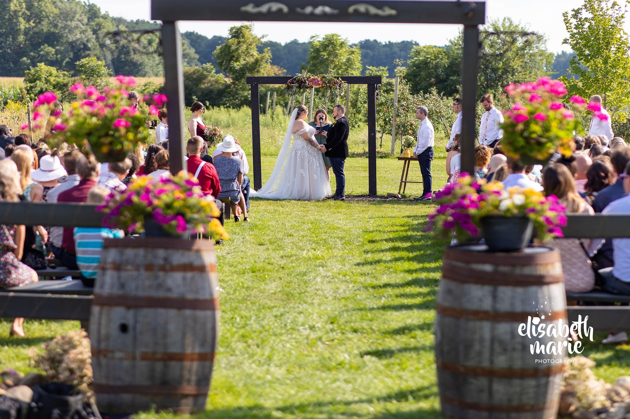 This space is nearly 2,000 square feet compete with seating, arbor and gorgeous landscaping. The ceremony space overlooks our apple orchard and flower patches and is just steps from the reception barn.