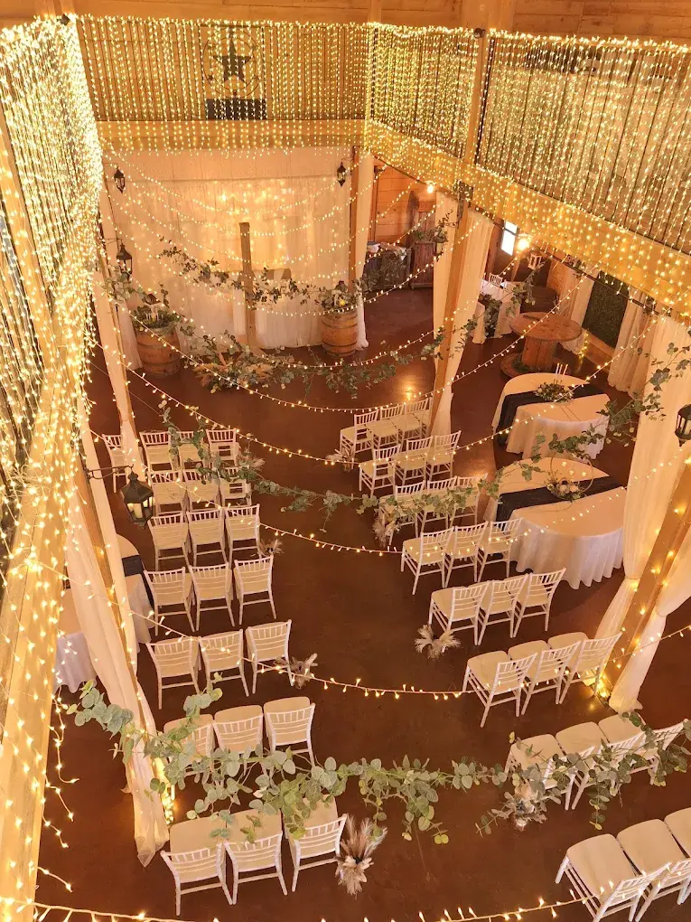 Cherry Farm offers a magnificent, newly constructed barn-style venue and dedicated outdoor grounds for your celebration. • The Main Barn: The interior features rich wooden plank walls and towering ceilings with exposed beams. The flexible, open floor plan can be configured for both your ceremony and reception, comfortably hosting a large number of guests. The space is beautifully illuminated by abundant string lighting and charming industrial pendant lights, and often features a central fireplace and elegant draped fabrics to enhance the rustic-chic ambiance. • Outdoor Ceremony Site: The grounds offer picturesque scenery and a natural backdrop for your vows. The outdoor area often utilizes wooden benches or padded chairs set on manicured lawns, with the beautiful countryside and hay bales providing a classic, rustic feel. • The Lodge (Overnight Accommodations): Our grand and spacious 12-bedroom Lodge offers the perfect retreat. The second floor features a warm and inviting kitchen and a living room.