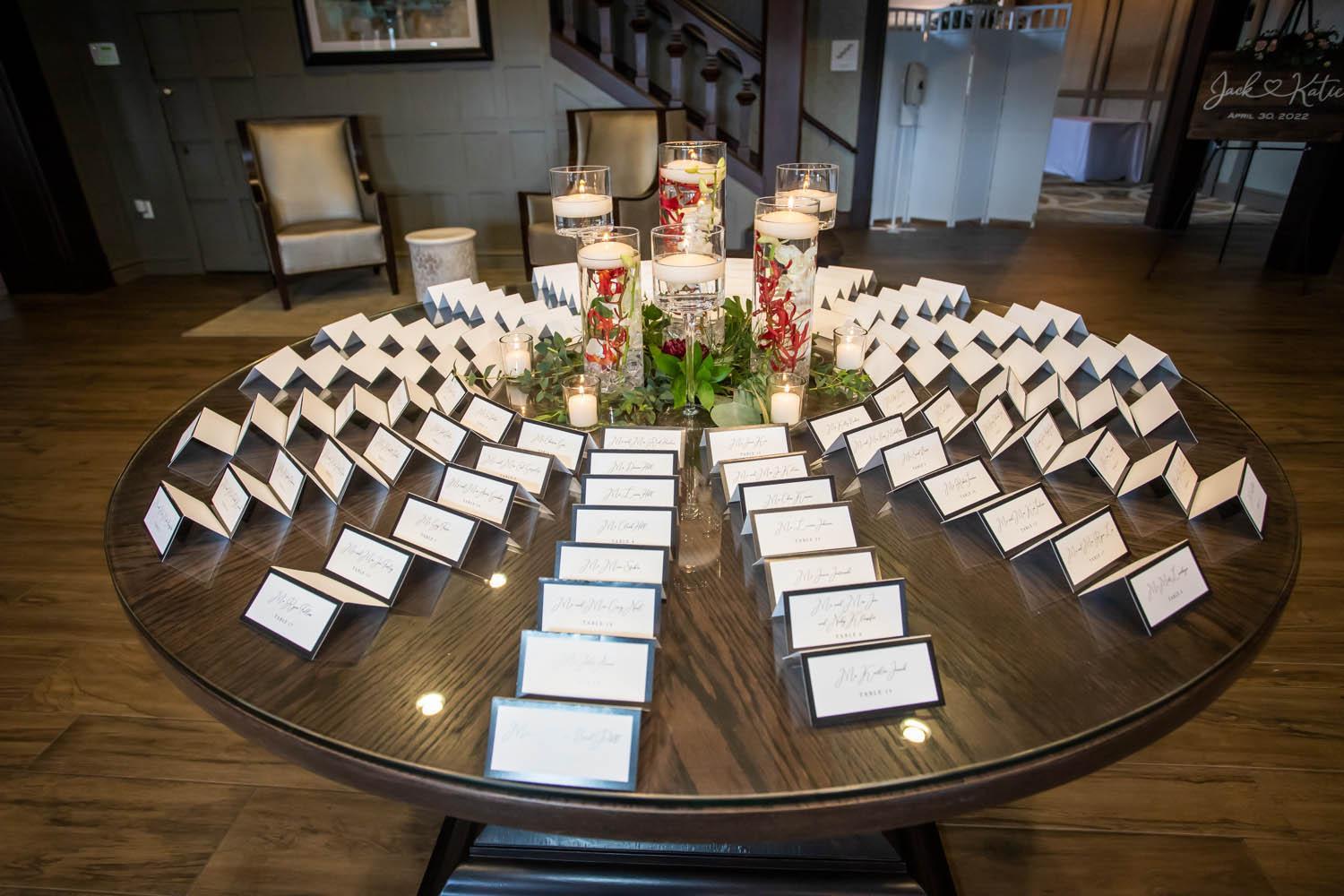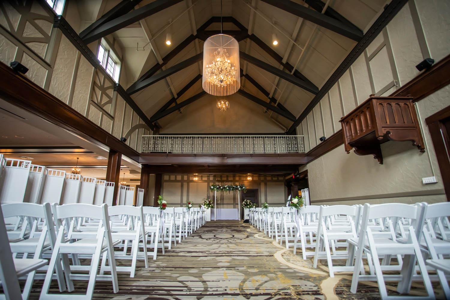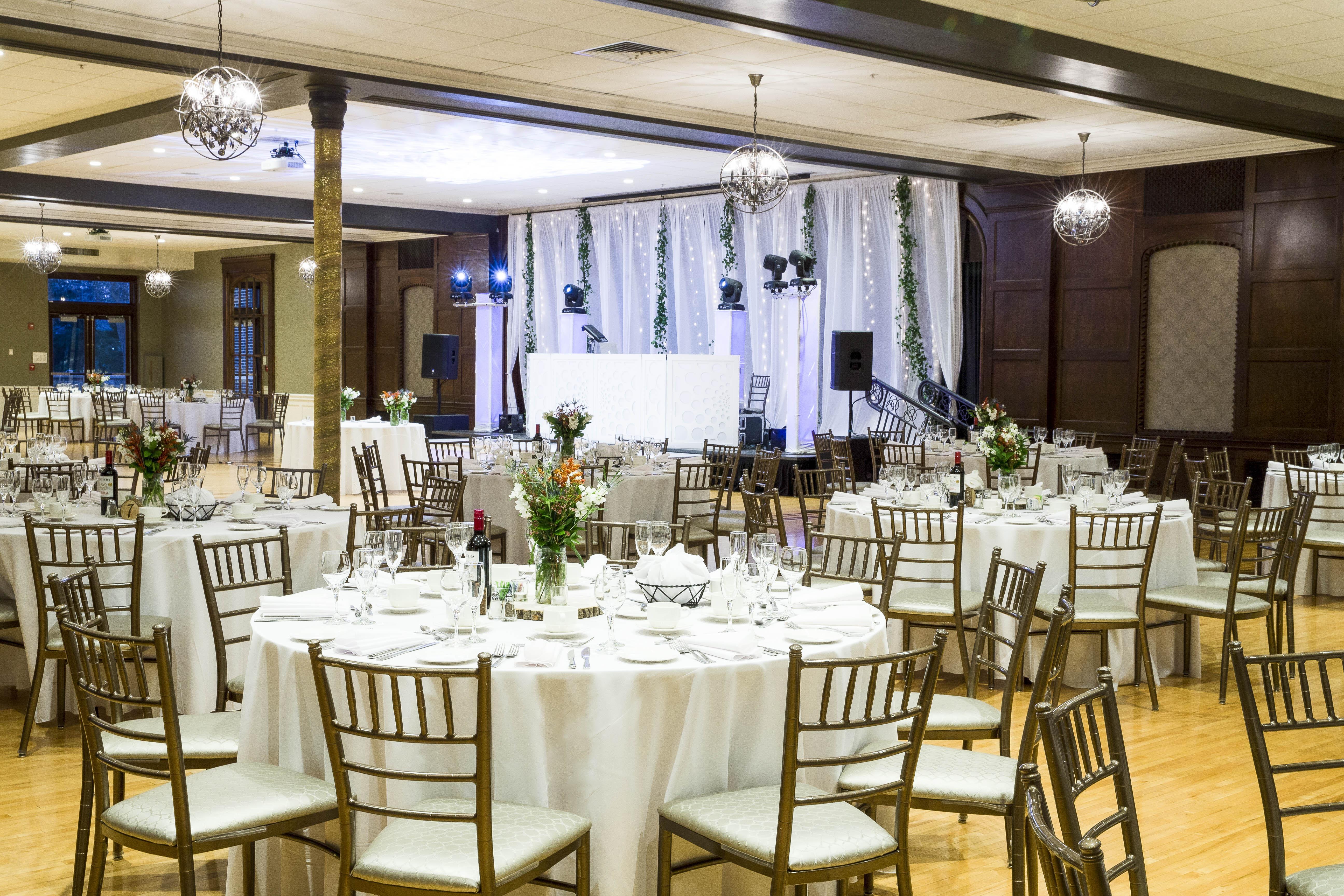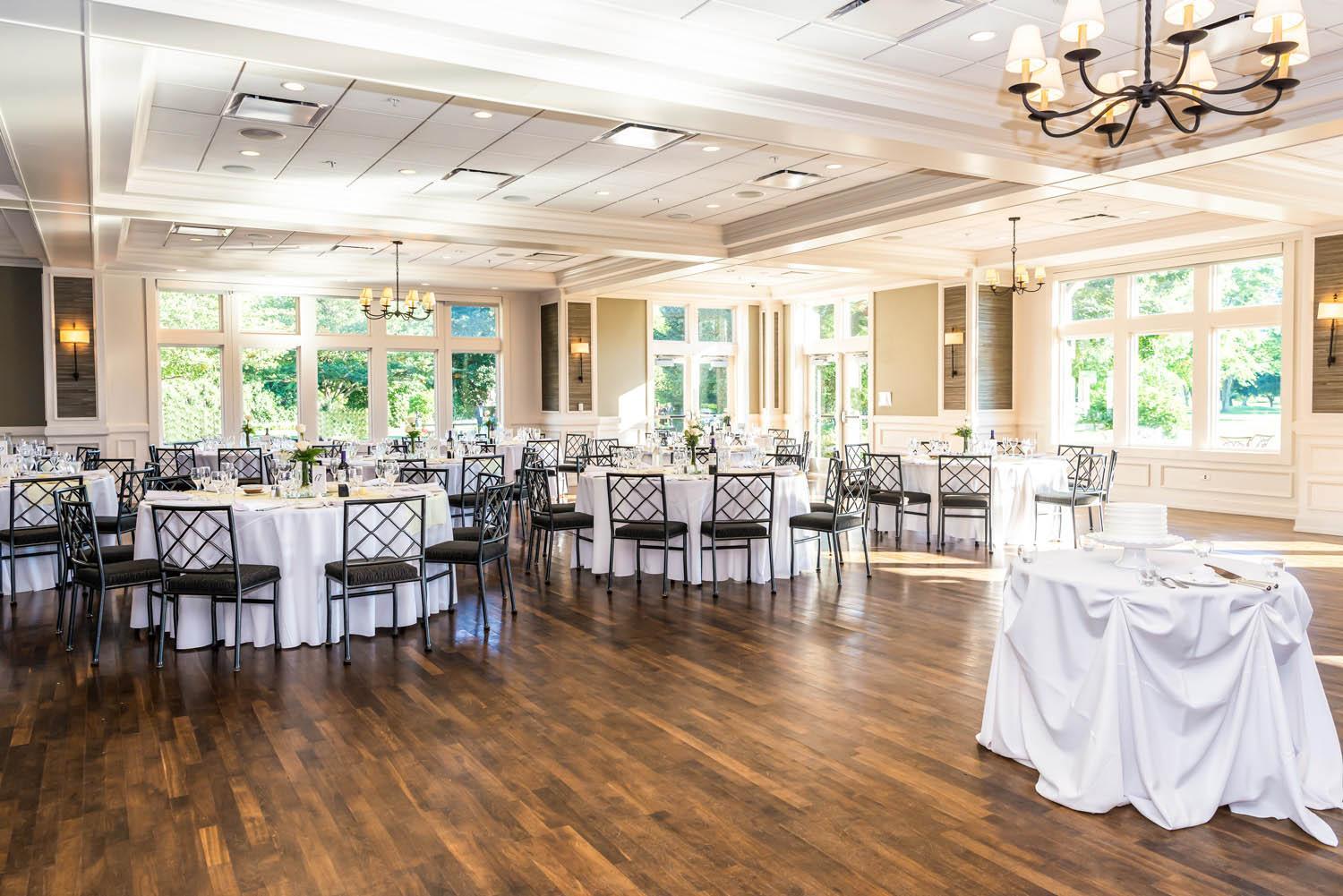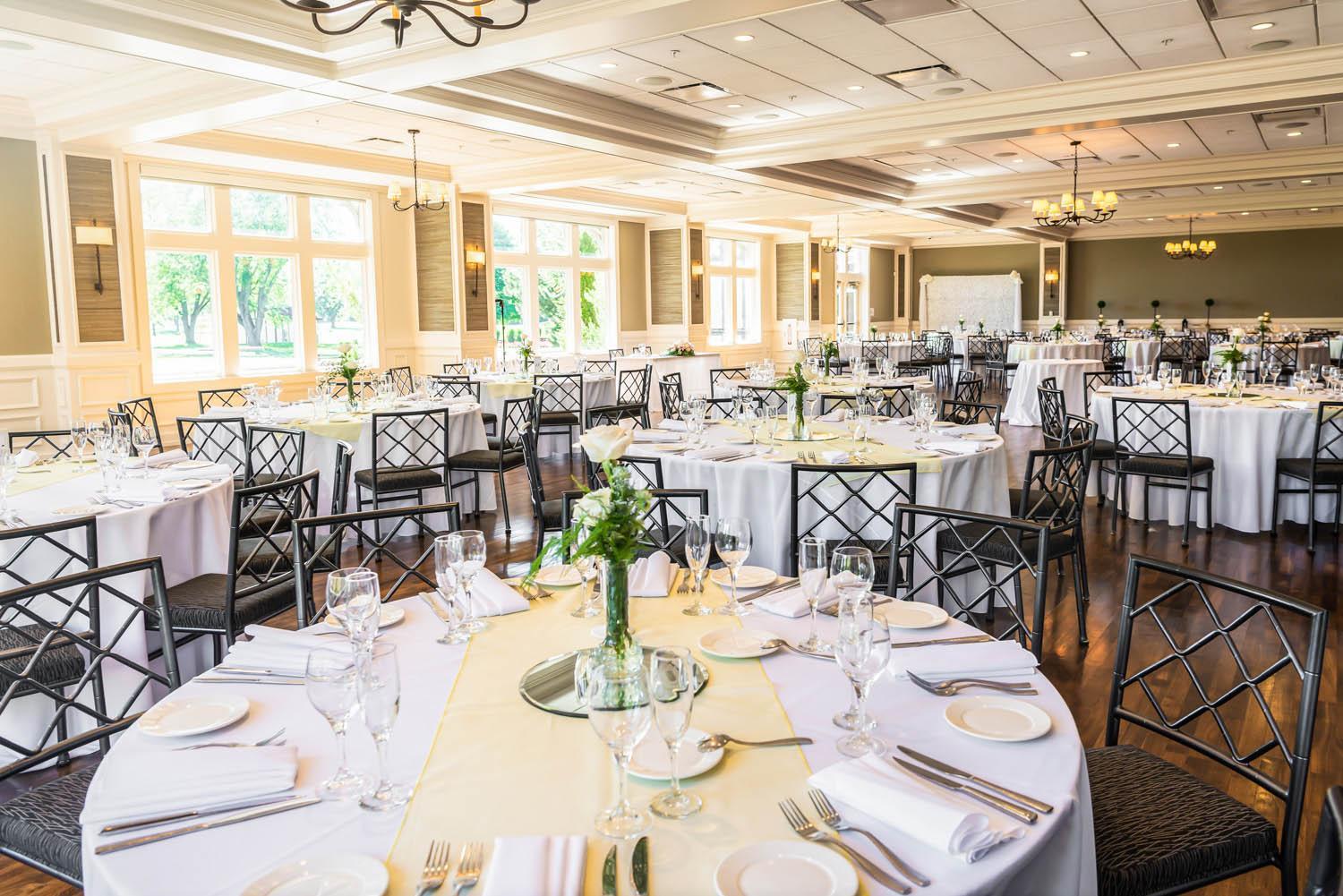 the Devonshire Room, is also available and can fit up to 225 seated guests. The versatile, bright hall can be adjusted to align with your specific vision. It features iron-wrought chandeliers and wide windows, allowing you to admire the golf course’s scenery while you celebrate.