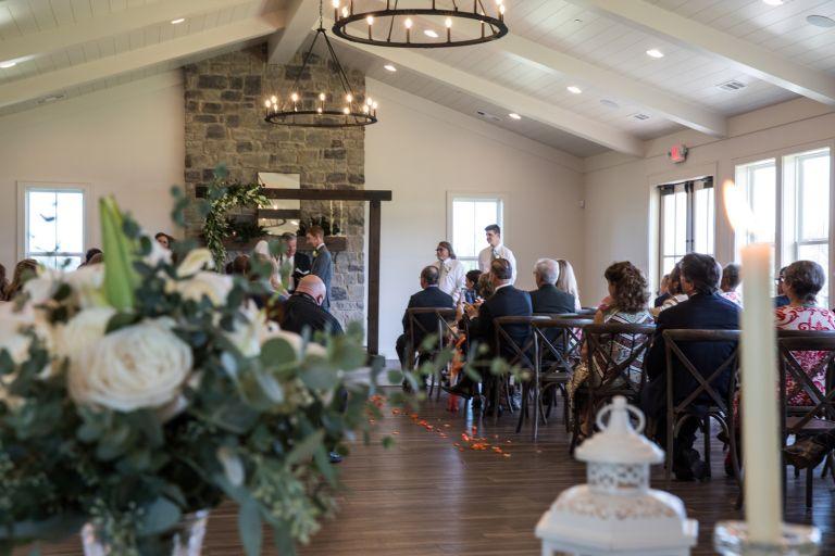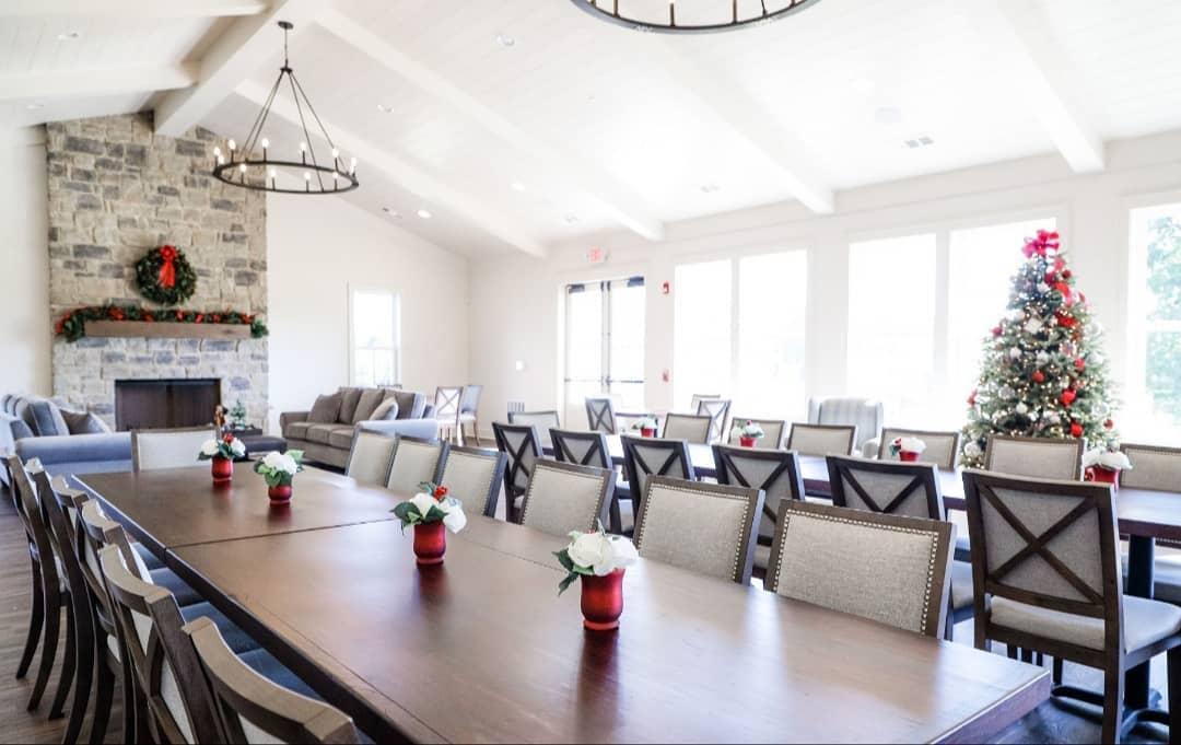 The Gathering Hall boasts a long wall of windows that look out to our magnificent course views. It has two elegant floor-to-ceiling fireplaces, modern chandeliers, and wood floors. Just outside the doors are two level lawns to host an outdoor ceremony (or even a reception). Rental of the space also includes our stone firepit overlooking our idyllic golf course.