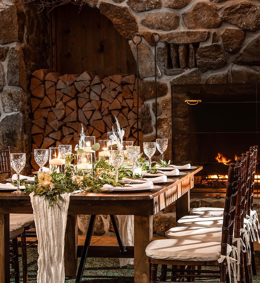 Dating back to 1786, our historic Barn features a 12-foot wide fieldstone fireplace and high ceilings. Bring your vision and personality to life in a warm, inviting setting that can be as formal or informal as you like. The Barn suits wedding parties from 20-110 guests, perfect for your rustic wedding in the White Mountains of New Hampshire. It is a charming historic building favored in the wintertime when seasonal lighting and decorations emphasize the charm of this historic structure.