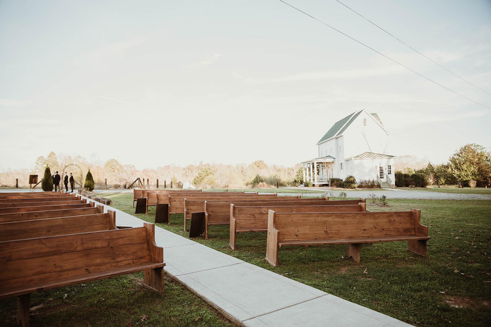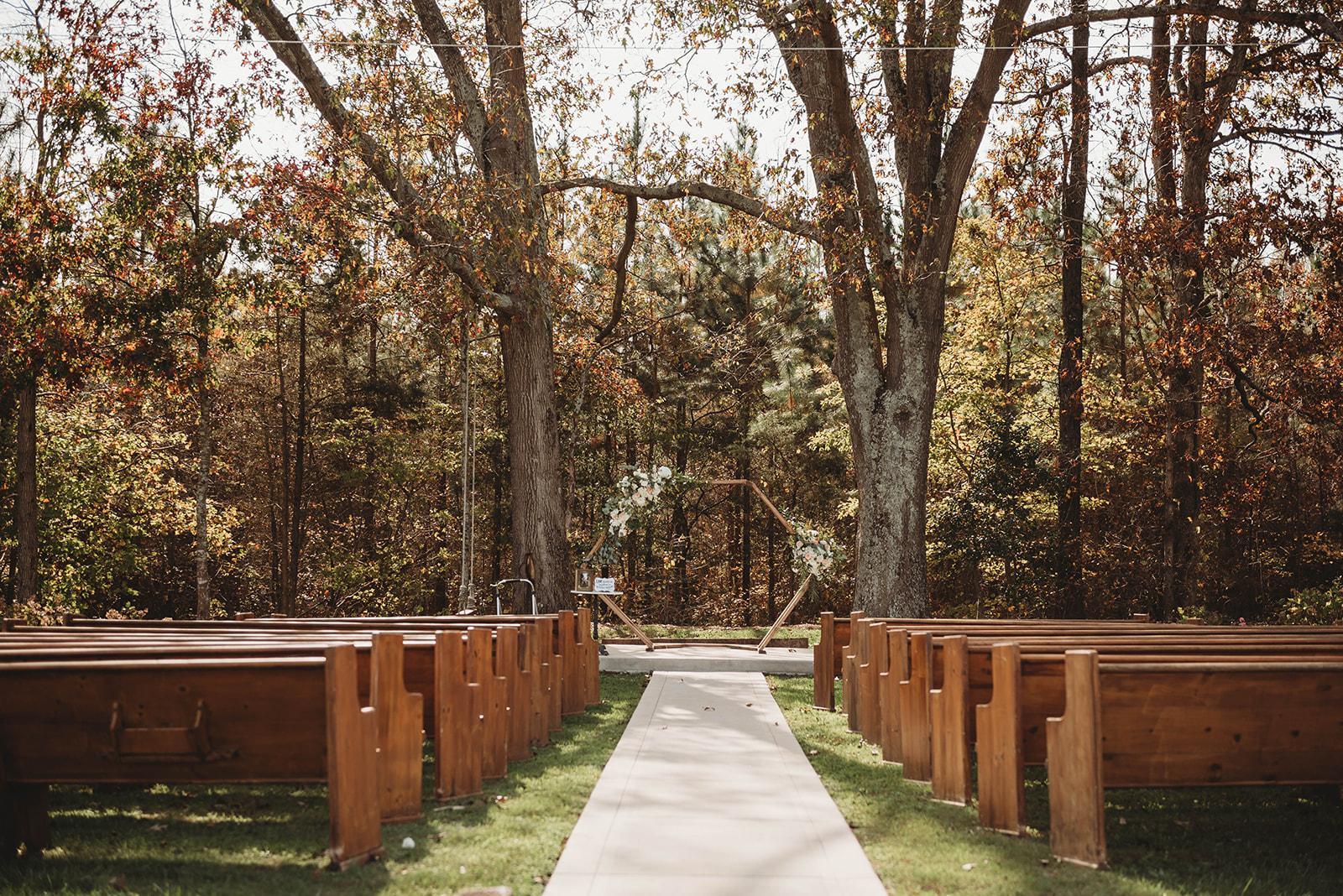 This ideal outdoor ceremony cite includes several rows of gorgeous wooden church pews, concrete aisle for easy walking, a complementary arbor, and swing.