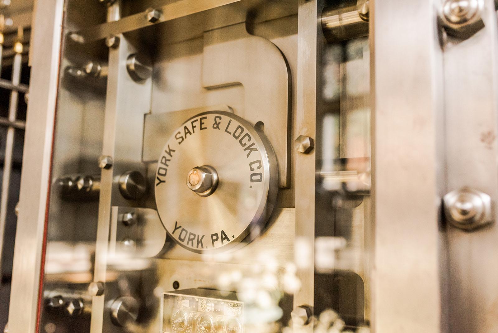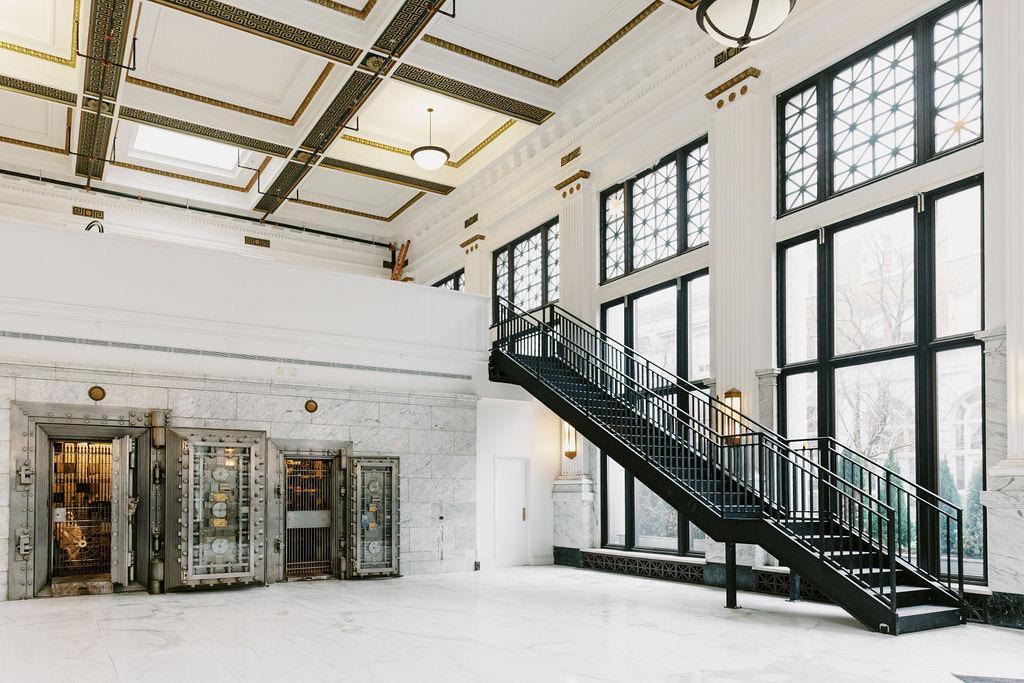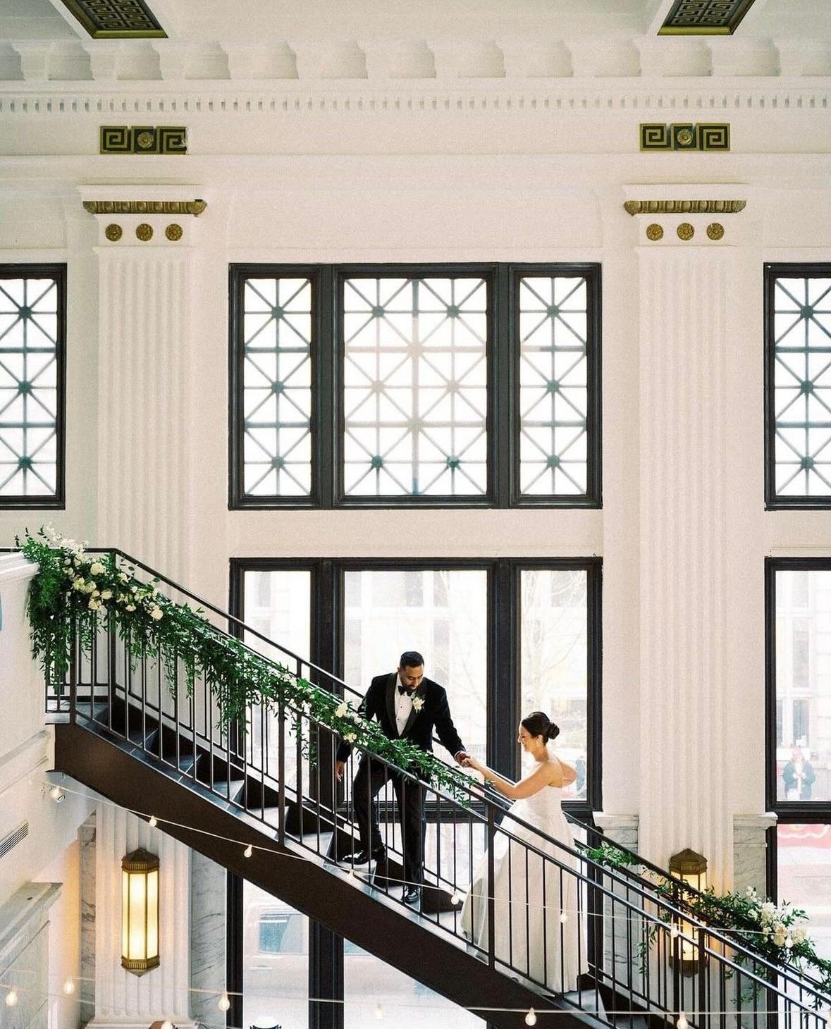 Our main level features beautifully renovated historic bank vaults and skillfully crafted marble mosaic tile from 1908. Follow the dramatic staircase up to the mezzanine, where you'll find a charming dressing suite, dramatic skylights, and stunning Versace style ceilings. Colors of white, black, and gold thread themselves throughout this venue to create a remarkably romantic and classic look.