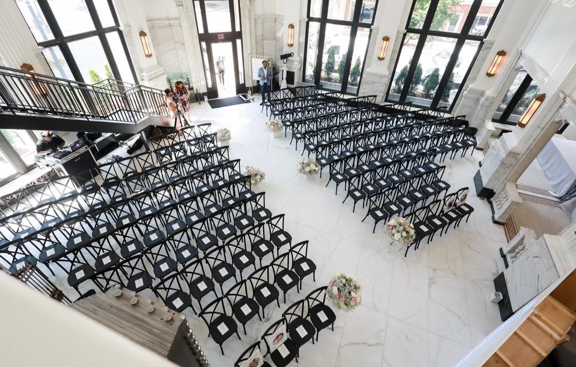 Citizens Ballroom is a cornerstone building turned wedding and special event venue in the heart of historic downtown Frederick. The former bank has been lovingly renovated to its original glory and updated for its new life as a celebration space. Originally built in 1908, the building still contains most of its original details, including bronze doors, statement 30-foot coffered ceilings and signature bank vaults. Come in for the gorgeous venue and stay to enjoy our industry changing policies that allow you to customize your day beginning with our standard 16 hour day. Come early to relax in your dressing suite, give your vendors ample time to decorate and set up, and plenty of time for photographs! You're free to select your favorite licensed/insured full service caterer, and our curated short list is a great place to begin. Our tables and chairs are included and we offer rental service for any additional items (linens, china, glassware etc.). We would love to celebrate with you!