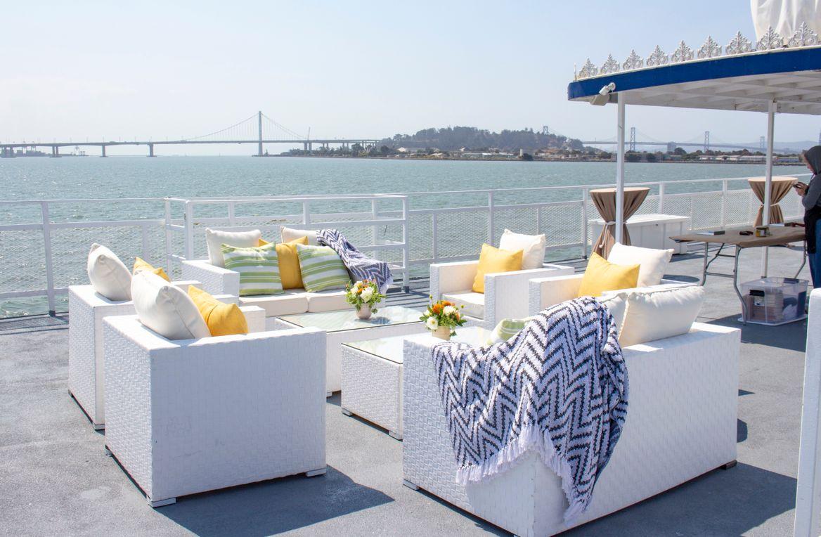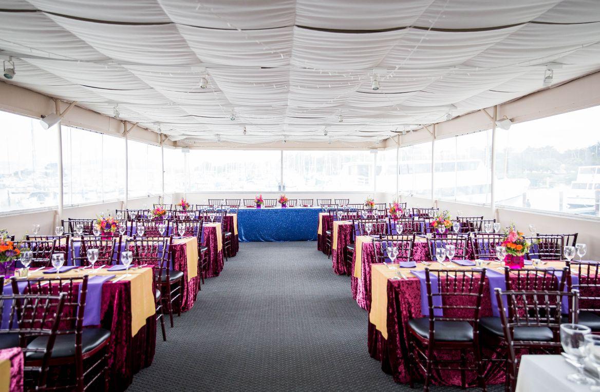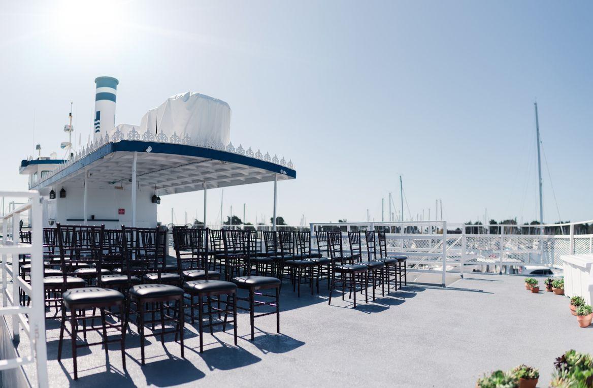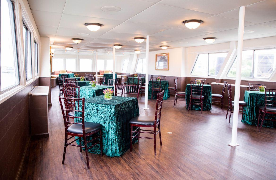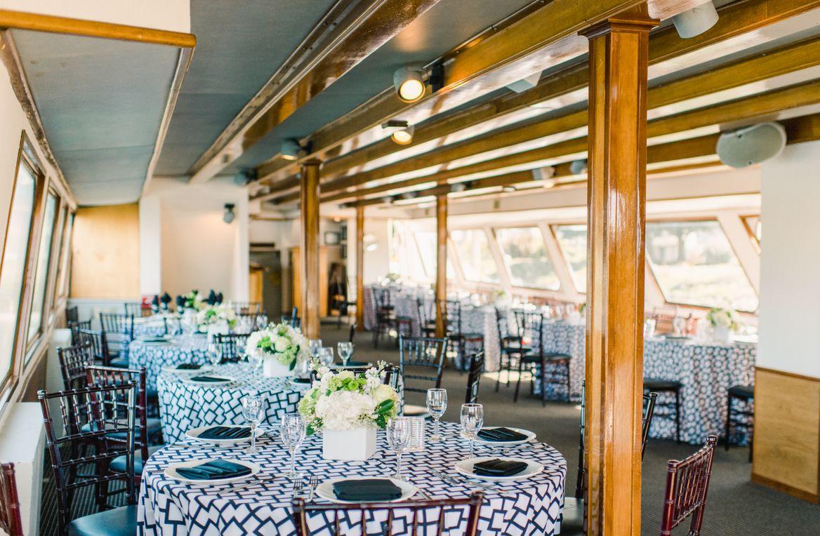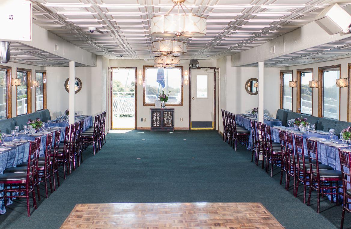 Step aboard the Empress Hornblower, evoking a bygone era with its classic riverboat charm. Inside, art deco brass chandeliers illuminate rich mahogany bars and plush carpeting, creating an elegant ambiance across two decks. Guests can revel in bay vistas from wraparound decks. The first deck, hosting 150 guests, boasts a full bar, dance floor, and scenic bow. The second deck accommodates 100 with a bar, dance floor, and panoramic windows. Ascend to the Sundeck for 360-degree views, perfect for receptions or lounging for 40. Furniture options can be tailored by speaking with a Hornblower event planner.