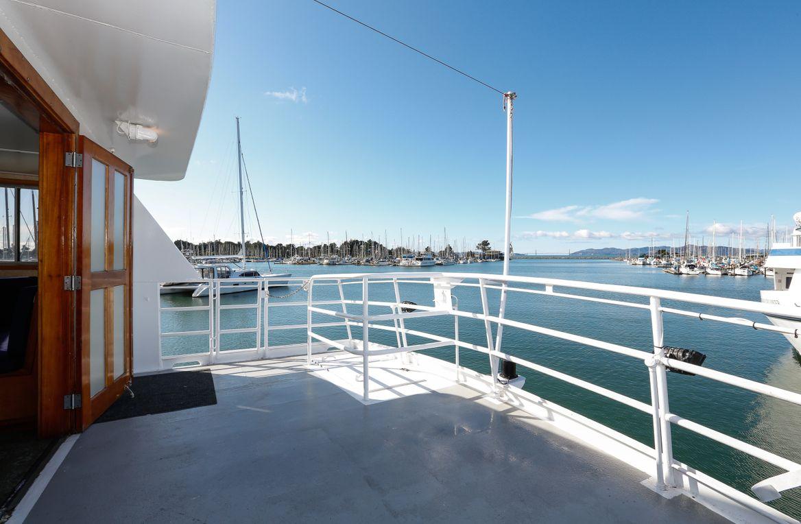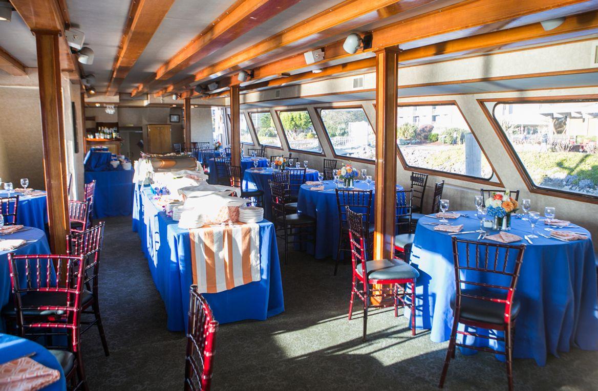With an interior as impressive as the vistas outside, the Sunset Hornblower is the perfect venue for medium-sized groups. Highlights include round dining tables, polished hardwood columns and exposed overhead beams that emphasize her charm. New plush, neutral-toned carpets and rich mahogany woodwork round out her fresh and updated look. Her spacious upper deck boasts gorgeous french doors that open to spectacular views that make a stylish backdrop for your event.