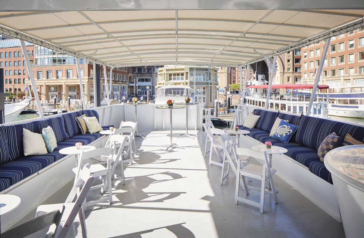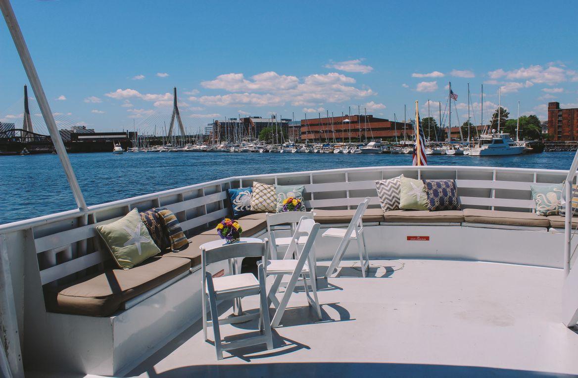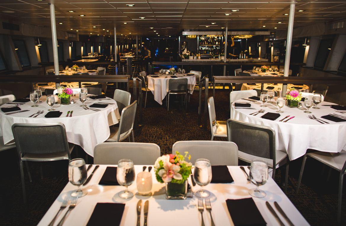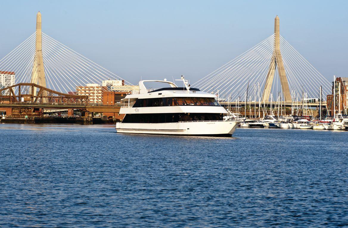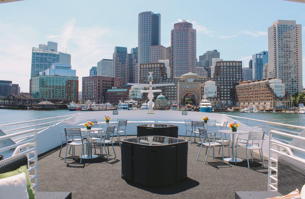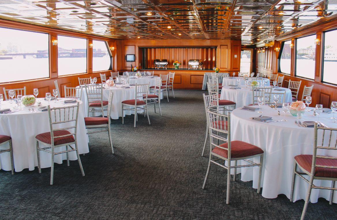 "Step aboard the luxurious Boston Elite, a two-level private yacht boasting a dining room, cocktail lounge, and breathtaking views of Boston from its two outer decks. Whether you prefer buffet-style or plated dining, our customizable menus cater to your event's every need. For special occasions like weddings, our private downstairs room offers a secluded space with a private restroom, ideal for preparations. Ascend to the elegant dining deck for an unforgettable main event, then join us topside for cocktails amidst stunning vistas, plush lounge furniture, and a private bar."