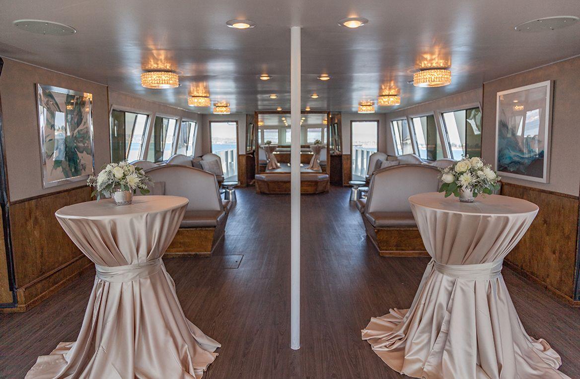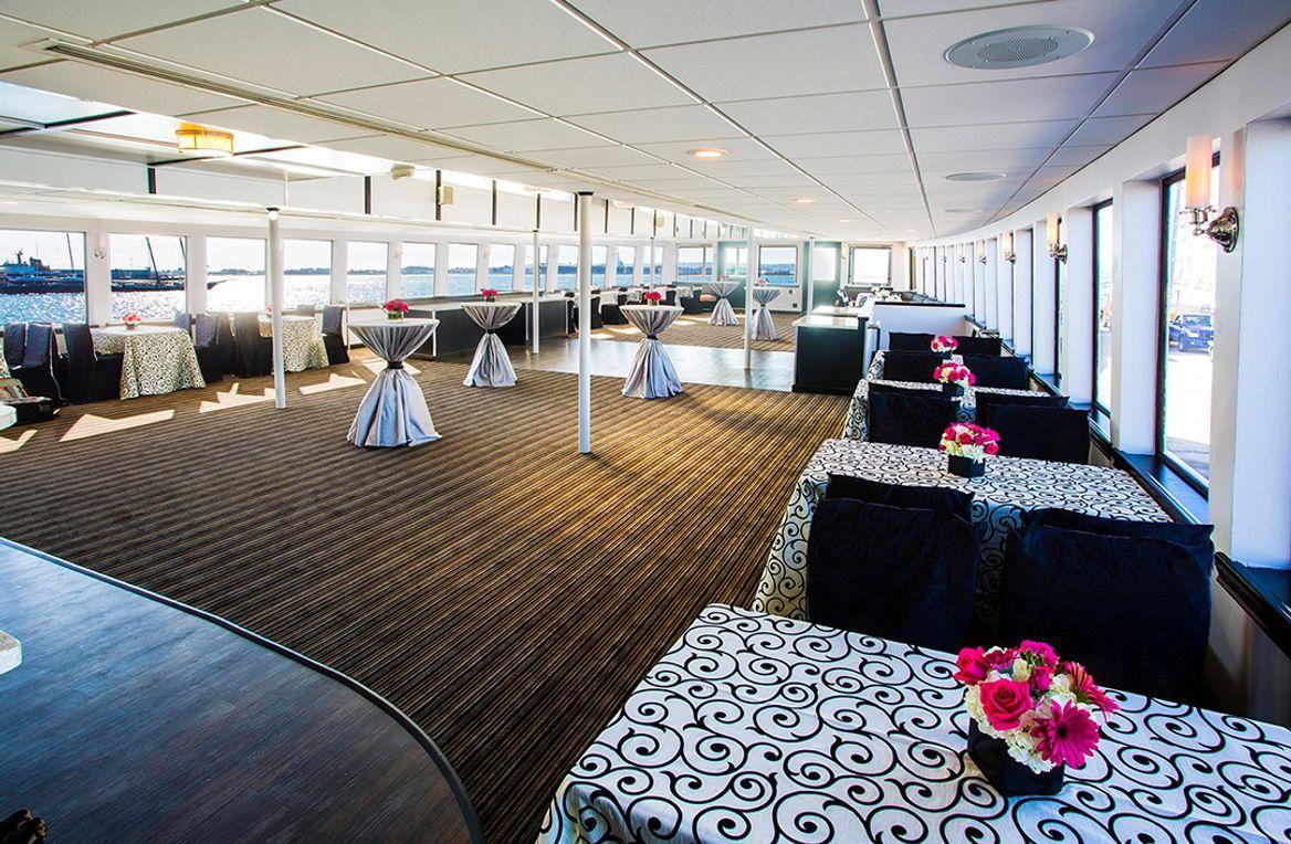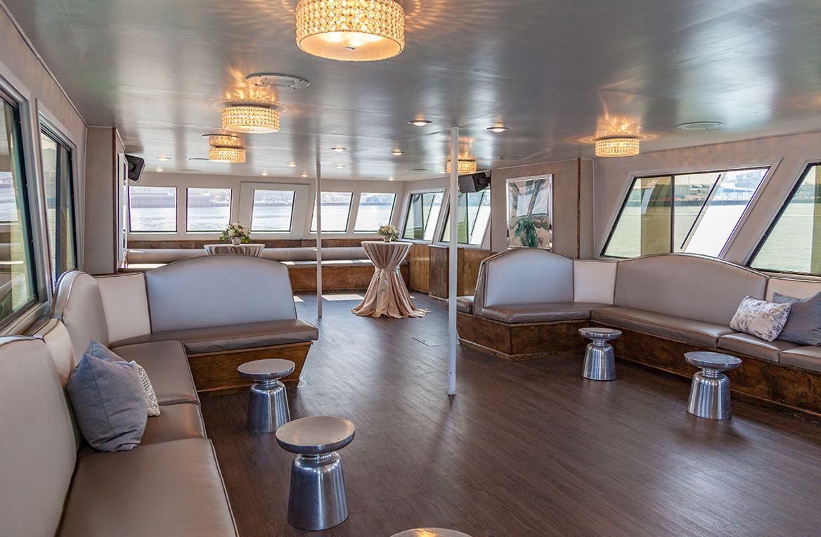 Sun deck: Outdoor cocktail tables and chairs , full bar, market lighting , accommodates over 300 people. Upper deck: Cocktail and dining seating, fully stocked bar with glassware, large restroom facility, aft outdoor deck. View Salon: Cocktail and dining seating, bow outdoor deck. Main Deck: Cocktail and dining seating, built-in dance floor, fully stocked bar with glassware, large restroom facility.