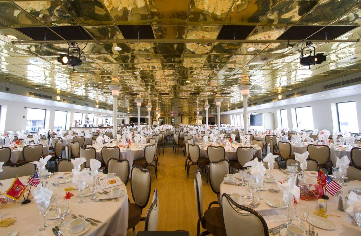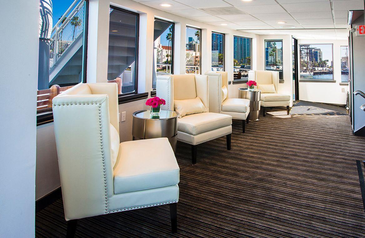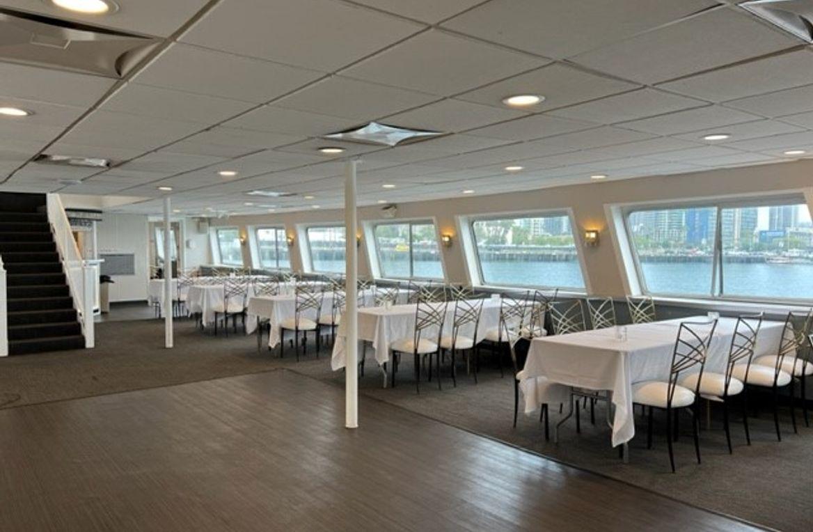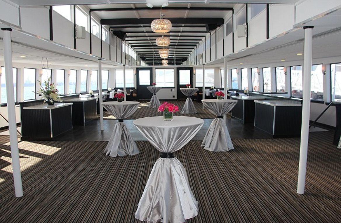 Sun deck: Outdoor cocktail tables and chairs , full bar, market lighting , accommodates over 300 people. Upper deck: Cocktail and dining seating, fully stocked bar with glassware, large restroom facility, aft outdoor deck. View Salon: Cocktail and dining seating, bow outdoor deck. Main Deck: Cocktail and dining seating, built-in dance floor, fully stocked bar with glassware, large restroom facility.