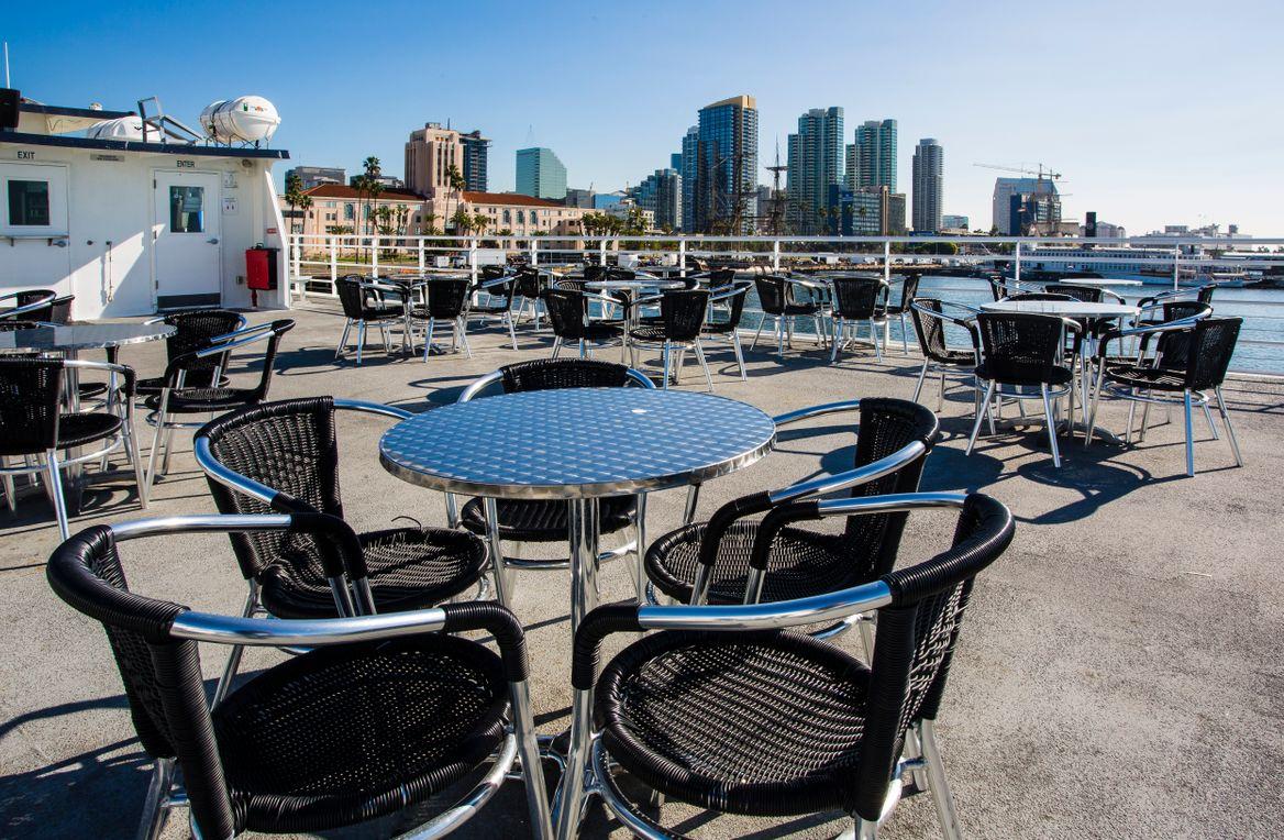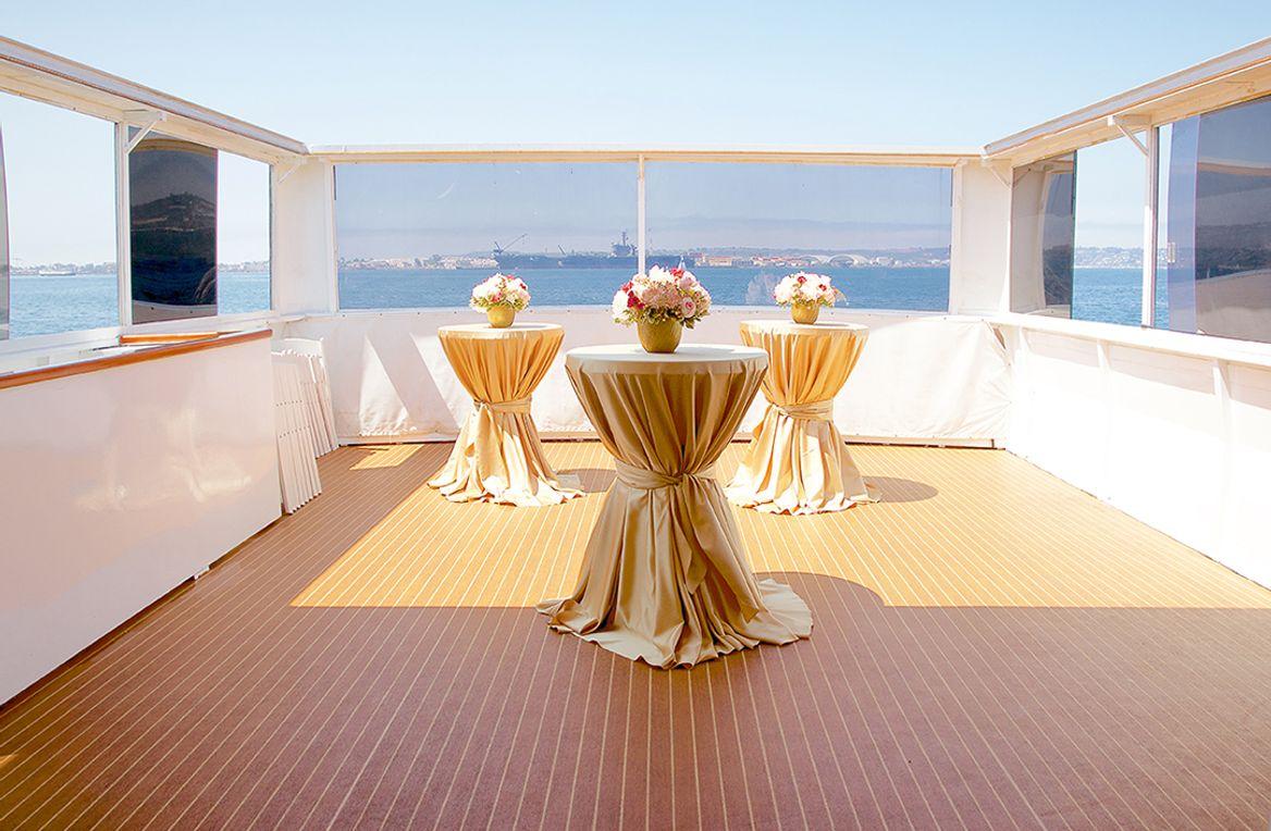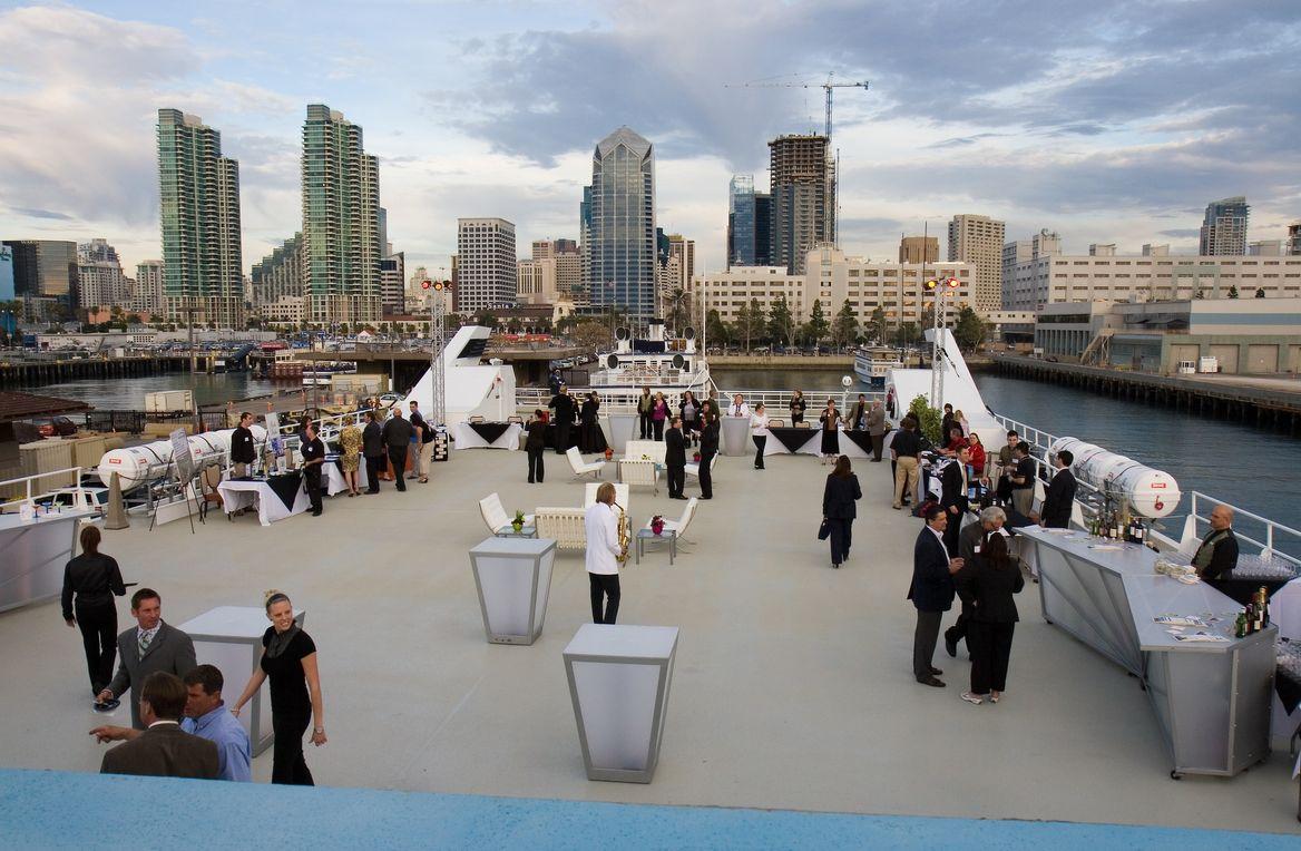 A luxurious 28,000 square-foot yacht featuring three magnificent decks, including a sprawling top deck with panoramic views of San Diego.