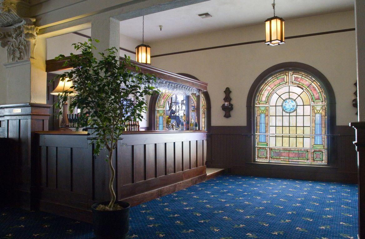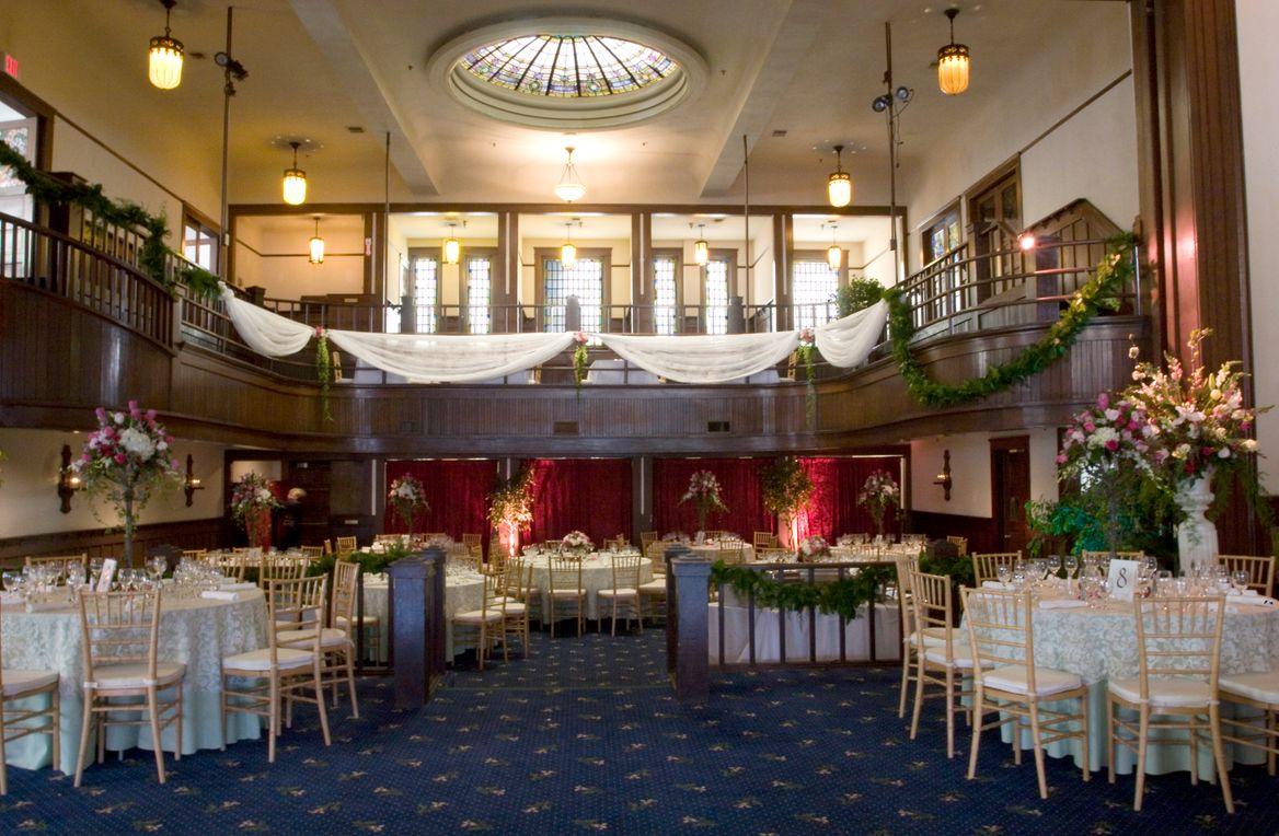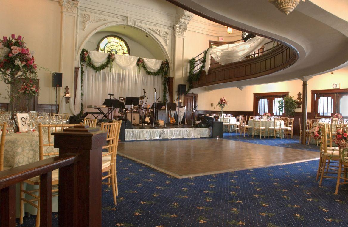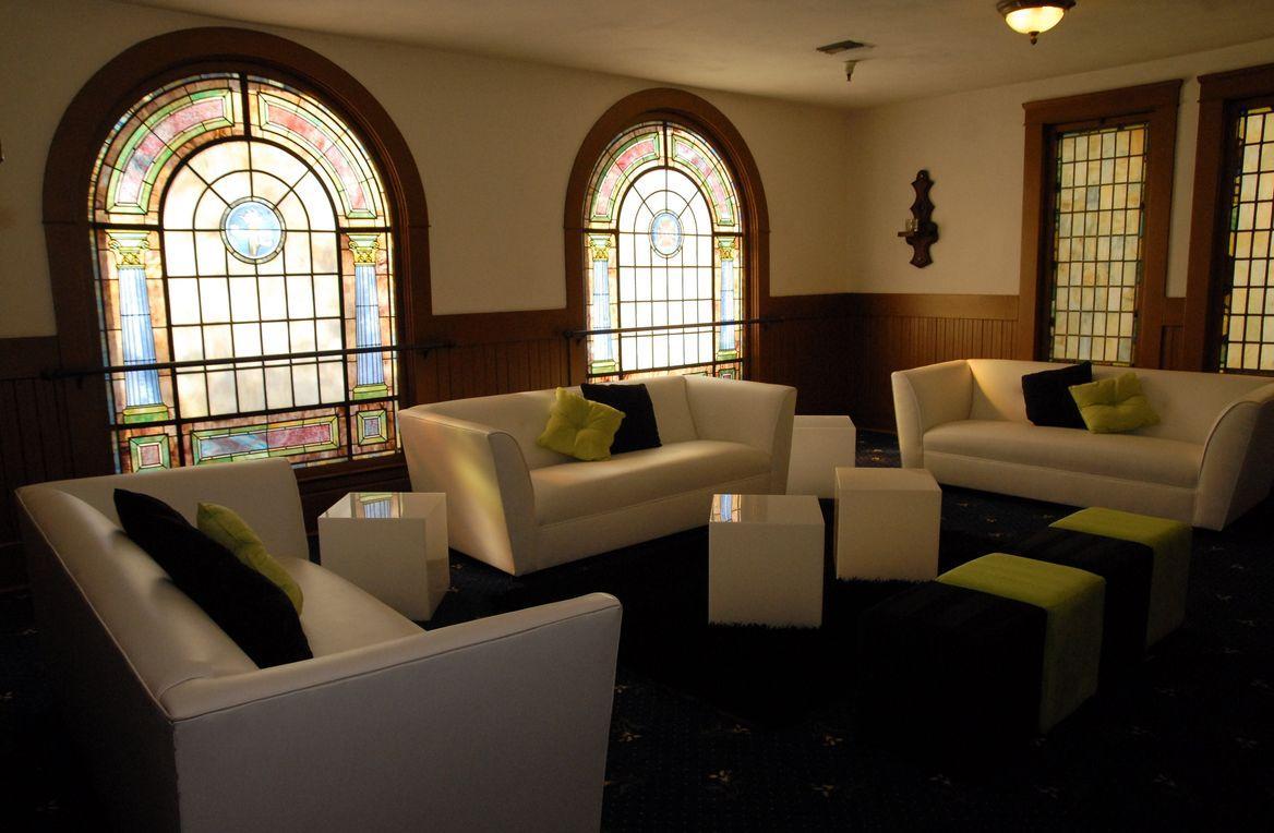 On-site kitchen - Two floors, two full-service bars - 50 foot Cathedral ceilings with two stunning stained glass domes - Mezzanine with balconies perched above the grand ballroom - Dance floor - Color-changing LED uplighting throughout building - Piano - Podium and AV can be added - Elegant stain glass windows - Large board room area that can be used as a bride's room