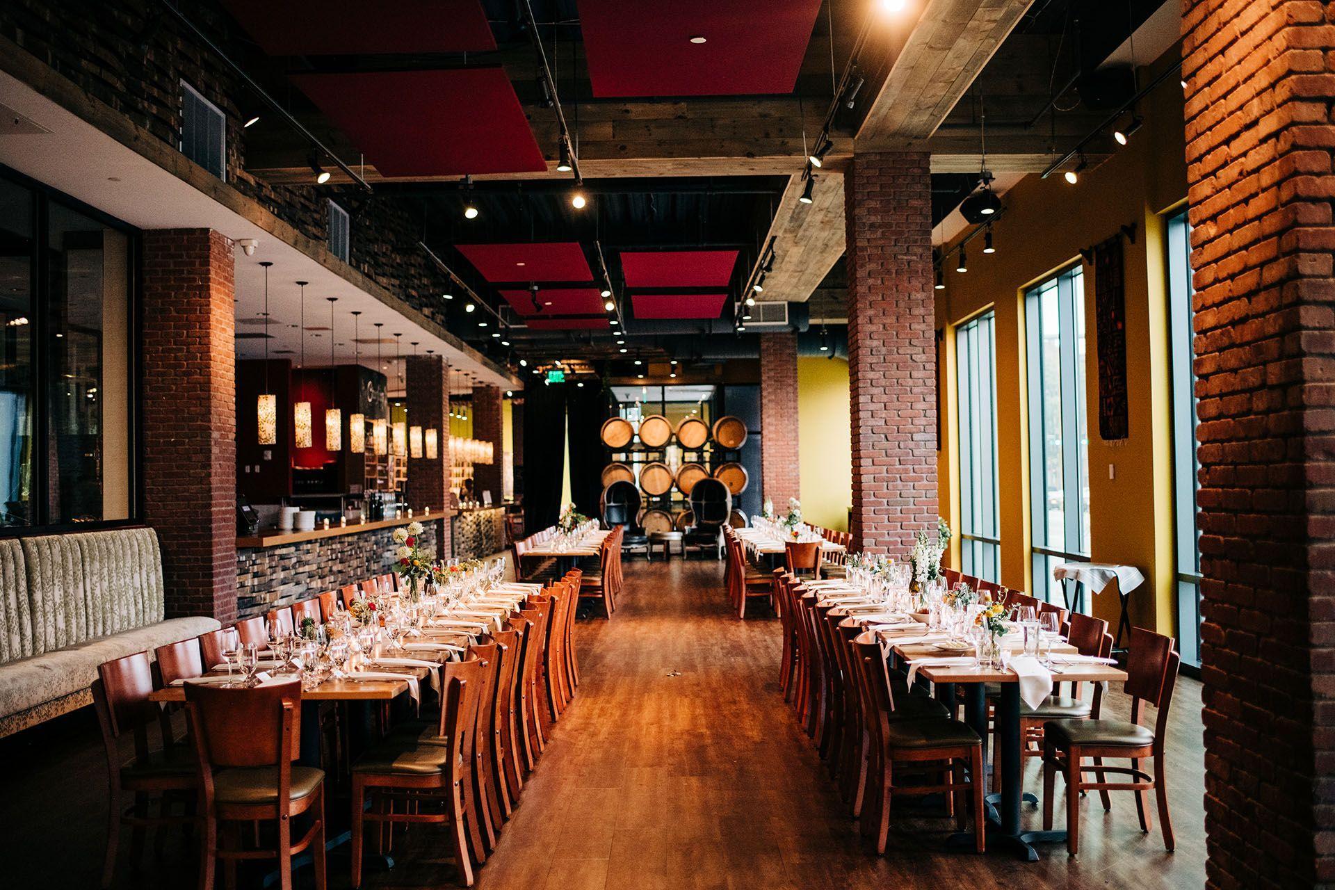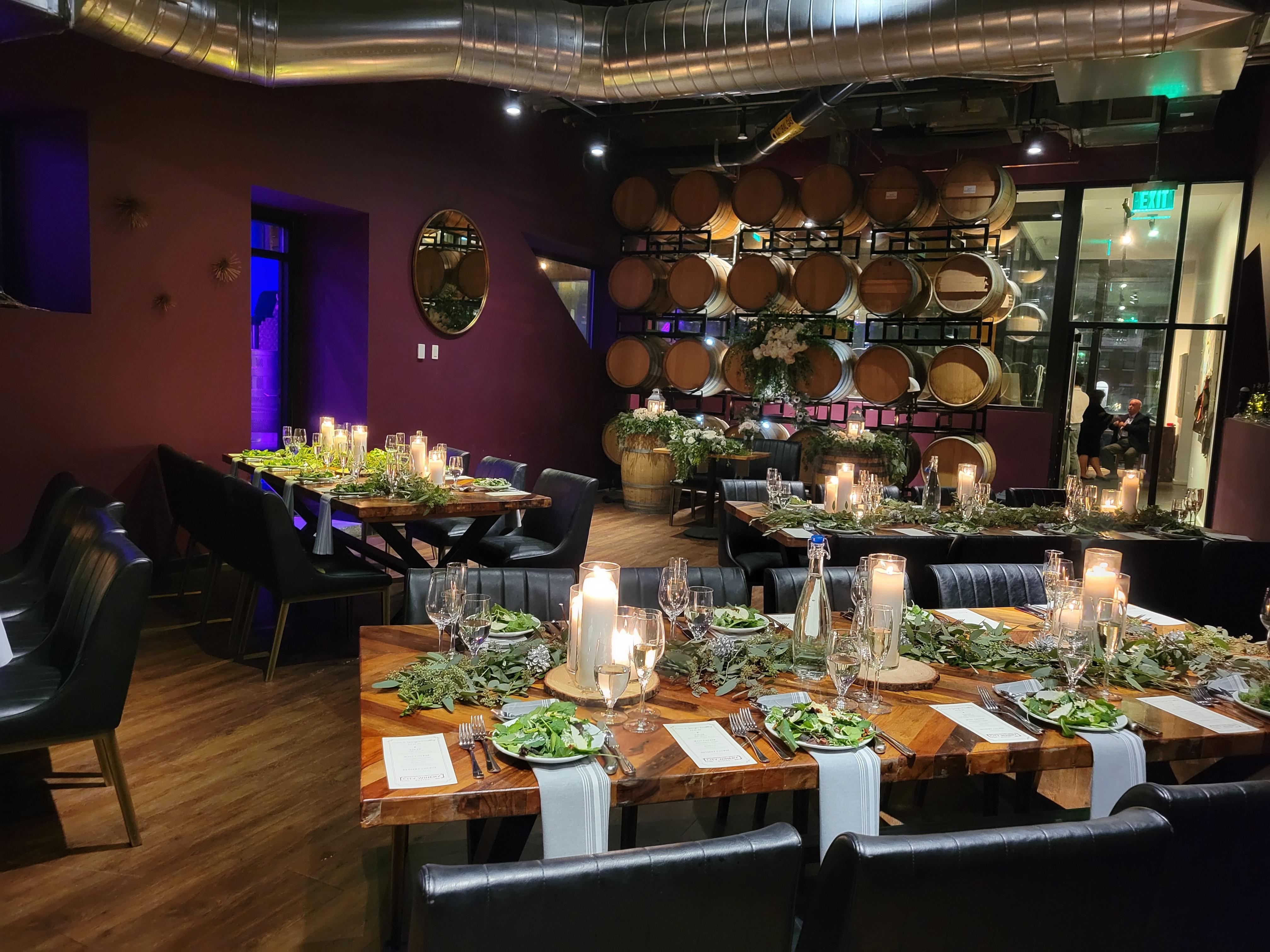 The Dining Room boasts exposed brick and a peek into our working winery. The space features a beautiful, fully stocked bar along with our collection of housemade wines on tap.