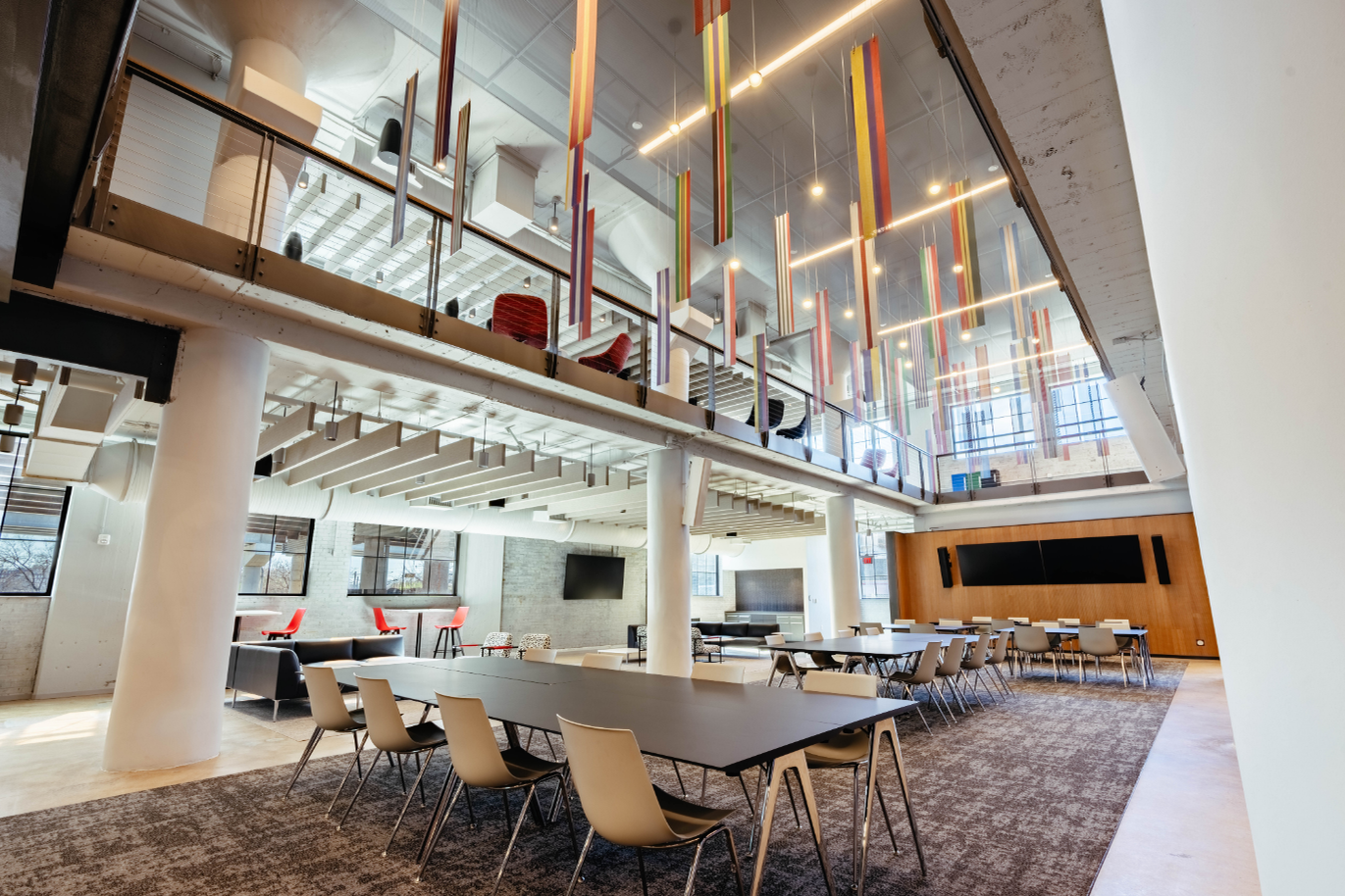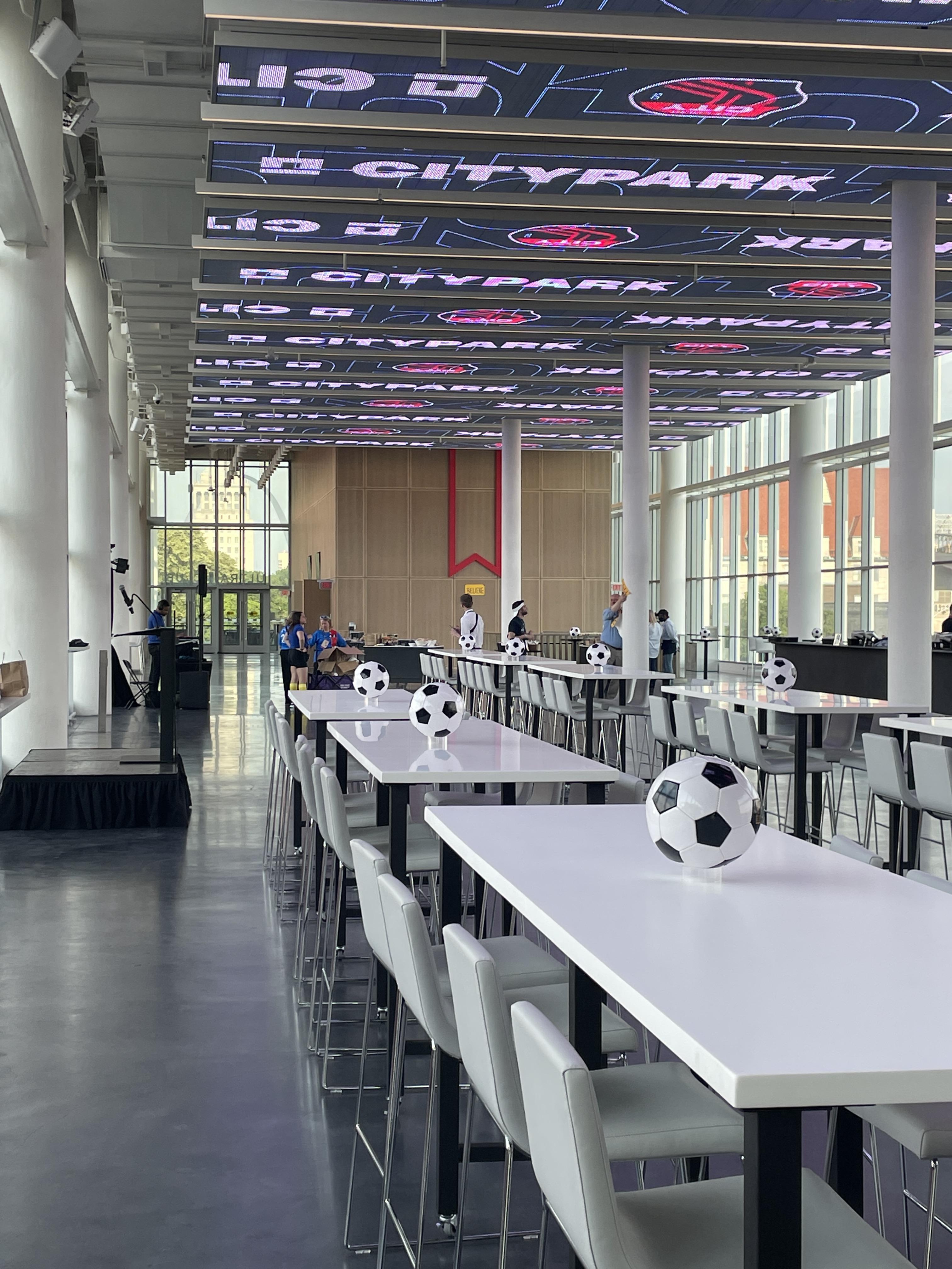 - Ability to display customized static or rotating graphics on TVs, including two (2) 18ft screens on each side of the room - Ability to customize the ceiling panels with static or animated graphics - Variety of 24" and 9' cocktail tables, light gray barstools and soft seating - Access to outdoor balcony space and a 1,000 person stadium seating section - In-house sound system with one (1) wireless mic and ability to play background music