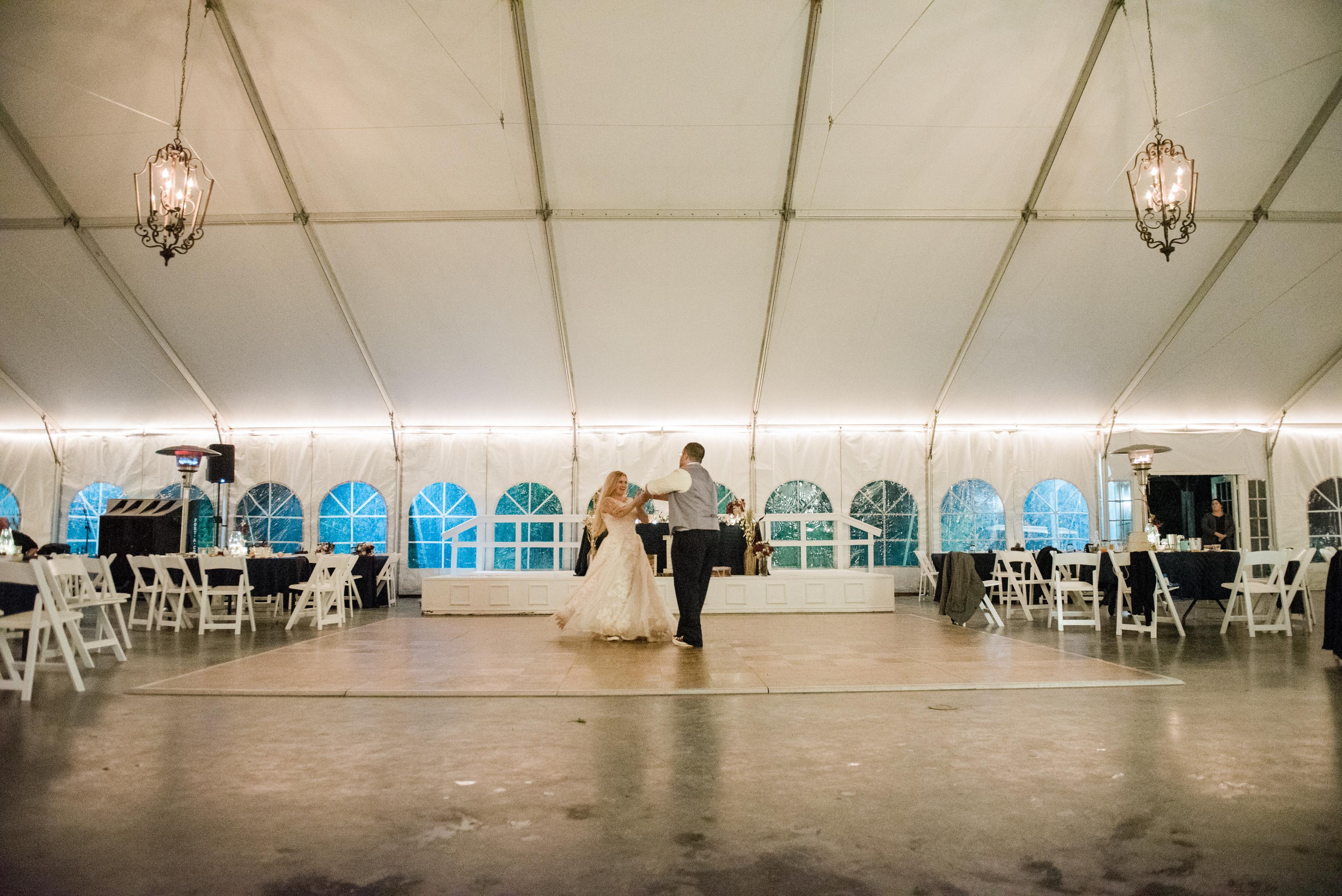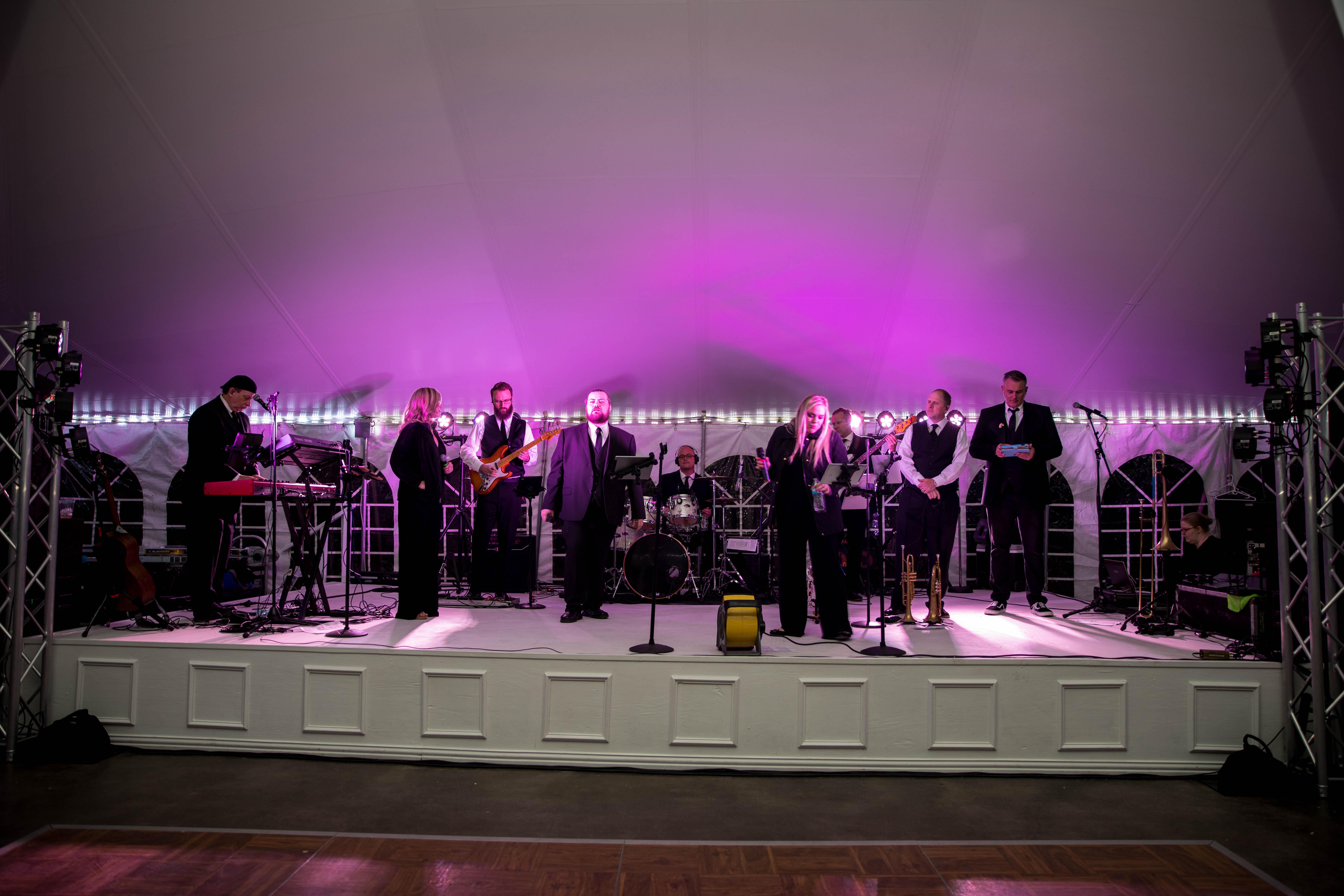 - Chandelier lighting - Stage - Bar area - Dance floor - Rope lighting - Tables - White wood garden chairs - Cocktail tables if needed for a cocktail hour