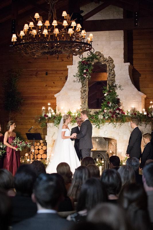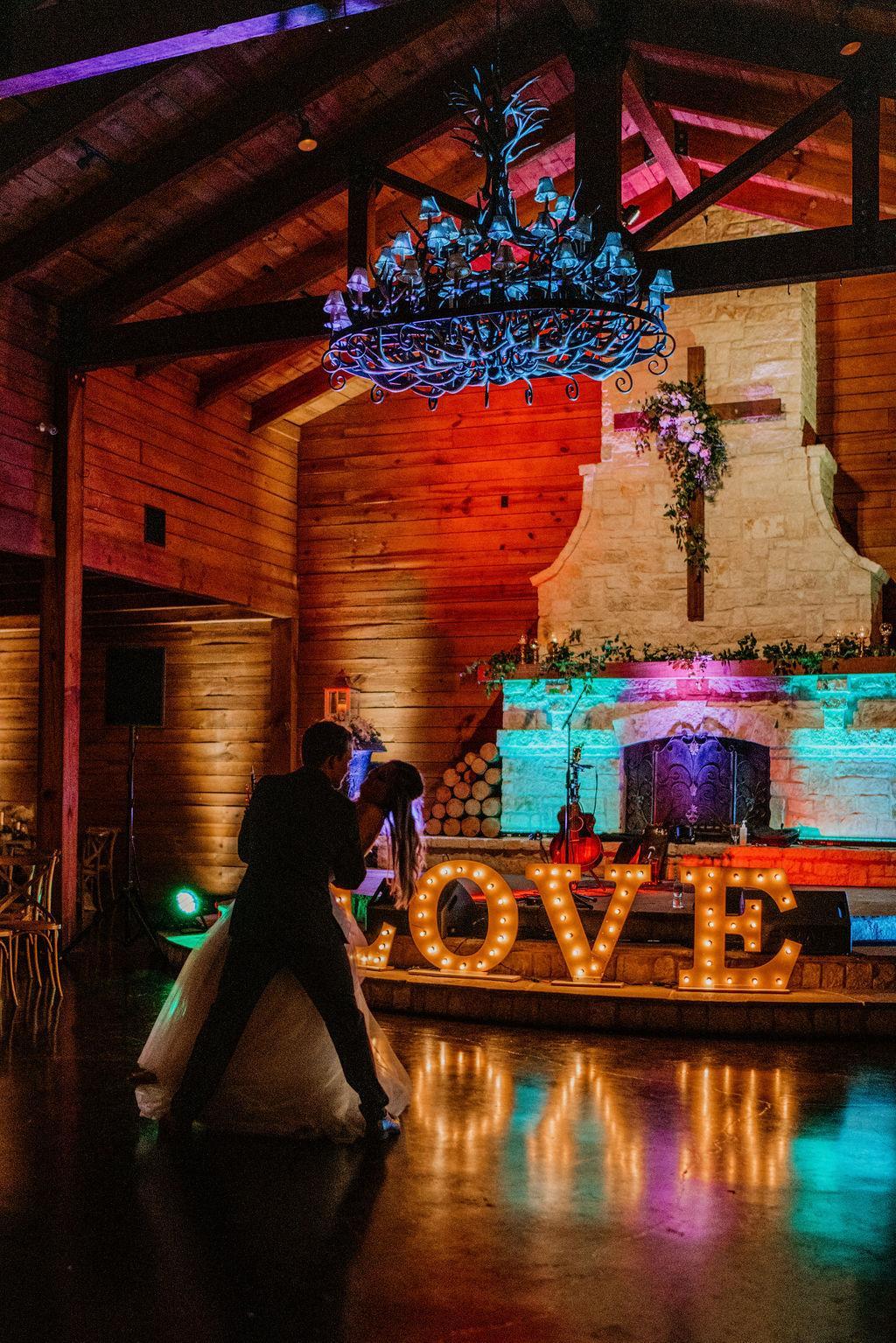- Indoor and outdoor ceremony spaces that can accommodate 300+ guests - Romantic floor to ceiling stone fireplace inside our 11,000 square foot climate controlled event barn - First Floor Private Lounge including a kitchenette, TV, games and a half bath - Second Floor 1,400 square foot private Suite featuring a fully-equipped salon and lounge, complete with a kitchenette and full bath - Grand staircase descending from bridal suite - Outdoor pavilion overlooking pasture with a built-bar – great for cocktail hour! - Rustic chic Texas decor - Groom's lounge with flat screen TV and bar - Parking lot for 100+ vehicles - Wi-fi enabled