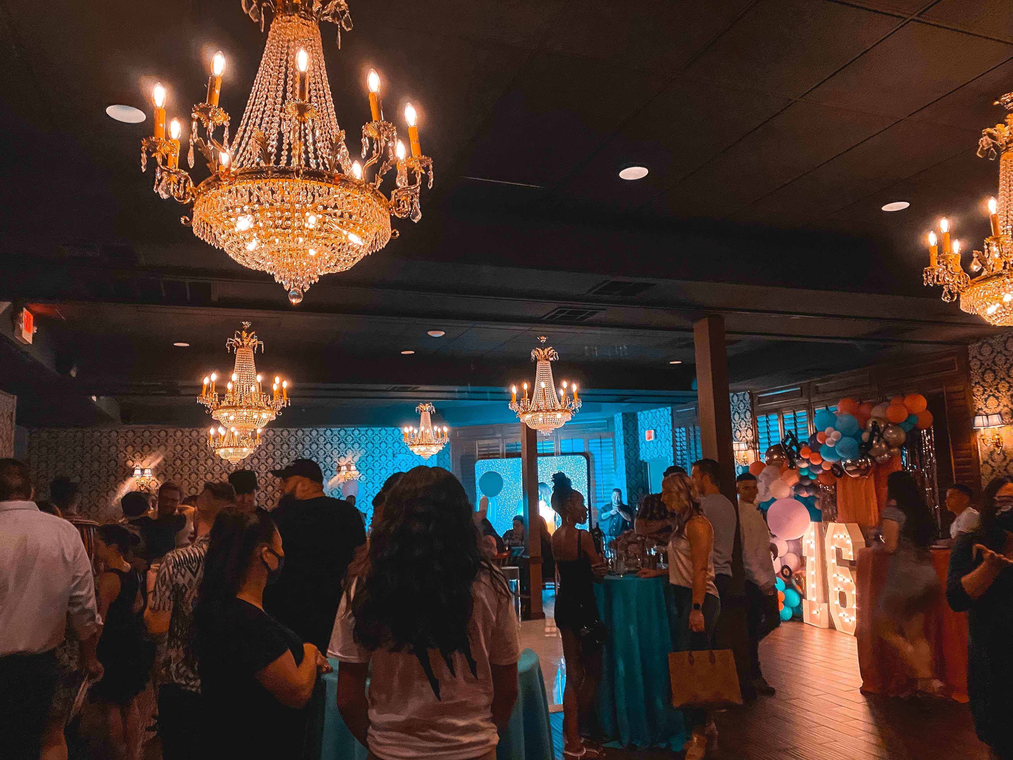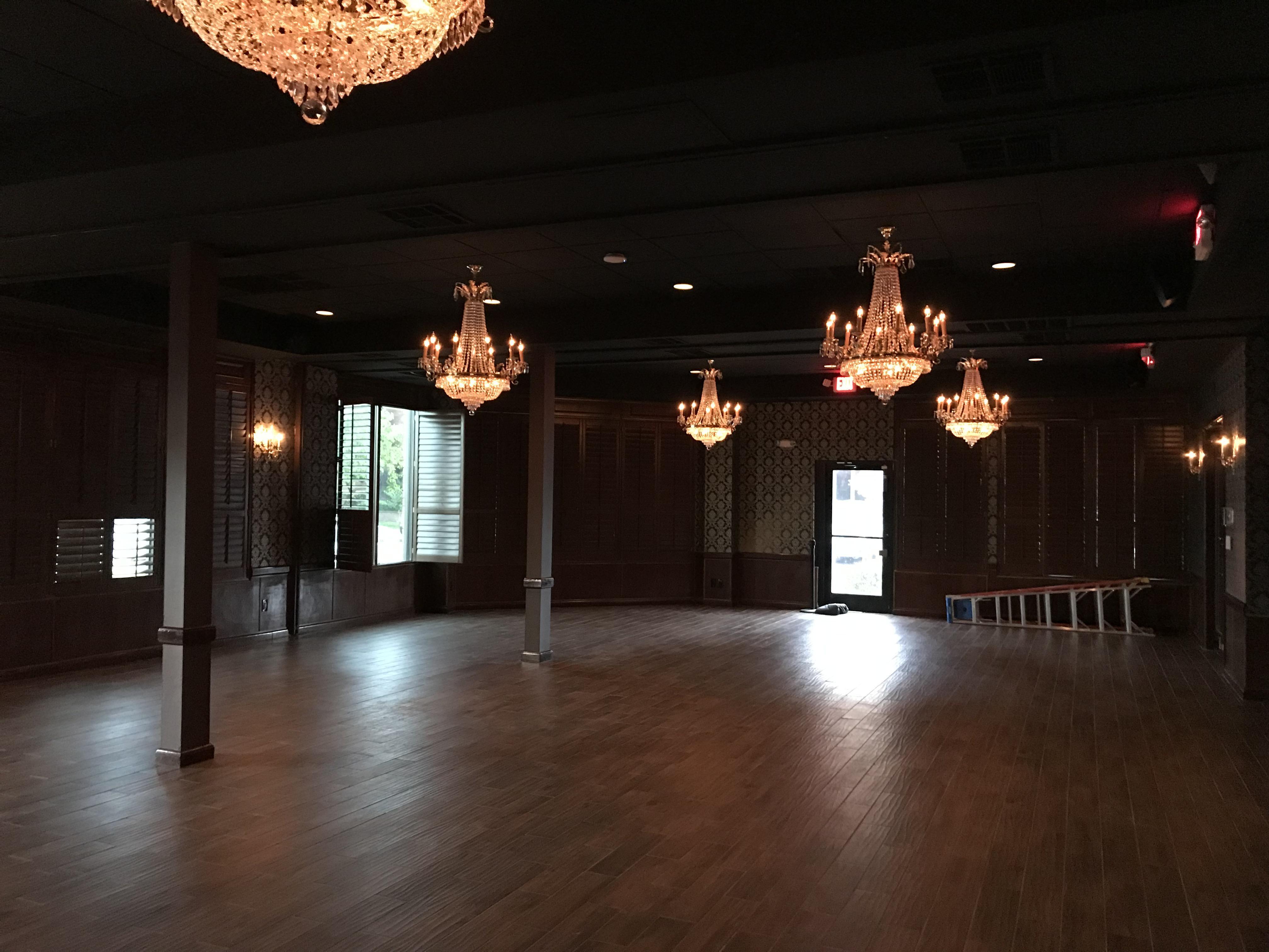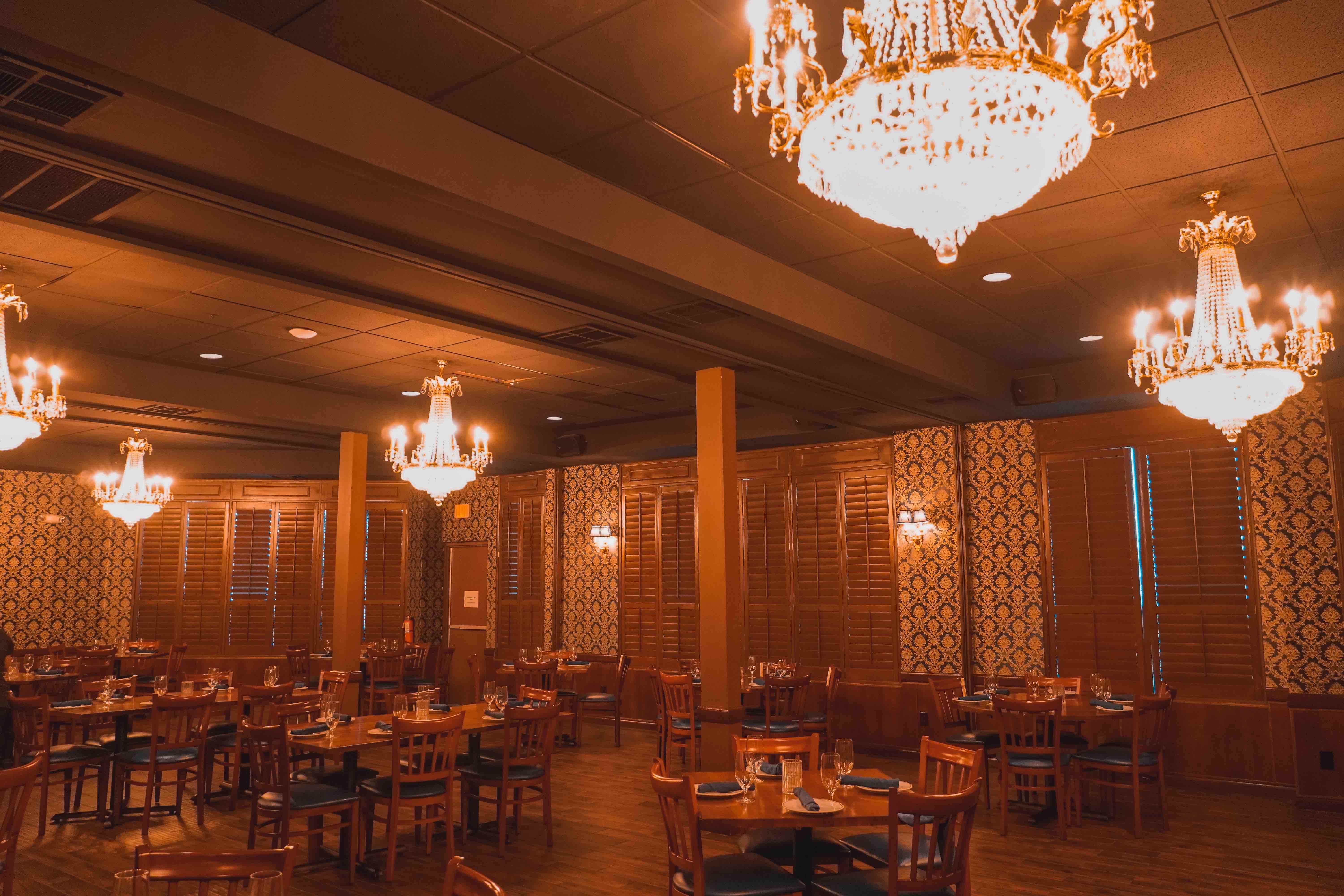 - Dimmers for customizable lighting - 6 classic chandeliers - Long, banquet-style seating or smaller modular clusters