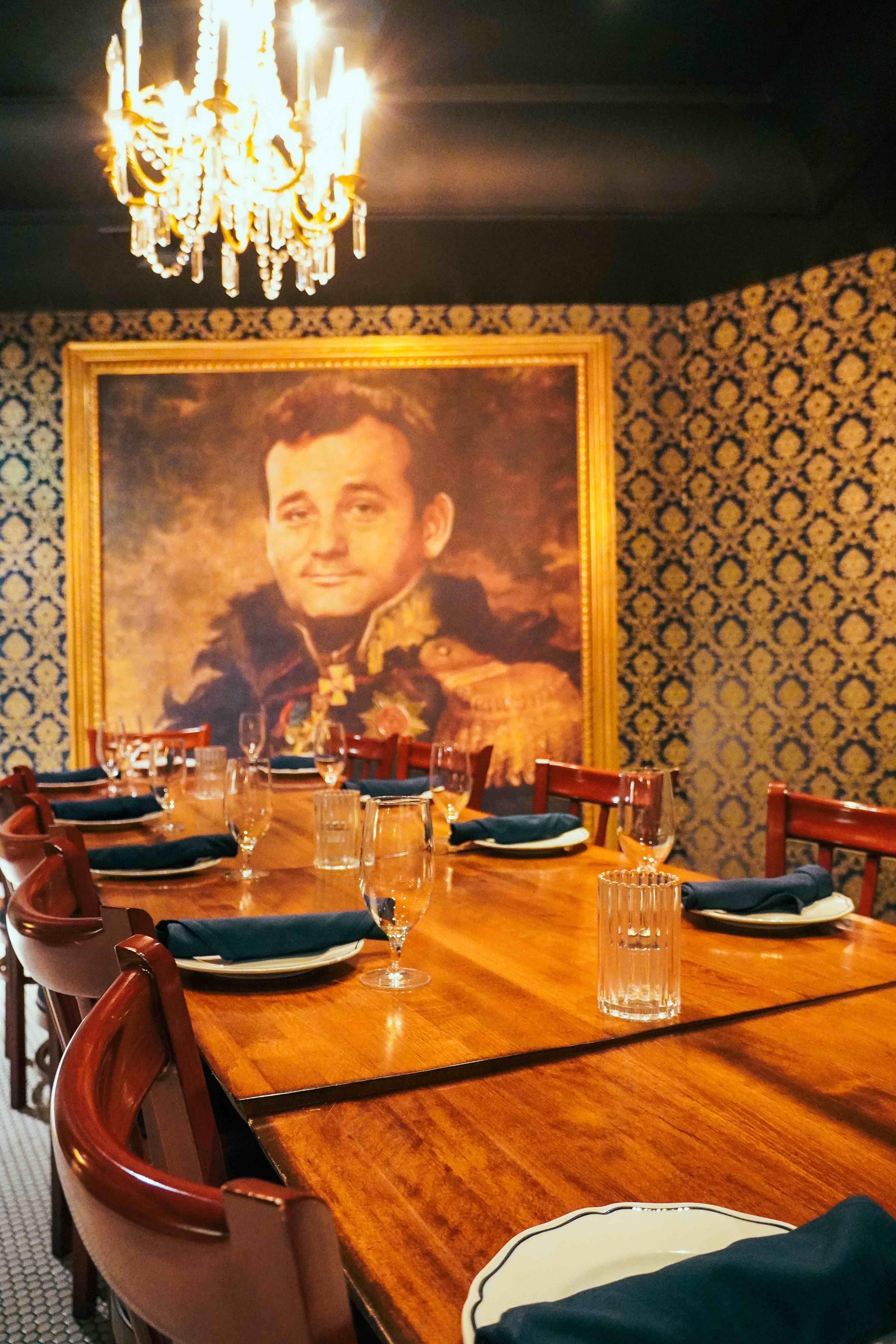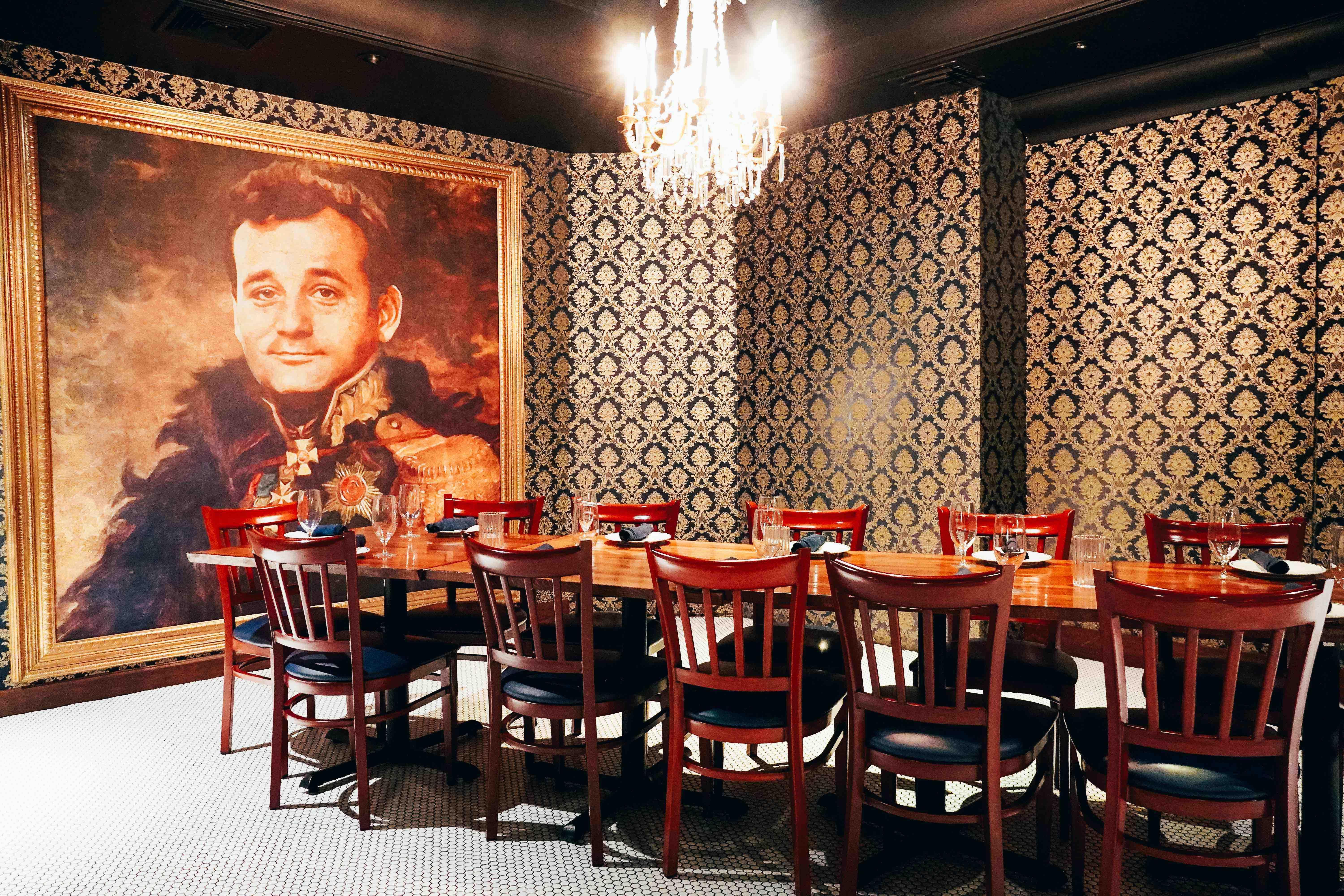 Under the watchful eye of the namesake (Bill Murray), this dining room is great for couples who want an intimate room with their loved ones. Decored with glass paneling and a chandelier, we can seat all guests on one, long table.