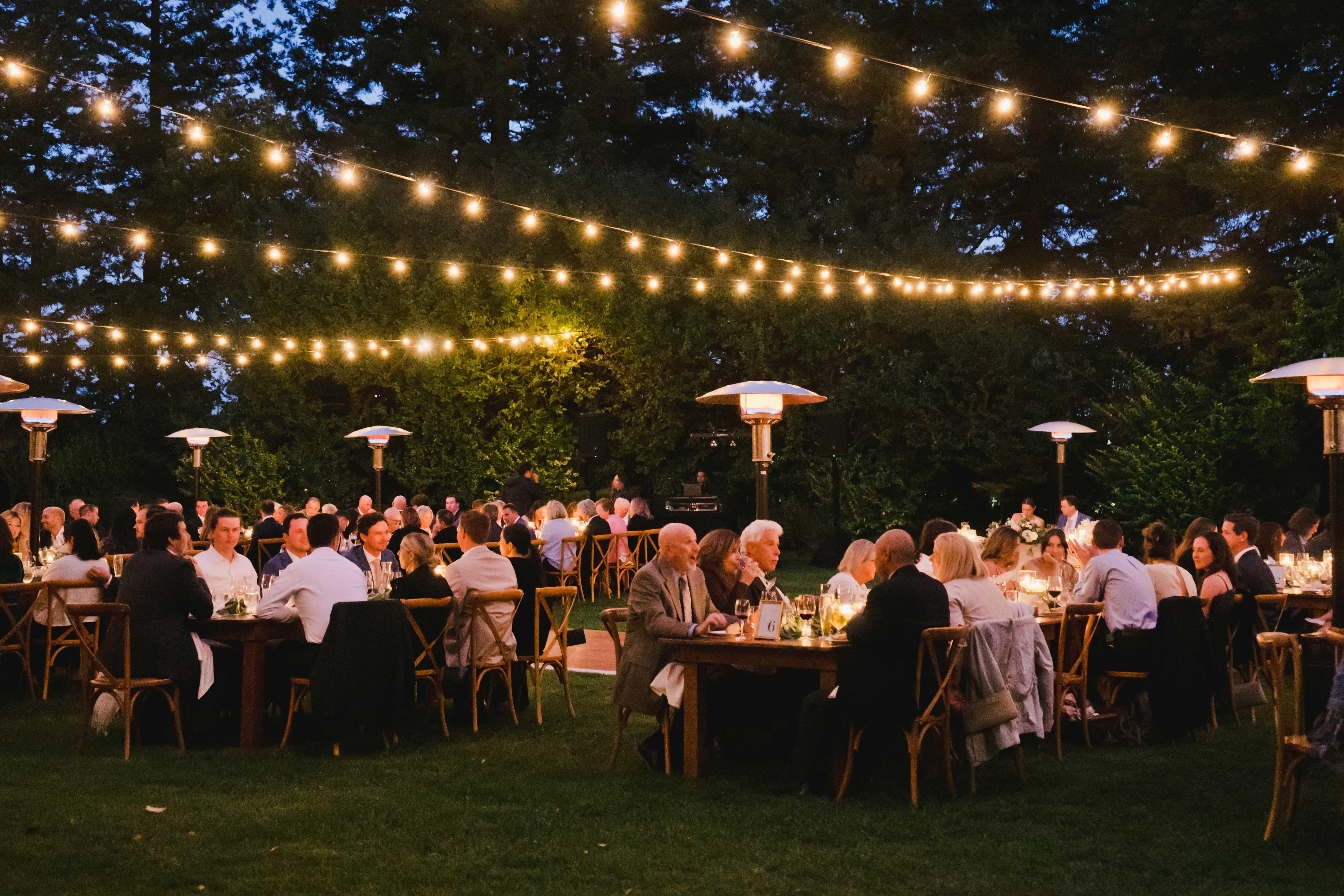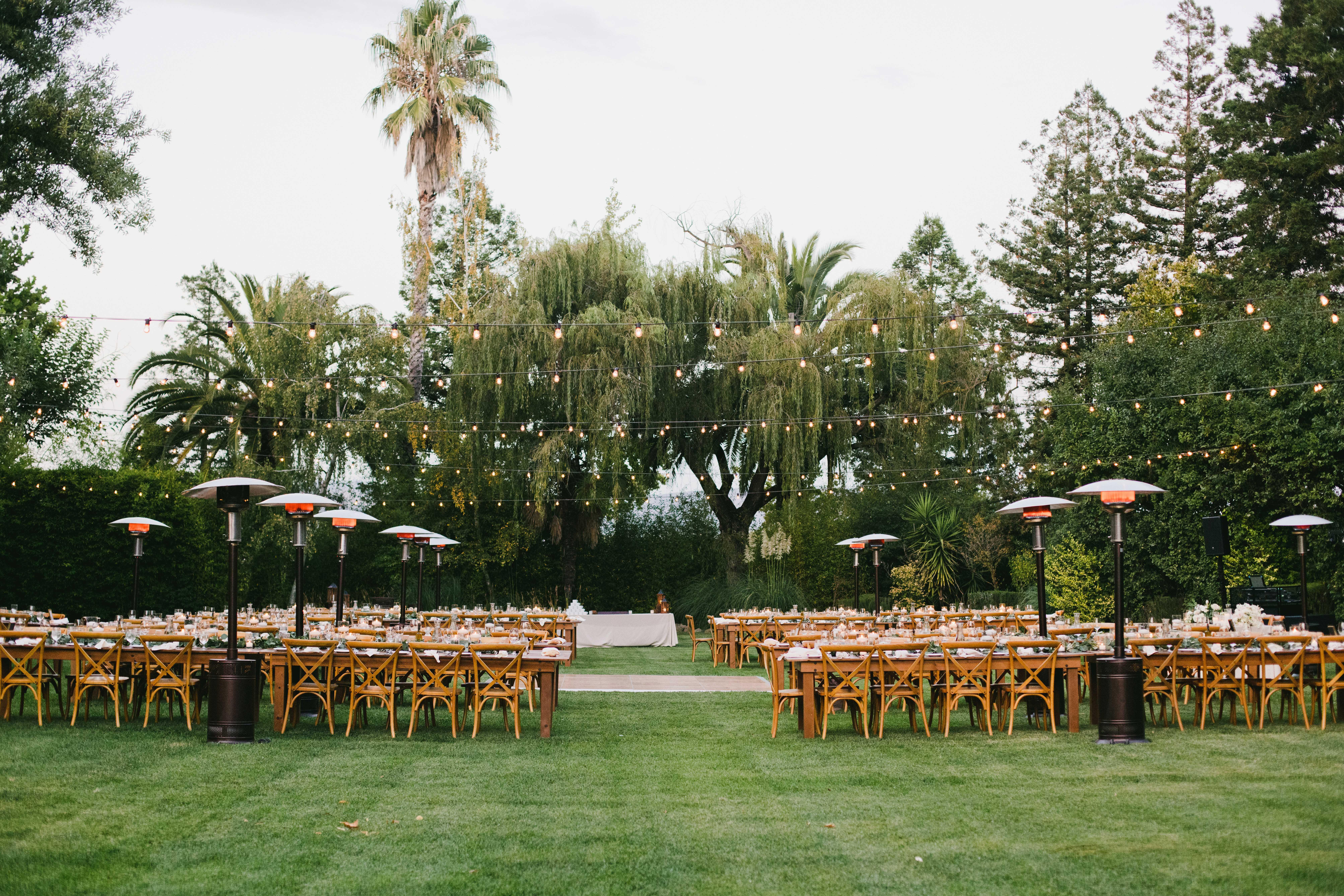 - Overhead string lighting - White folding chairs - A variety of banquet tables - Wine barrels