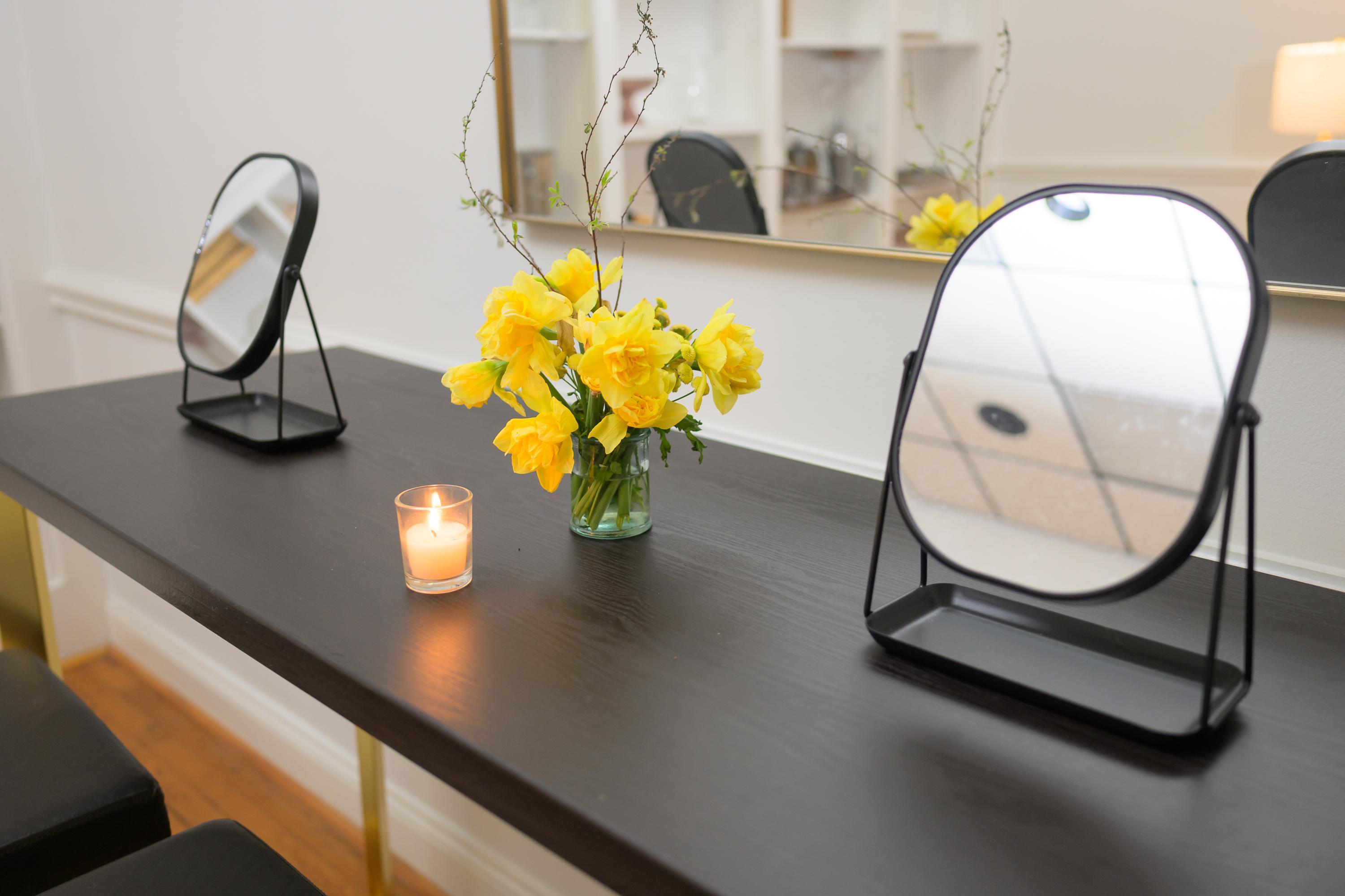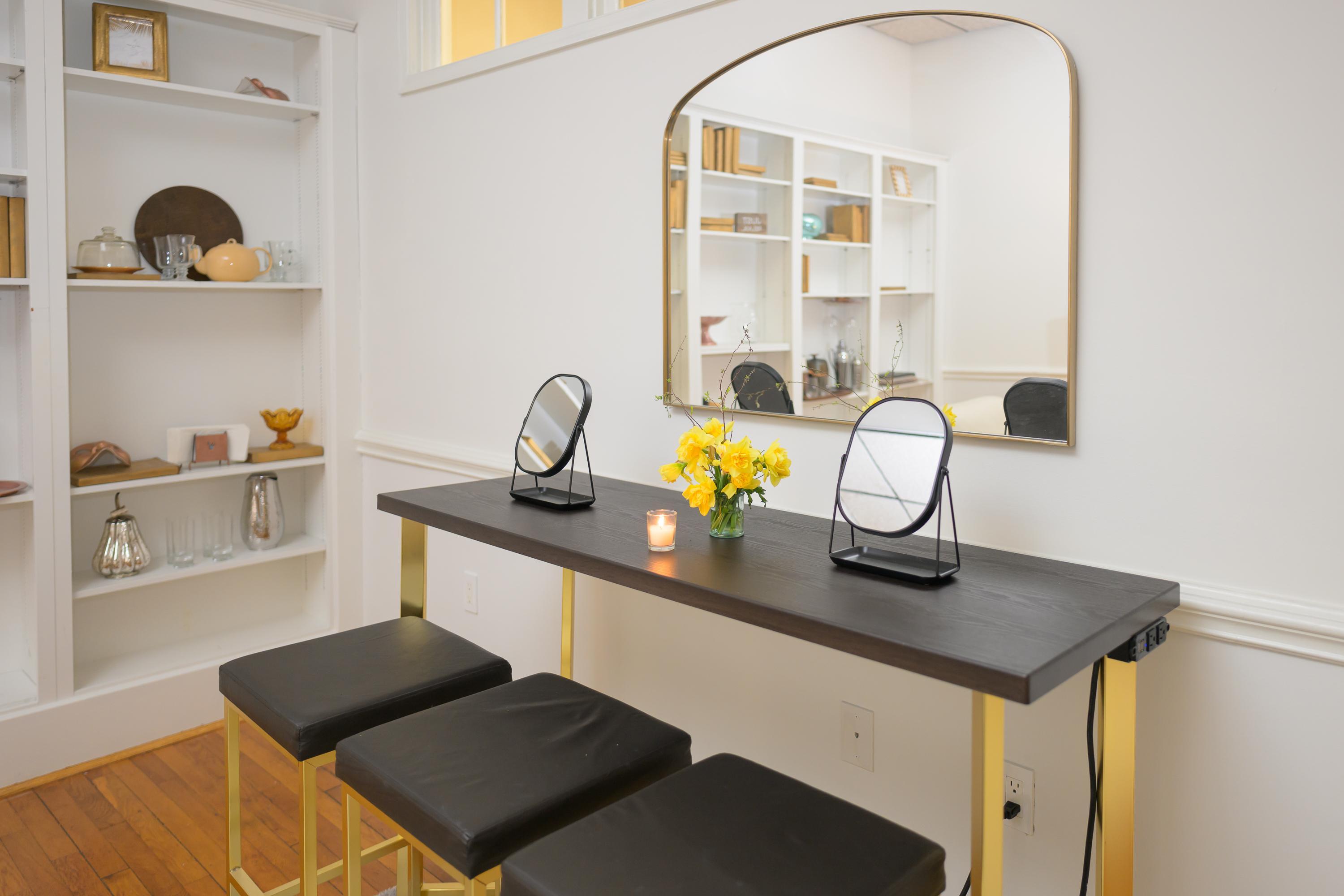 This secluded wedding suite is complete with a make-up studio, lounge furniture, and a private bathroom