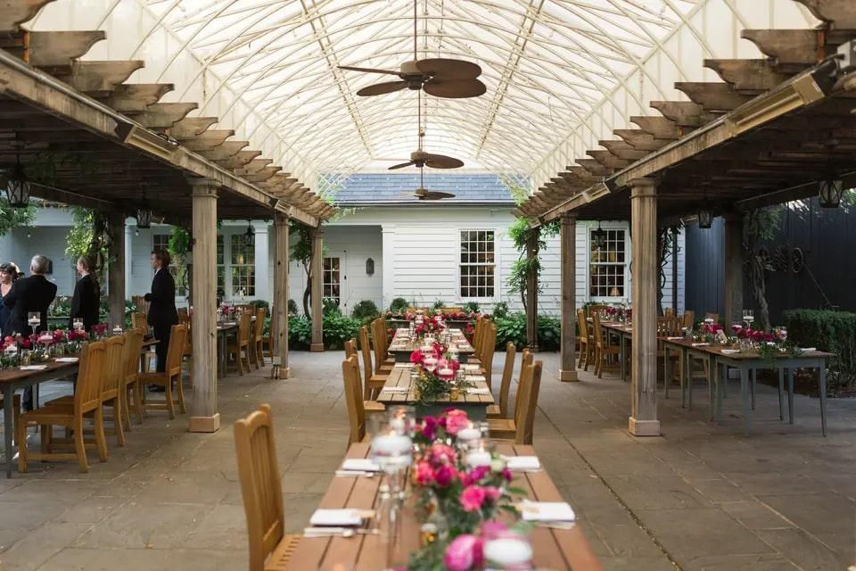 This outdoor event space features fairy string lights, overhead fans, and built in AV. With a dedicated entry and easy access to the Chandler Barn this is the perfect space for a stand alone event or to compliment your event schedule for your perfect wedding day. This space is ideal for outdoor dining, a cocktail reception, or wedding ceremonies.