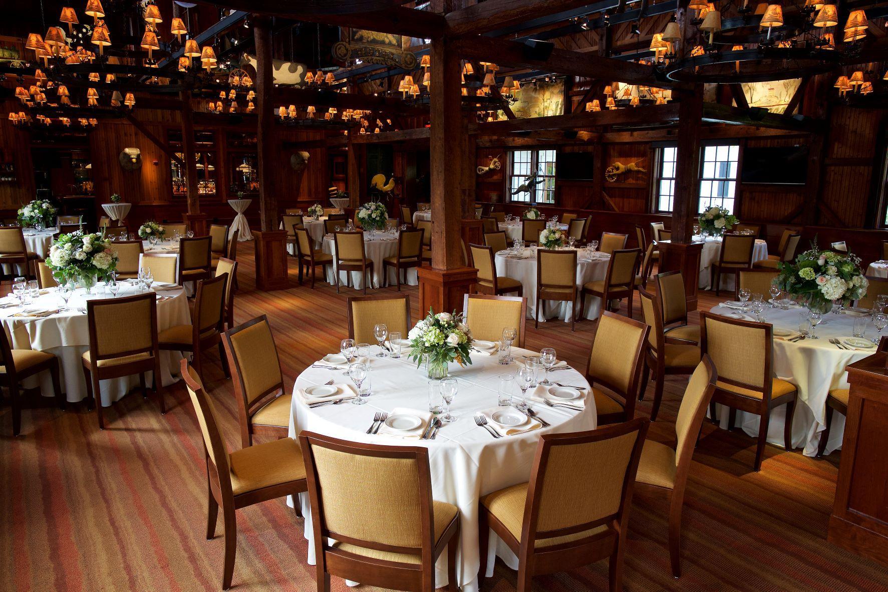 Clyde’s Willow Creek Farm is a combination of antique buildings from the 1800s that have been combined to create a restaurant featuring local cuisine in Ashburn, VA. This classic wedding venue has vintage touches that make it a truly special location for a couple’s wedding, from stone fireplaces to the wooden rafters. Couples can find this venue in Northern Virginia, a 13-minute drive from Dulles International Airport. Facilities and Capacity Up to 160 guests can join couples on their wedding day at Clyde’s Willow Creek Farm. This classy wedding venue offers several room options for a couple’s ceremony and reception. The Terrace accommodates up to 150 seated guests for a wedding reception, weather permitting. The Chandler Bar & Barn can be used as the primary or back-up plan. This space can seat up to 160 guests for a couple’s big day. More wooden beams stretch up around circular chandeliers in this antique space.