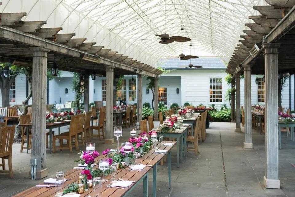 This stunning outdoor terrace is sure to delight your guests, featuring a pond and fountain this space comes alive throughout the seasons with bursting florals and views of autumn leaves.