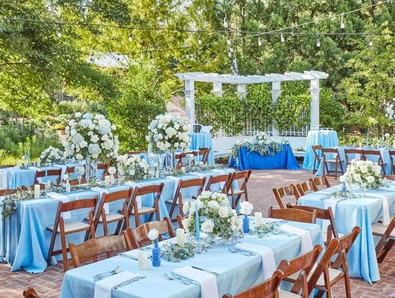 Facilities and Capacities Farmhouse Lawn: One-acre lawn, offering scenic views and beautiful surroundings, accommodates up to 250 guests. Farmhouse: Our Farmhouse can accommodate up to 98 guests. Brick Patio: Our beloved brick patio accommodates ceremonies of up to 175 and receptions of up to 75. Rose Garden: Our Mothers’ Rose Garden accommodates up to 150 guests. Camellia Garden: An intimate, stunning garden. Ideal for up to 30 guests. In addition to our versatile outdoor and indoor space, majority of our packages offer many essentials - linens, audio equipment, furniture, tables, chairs, lighting, tents and many service amenities.