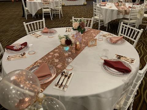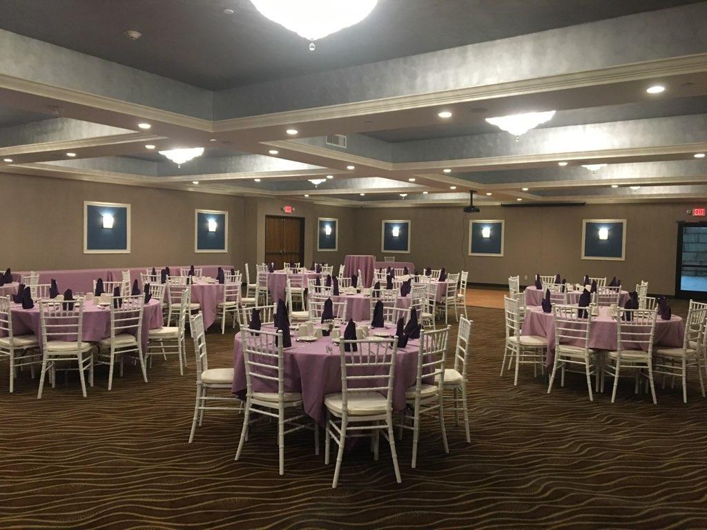 This space features beautiful chandelier light fixtures throughout. It is carpeted but with plenty of room to get a rented wooden dance floor. We have a projector and sound system available for use and your DJ/entertainment systems can set-up anywhere there are outlets. This is a must-see venue, the space speaks for itself.