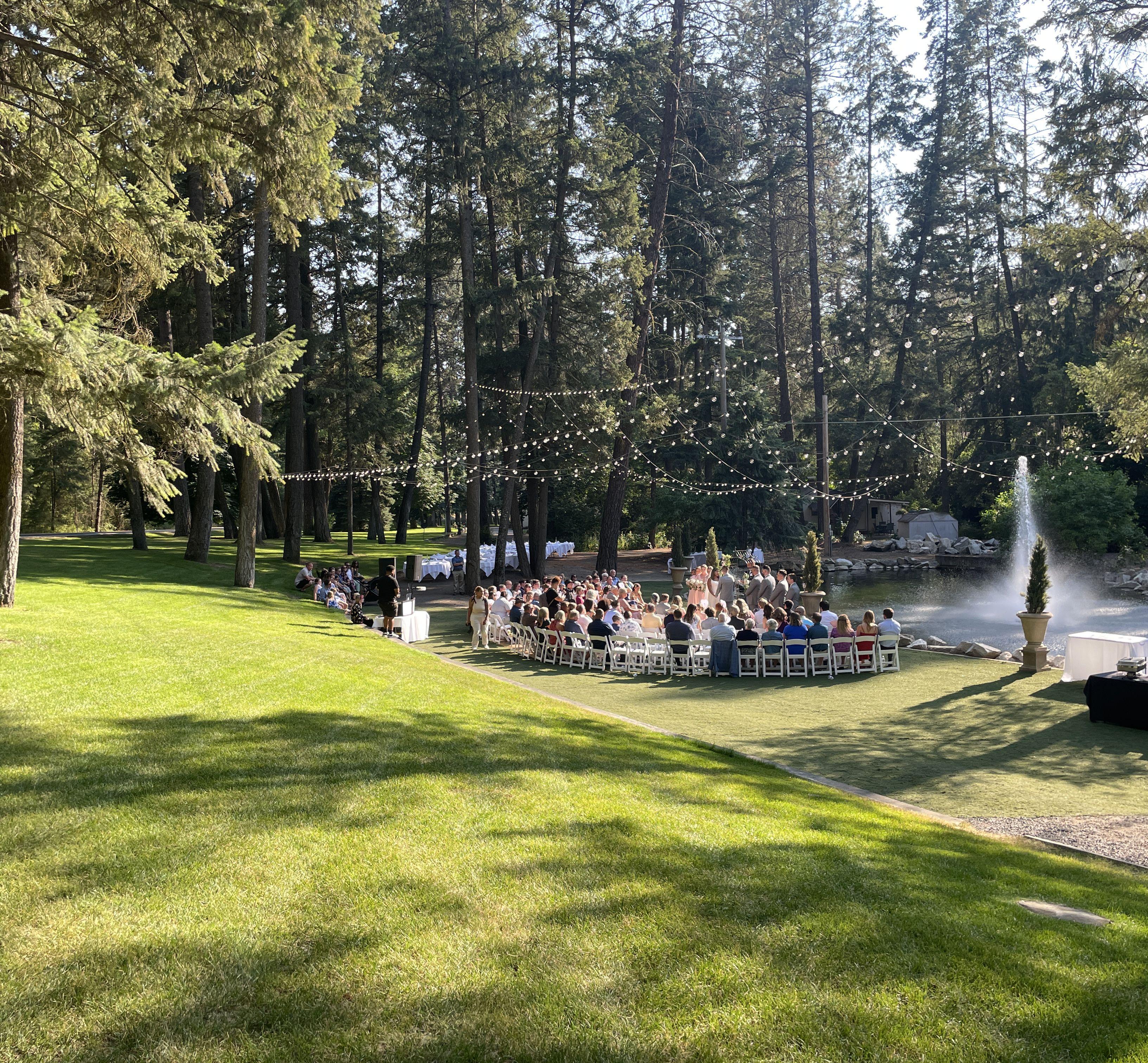 Have your event along our pond and acres of manicured grass and pine trees. This is our largest location and can hold parties up to 300 people for ceremonies and receptions. The pots surrounding the pond hold 4' cedar trees during peak season.