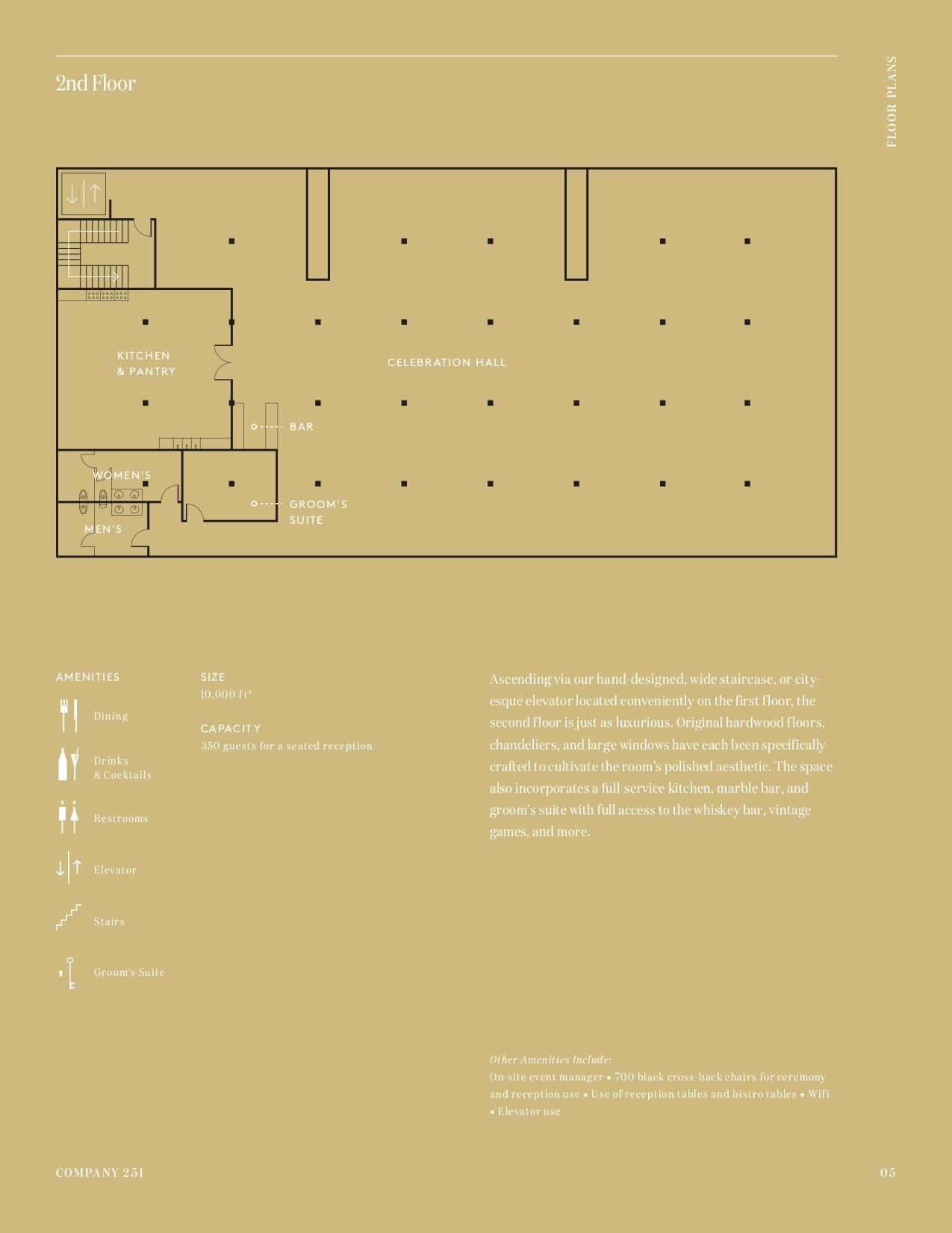 On the second floor you will have introductions, speeches, toasts, and dinner service. Your DJ will set up a secondary sound system here to provide the sound for those traditions + the transitions from floor to floor.