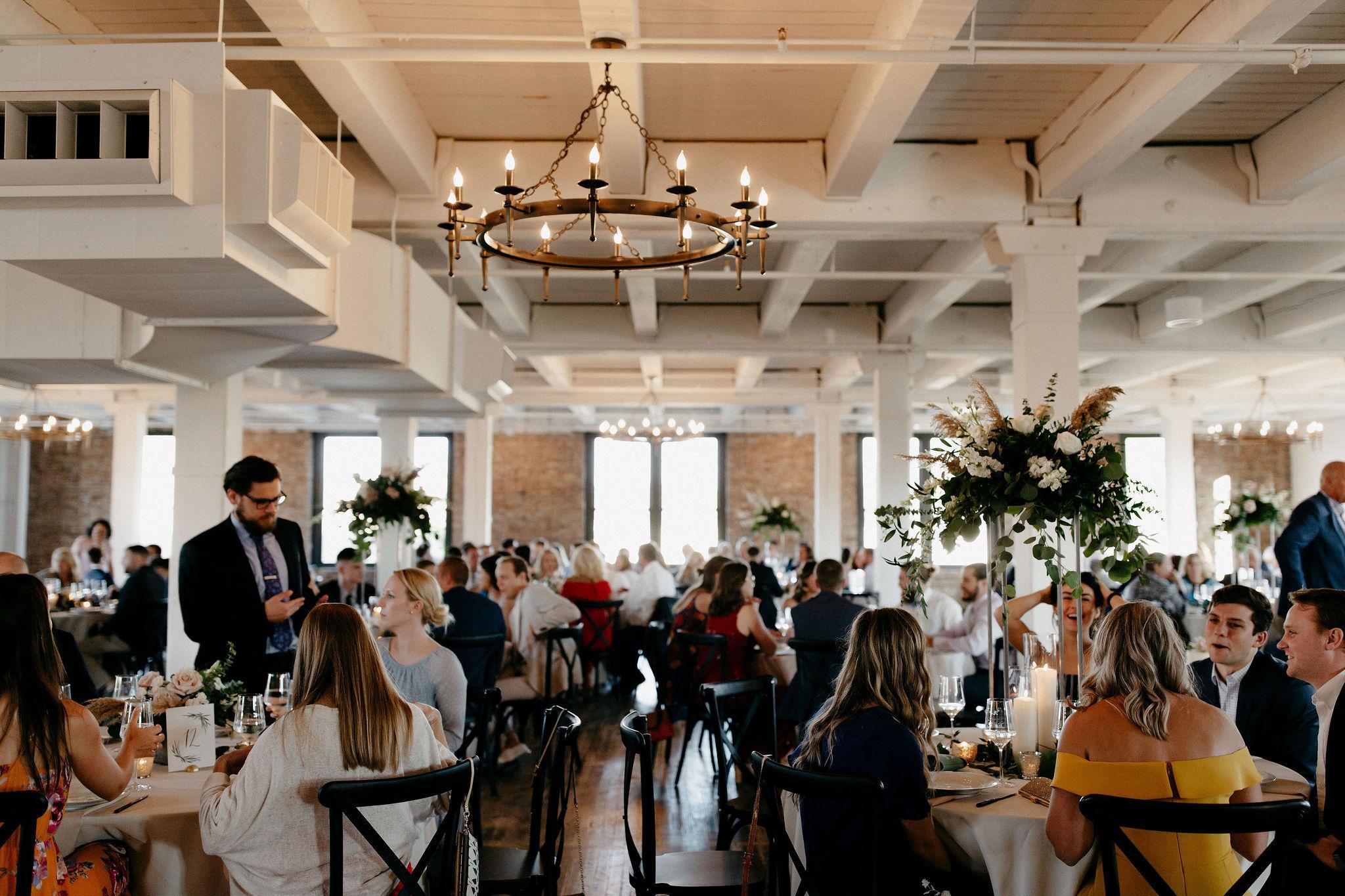 Begin your big day with a ceremony + cocktail hour on our first floor. While you are upstairs on the second floor for dinner, we take care of flipping that first floor into your dancing portion. Whenever you are on floor one, notice our garage door leading to our outdoor patio.