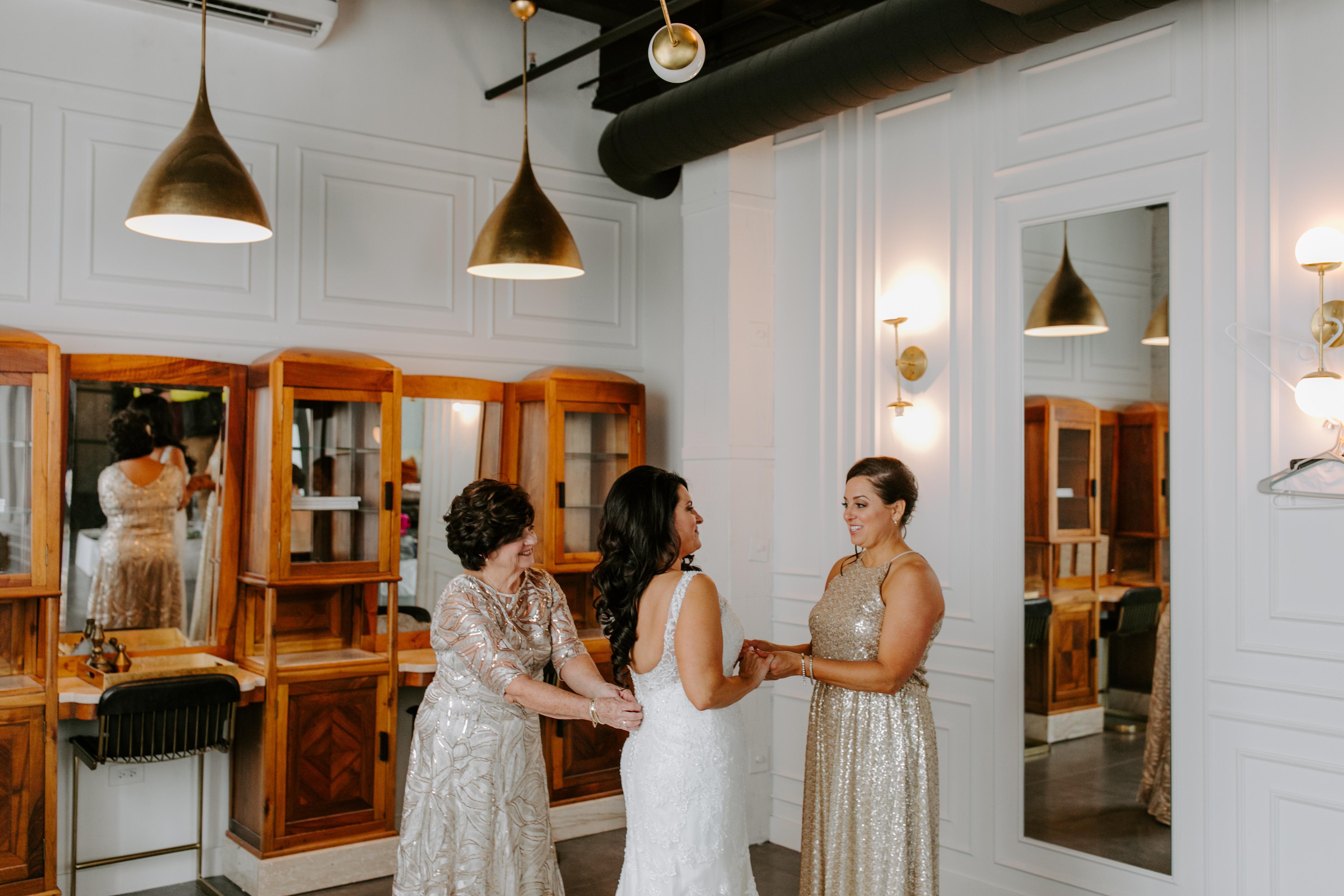 Private bridal suite featuring an antique wood and marble 3 chair barber shop cabinet imported from Italy for entire bridal party to get ready together