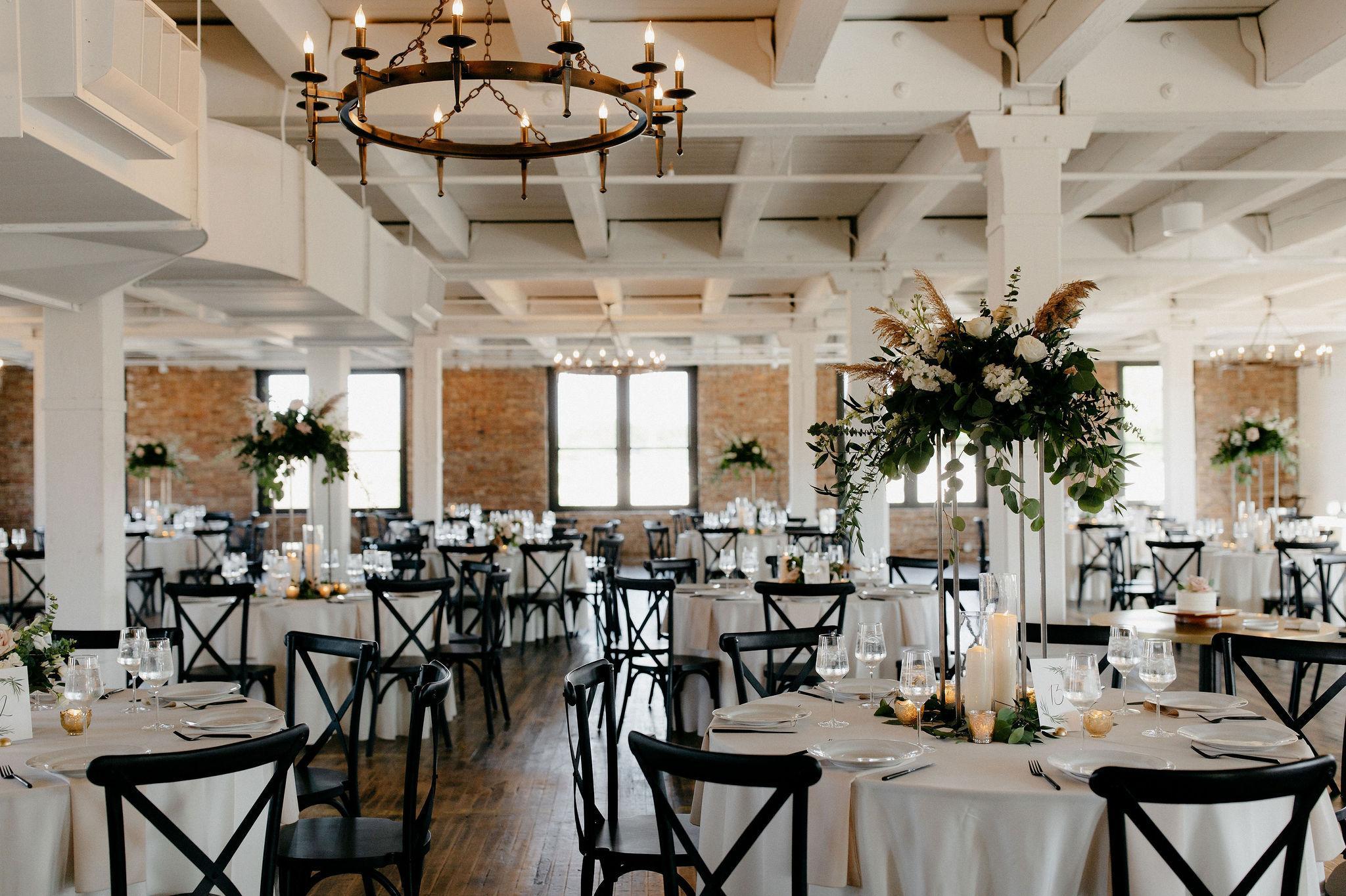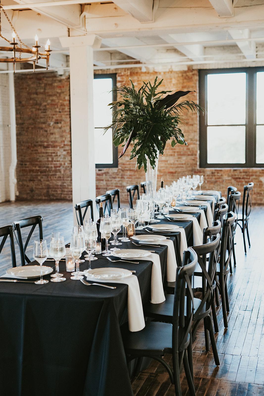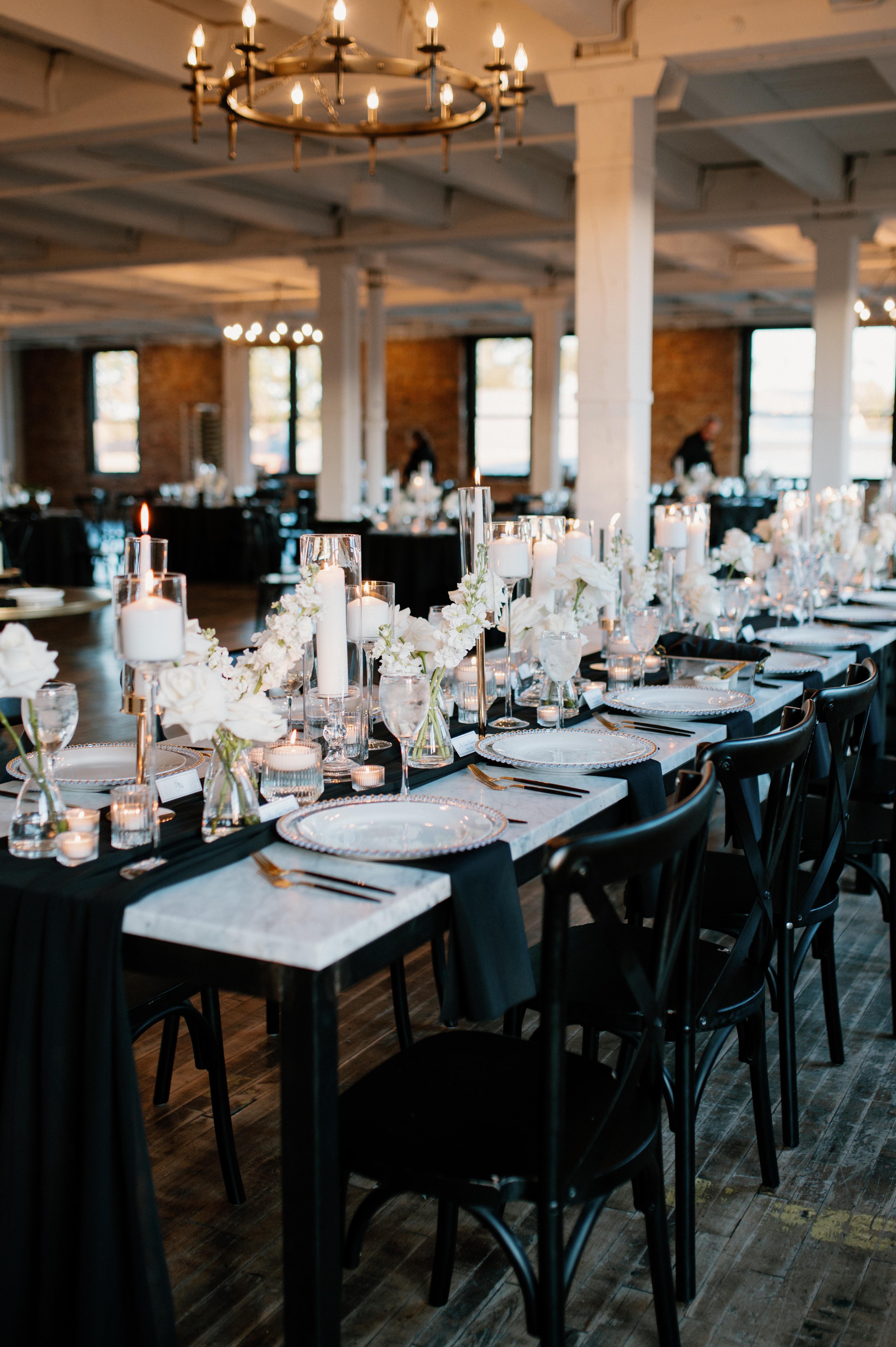 -Cross back black chairs -60" round dinner tables -Black, white, or ivory table linen -Various napkin colors -Per guest: black + gold flatware, white dinner plate + water glass -Tablescape enhancements available