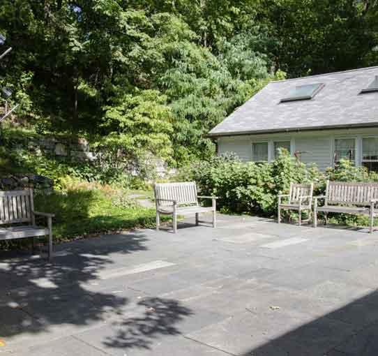 The Loring Coleman Room is used as a classroom and art studio. It is 24 x 24 feet and overlooks our bluestone patio, sculptures, lush plantings and trees, an ancient stone wall and a lovely waterfall. It is good for a small party, class or conference.