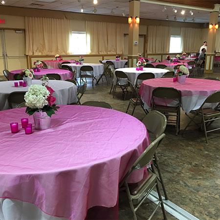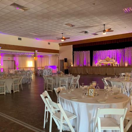 Entering the Hall, guests walk through our main lobby, featuring a large coat room and areas for items such as your guestbook, gift table, or picture displays. In the Main Hall, tables and chairs are pre-set by our event staff, according to the floor plan you arrange with our Wedding Coordinator prior to your Wedding Day. There are plenty of round tables and rectangular tables available for use, as well as chairs, at no extra cost. We also welcome Brides and Grooms to use furniture, décor, and other items from outside rental companies to help bring their Wedding Day vision to life!