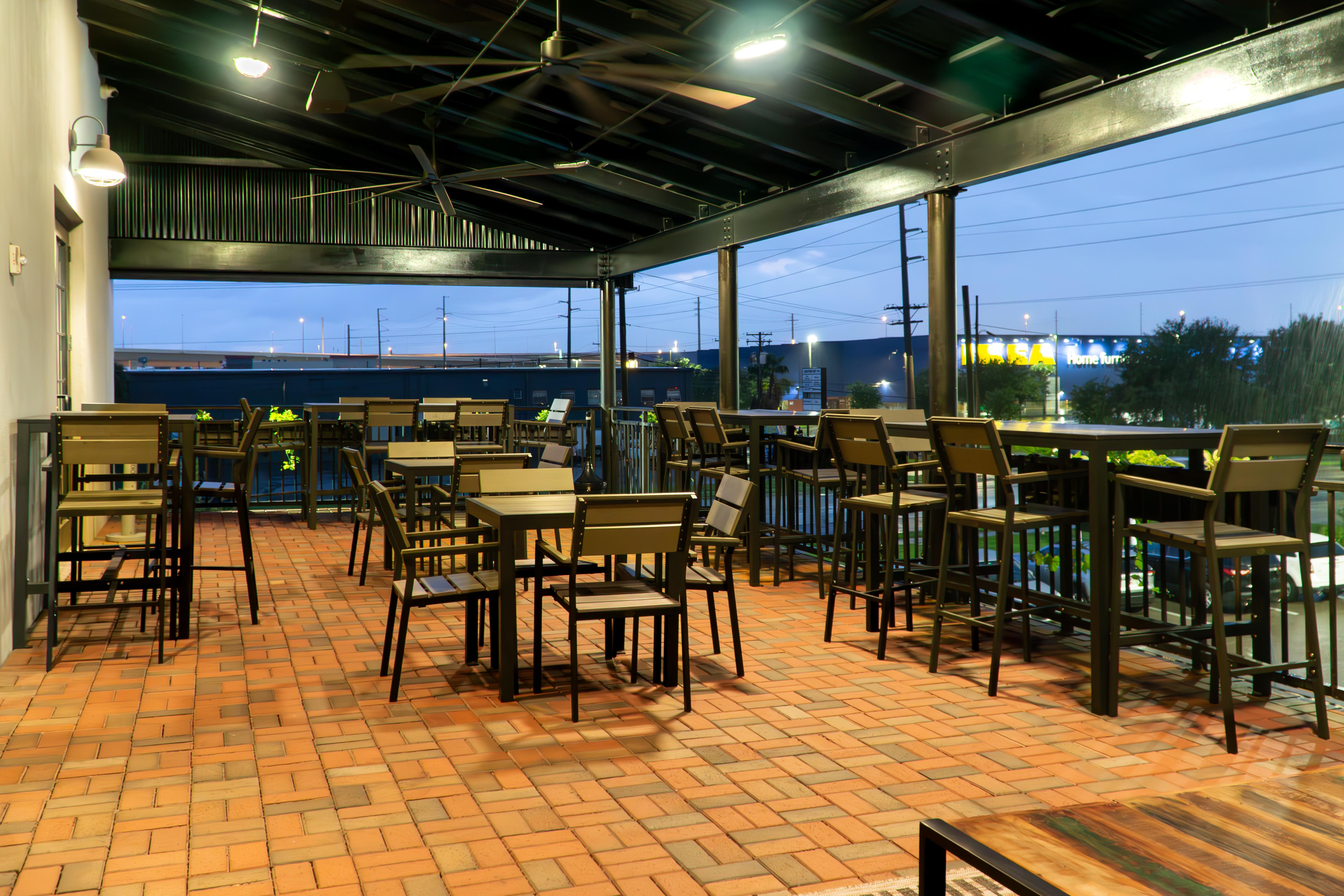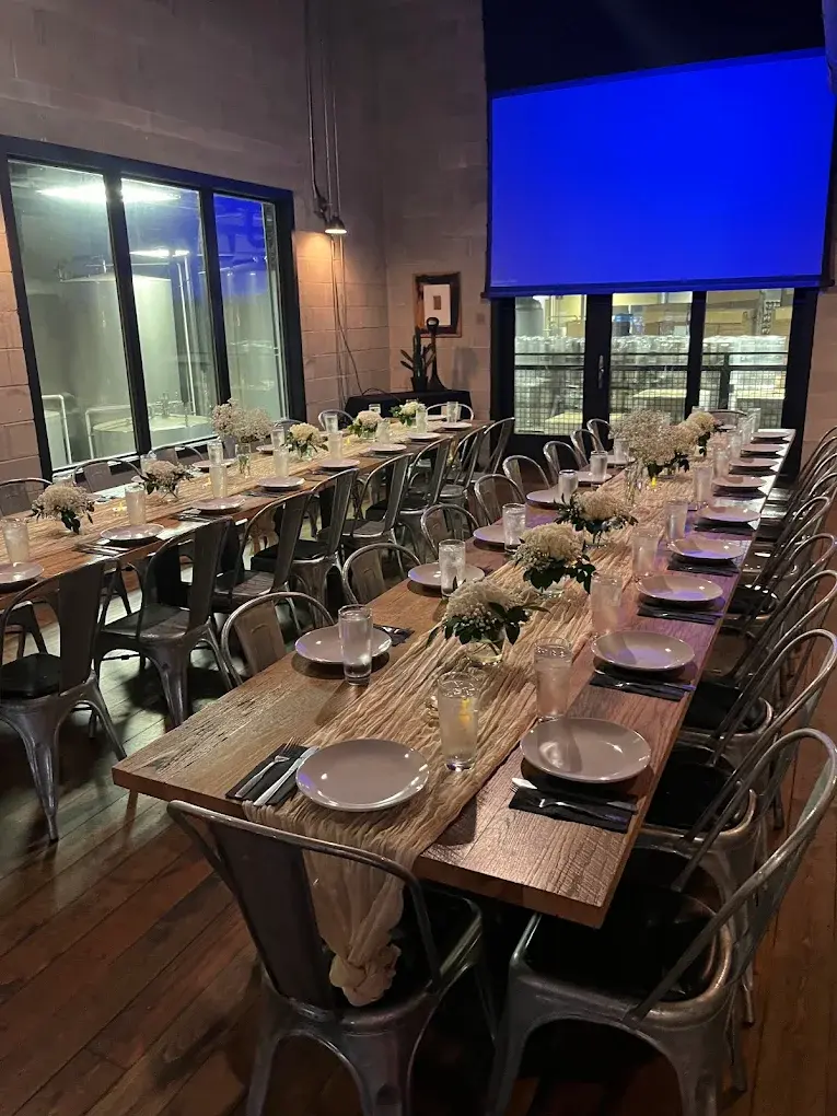 Our event loft is a contemporary and industrial space situated above our main tasting room, minutes from Downtown Tampa located in Ybor City. Features & Aesthetics: Blend of contemporary + industrial design, private marble-countertop bar, wooden farm-style tables, exposed railings + ductwork ceiling, expansive balcony, views into the actual brewery, private restrooms, free parking, elevator + stair access, built-in projection screen.