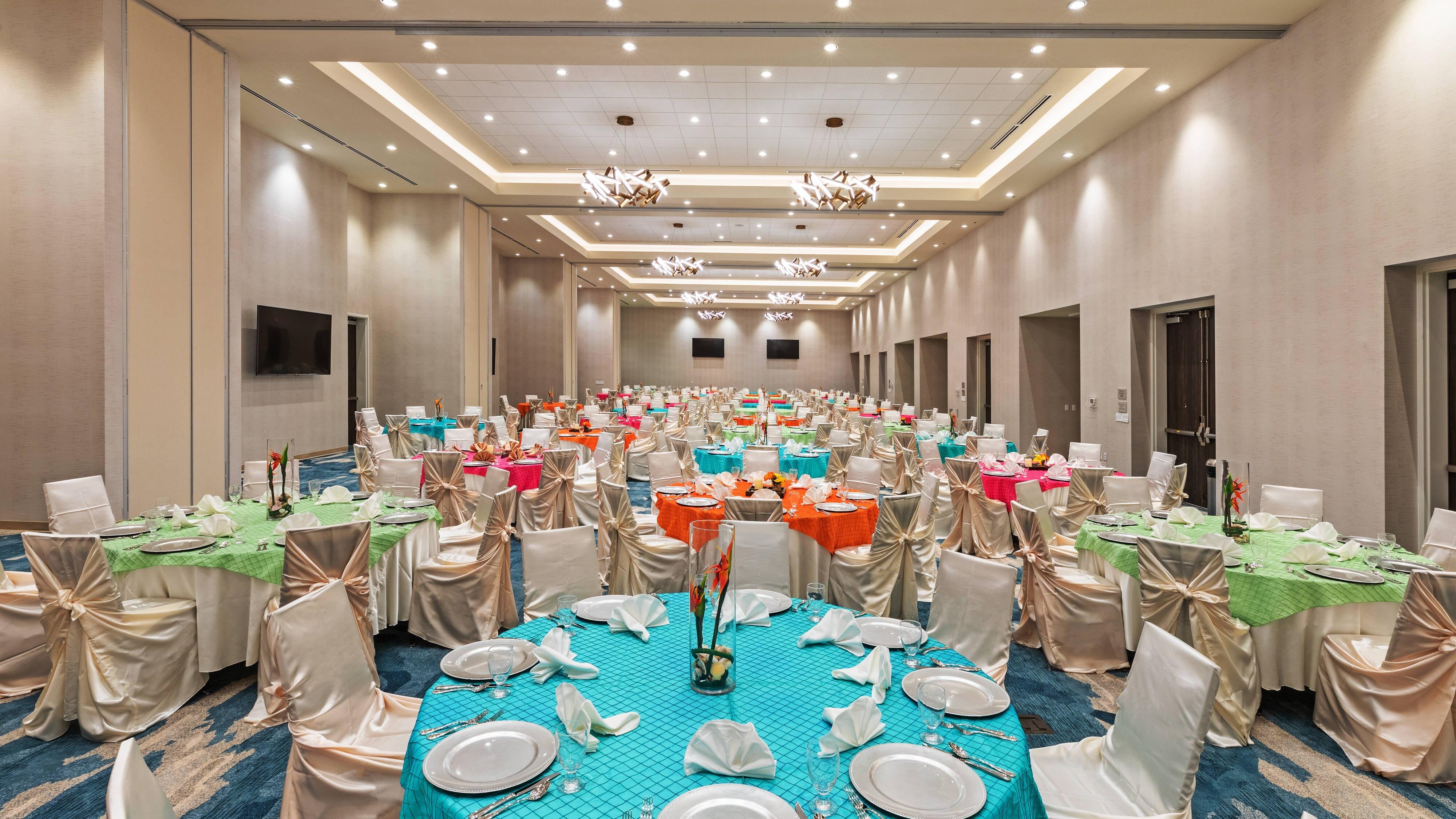 The Courtyard by Marriott South Padre Island offers a total of 8,669 square feet of flexible event space, perfect for hosting a variety of wedding-related celebrations. • Grand Ballroom (Largest Space): Our largest venue can accommodate up to 150 guests, making it ideal for a full reception or banquet. The space is bright and versatile, ready to be transformed with decor like colorful linens and elegant table settings to match your wedding vision. • Flexible Meeting Rooms: We offer smaller, contemporary meeting rooms perfect for intimate gatherings, like a rehearsal dinner or a morning-after brunch. These rooms feature modern lighting fixtures, stylish carpeting, and versatile layouts (such as U-shape or classroom style), ensuring a sophisticated yet comfortable environment for your closest friends and family.
